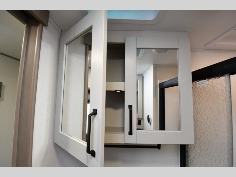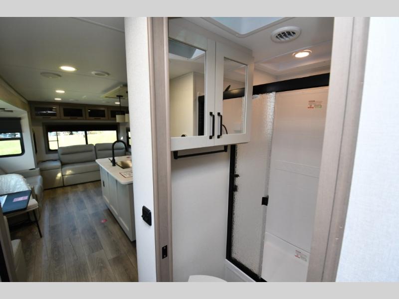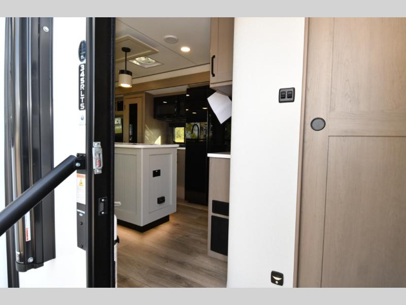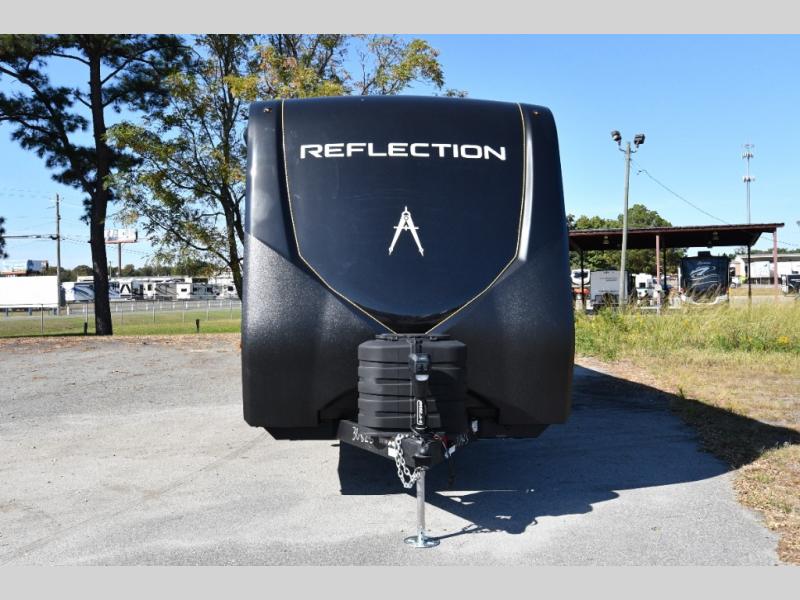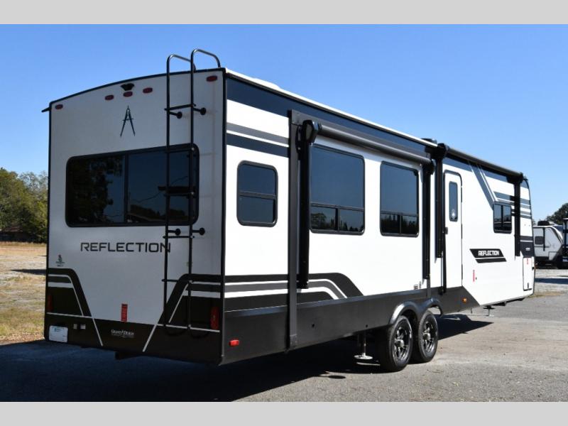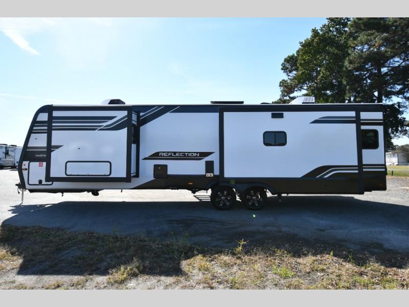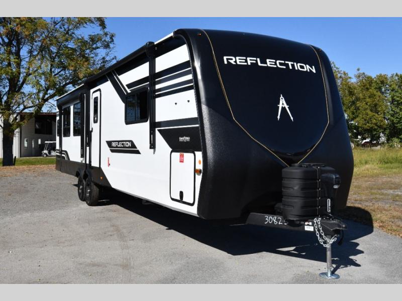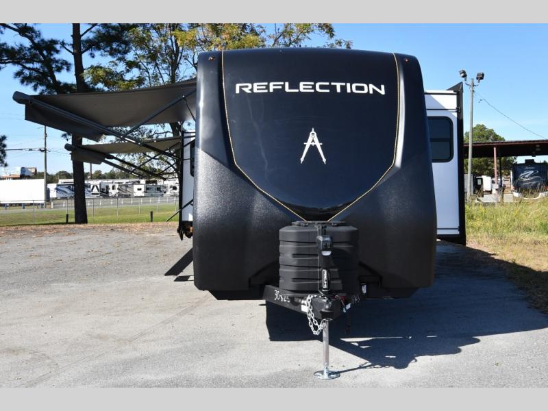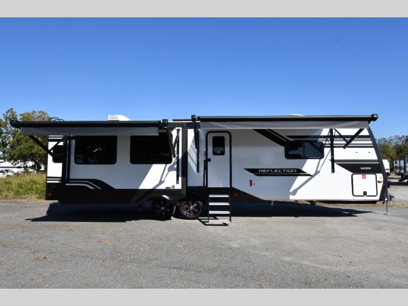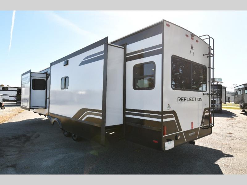 Built for durability and off-grid capability, the 345RLTS features a 370W solar panel upgrade, 60-amp charge controller, inverter prep, and dual power awnings for outdoor living. Goodyear tires, ABS axle assembly with sway control, and an automatic leveling system ensure smooth and stable towing. Constructed with gel coat exterior sidewalls, 5" truss rafters, walk-on roof decking, laminated aluminum-framed slide rooms, and radiant foil insulation, this Reflection is built to last. Inside, enjoy residential hardwood cabinetry, premium Congoleum flooring, and a spacious shower with a glass door for added comfort and style.