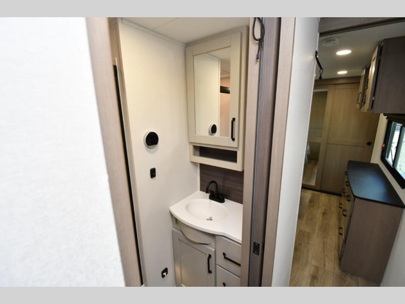 The Reflection 345RLTS rear living travel trailer is designed for comfort, convenience, and extended adventures. Relax on the rear tri-fold sofa with adjustable headrests or theater seating across from the 40" TV and fireplace, or enjoy meals at the swivel dinette with two chairs and storage ottoman. The spacious kitchen island makes meal prep easy, complemented by a pantry and 16 cu. ft. 12V refrigerator for ample food storage. A full bath near the front private bedroom adds convenience, while the king bed slide, large closet, TV prep, and washer/dryer prep make this space a true retreat for nights at the campground.