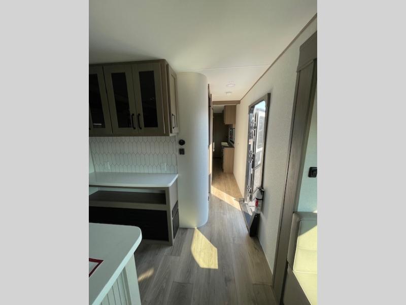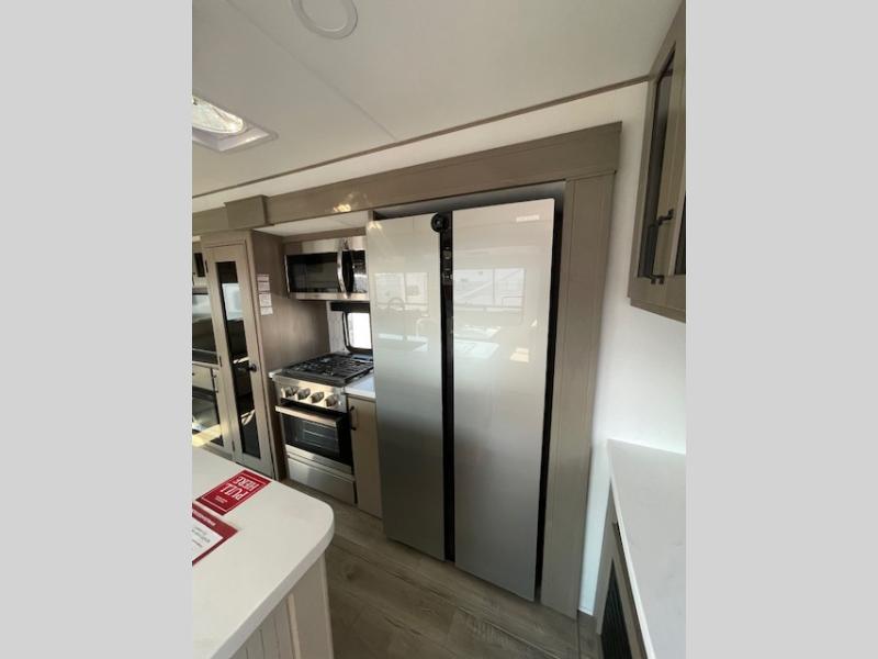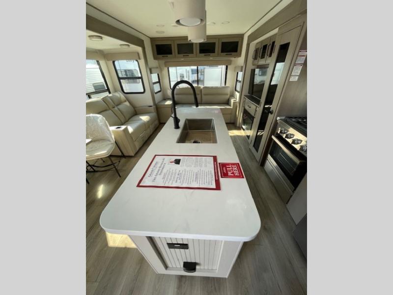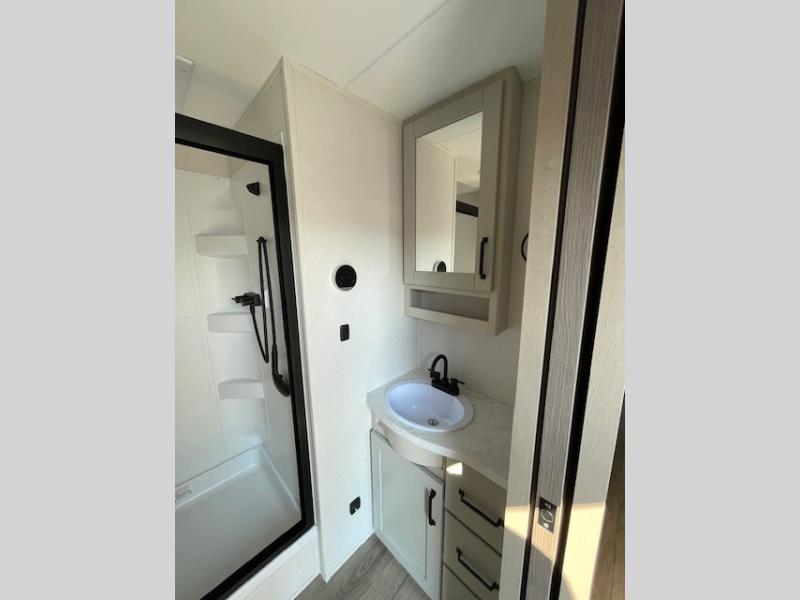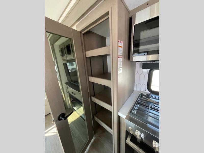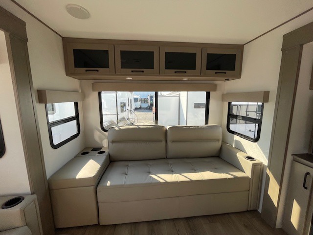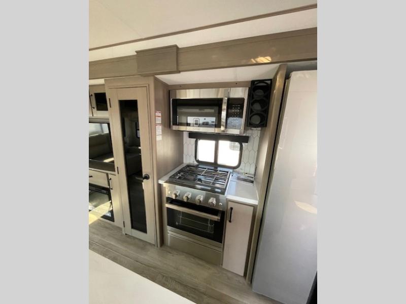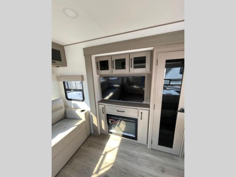 This rear living travel trailer will be perfect for extended stays at the campground or quick weekend trips to the lake! Once you've unloaded your gear from the pass-thru storage, head inside to relax on the rear tri-fold sofa with an adjustable headrest or on the theater seating across from the 40" TV and fireplace. There is also a booth dinette where you can dine together, or you can choose the optional swivel dinette. The spacious kitchen island will make meal time easier than ever, plus there is a pantry and 16 cu. ft. 12V refrigerator for food storage. The full bath is right next to the front private bedroom for easy nighttime use, and speaking of nighttime, you're sure to sleep soundly on the queen bed slide. There is also a large front closet, TV prep, plus washer and dryer prep if you choose to add these appliances.