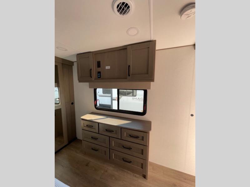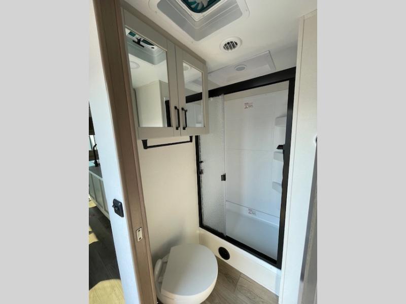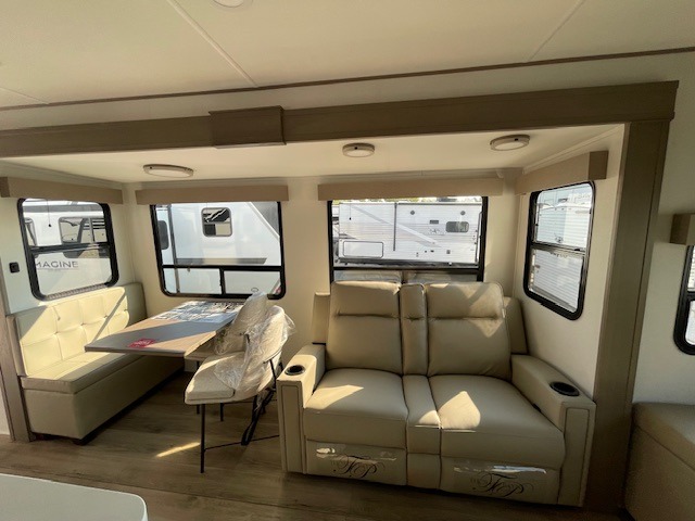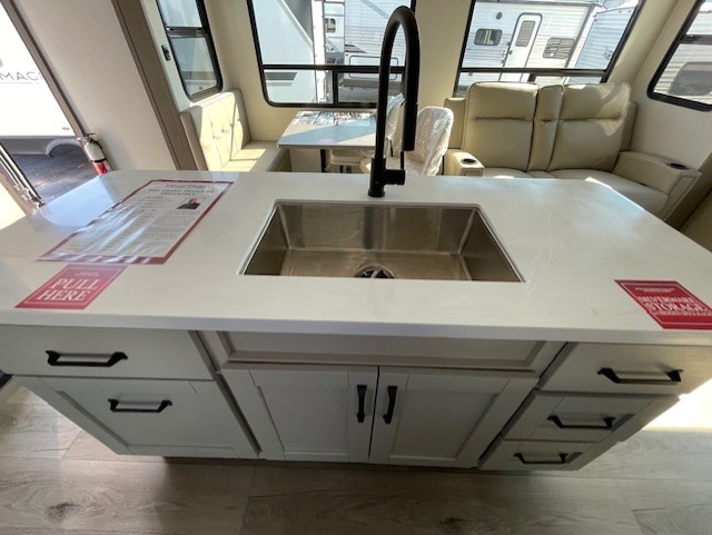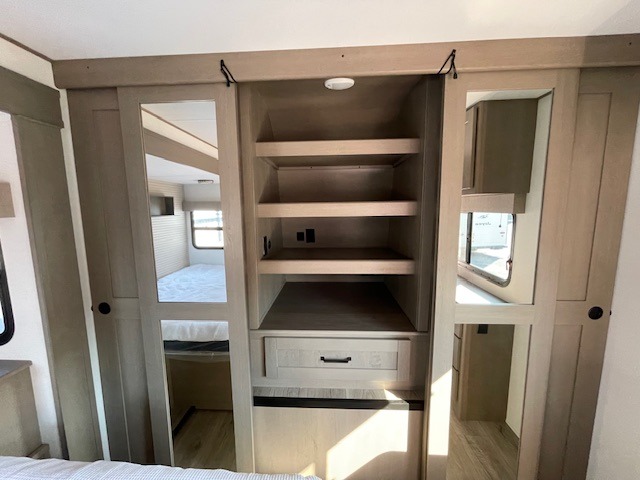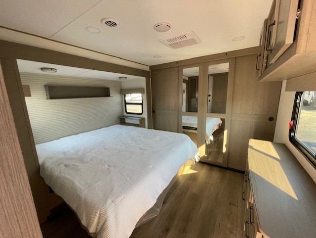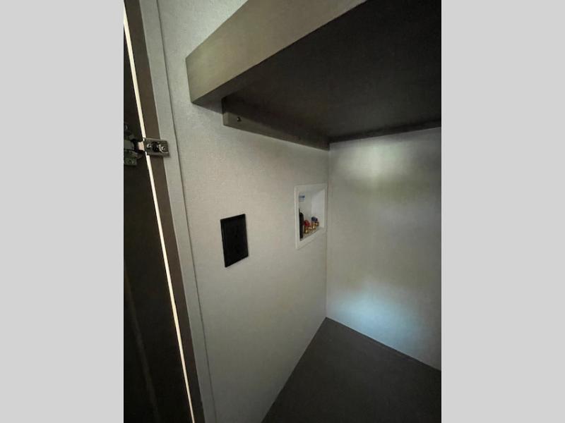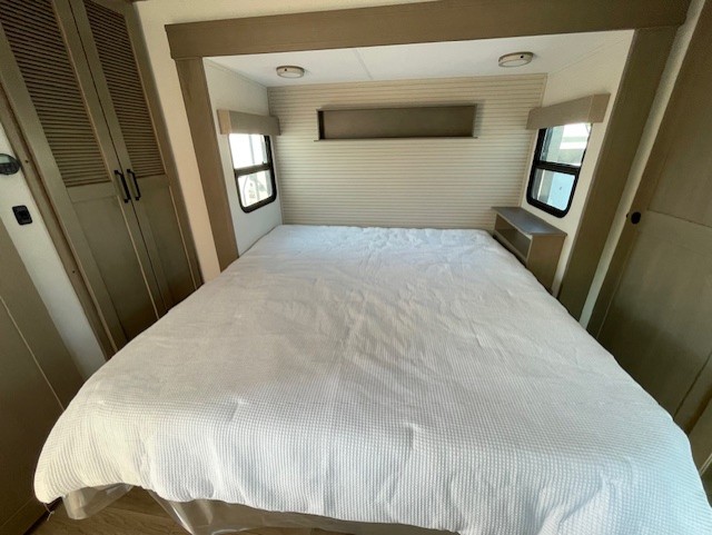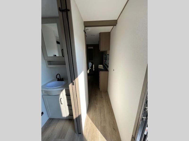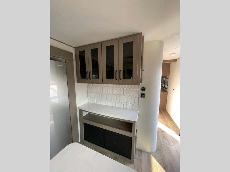 This rear living travel trailer will be perfect for extended stays at the campground or quick weekend trips to the lake! Once you've unloaded your gear from the pass-thru storage, head inside to relax on the rear tri-fold sofa with an adjustable headrest or on the theater seating across from the 40" TV and fireplace. There is also a booth dinette where you can dine together, or you can choose the optional swivel dinette. The spacious kitchen island will make meal time easier than ever, plus there is a pantry and 16 cu. ft. 12V refrigerator for food storage. The full bath is right next to the front private bedroom for easy nighttime use, and speaking of nighttime, you're sure to sleep soundly on the queen bed slide. There is also a large front closet, TV prep, plus washer and dryer prep if you choose to add these appliances.