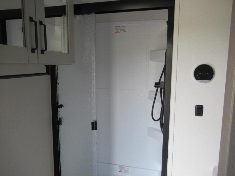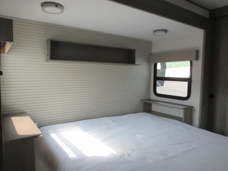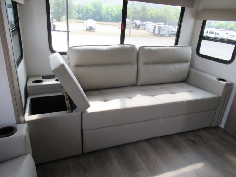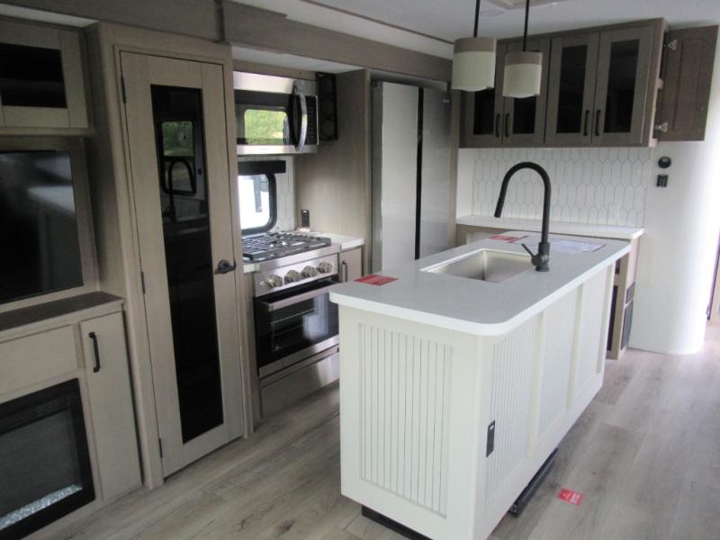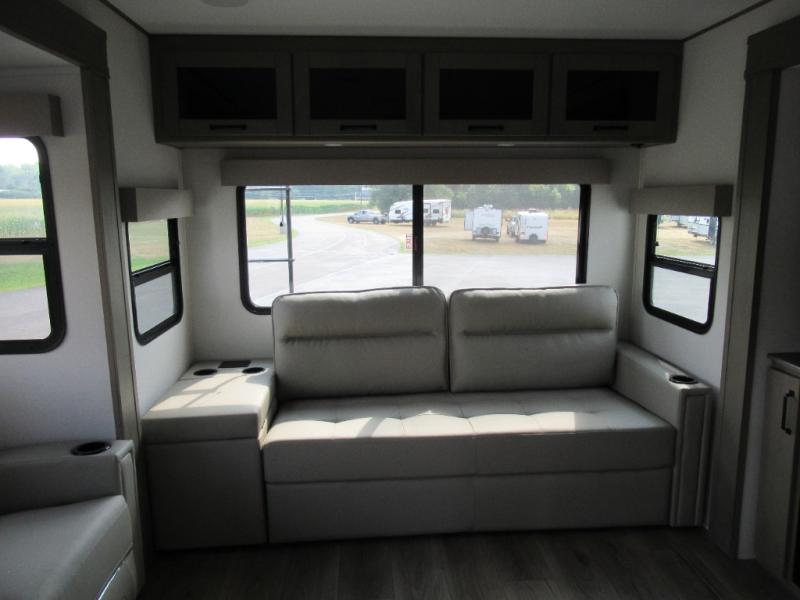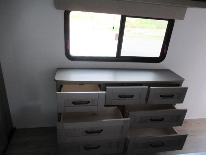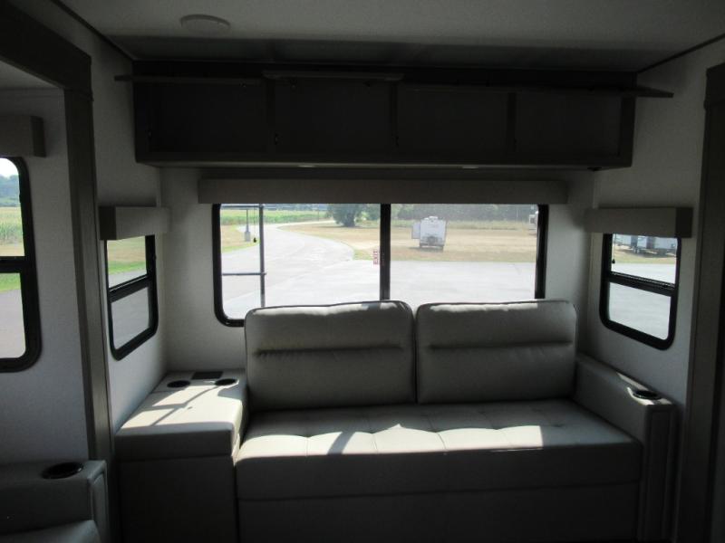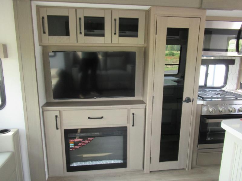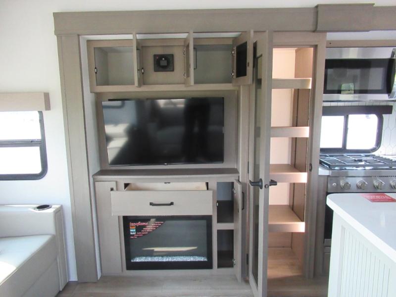 This rear living travel trailer will be perfect for extended stays at the campground or quick weekend trips to the lake! Once you've unloaded your gear from the pass-thru storage, head inside to relax on the rear tri-fold sofa with an adjustable headrest or on the theater seating across from the 40" TV and fireplace. There is also a booth dinette where you can dine together, or you can choose the optional swivel dinette. The spacious kitchen island will make meal time easier than ever, plus there is a pantry and 16 cu. ft. 12V refrigerator for food storage. The full bath is right next to the front private bedroom for easy nighttime use, and speaking of nighttime, you're sure to sleep soundly on the queen bed slide. There is also a large front closet, TV prep, plus washer and dryer prep if you choose to add these appliances.