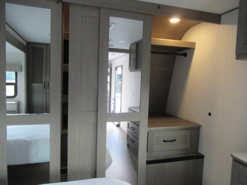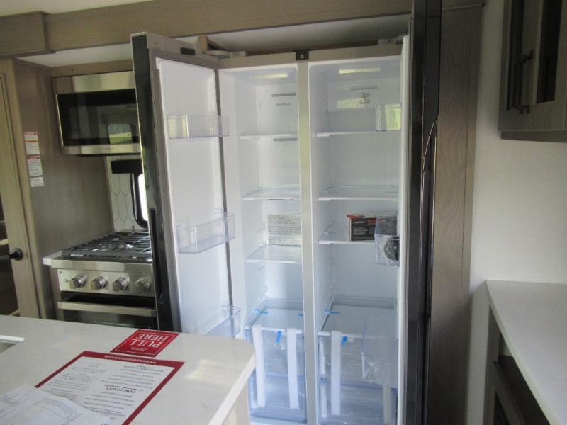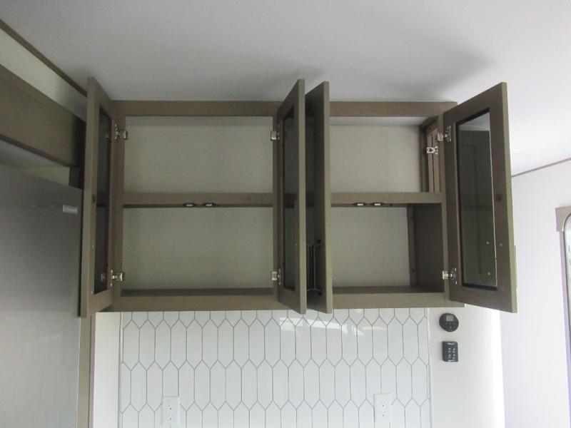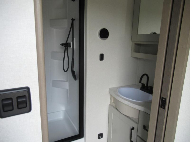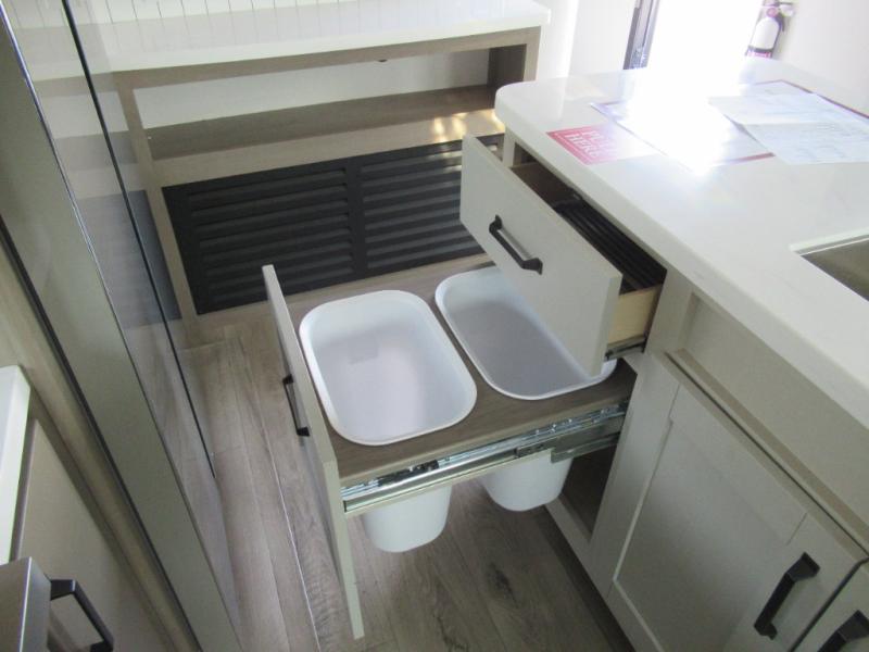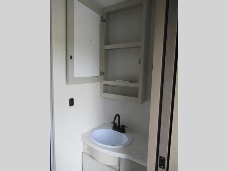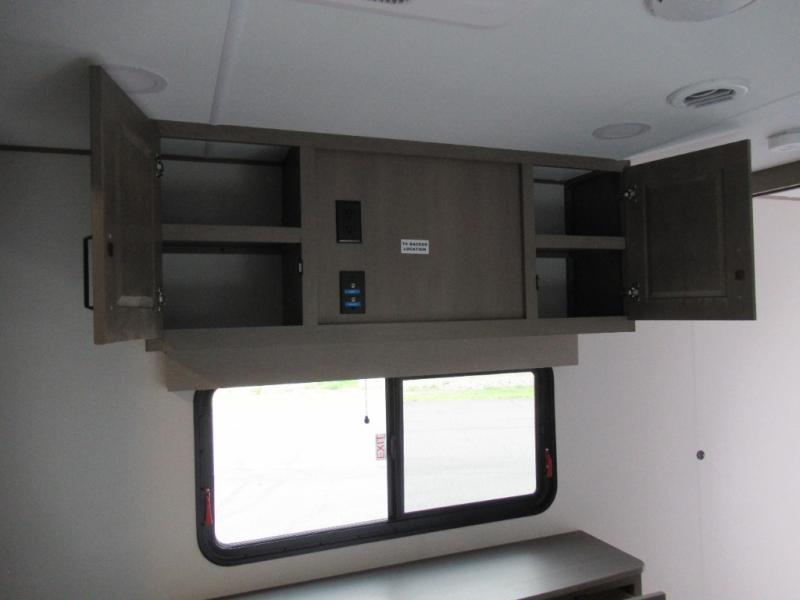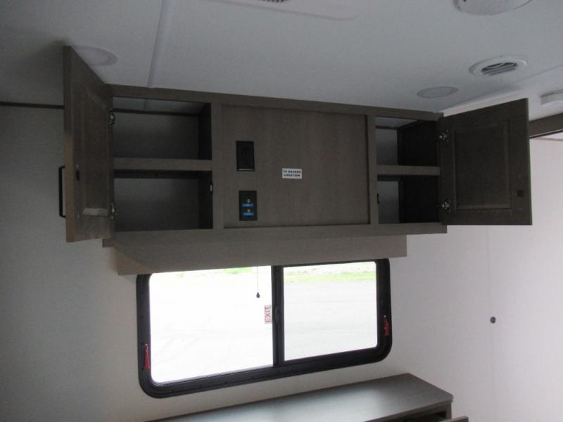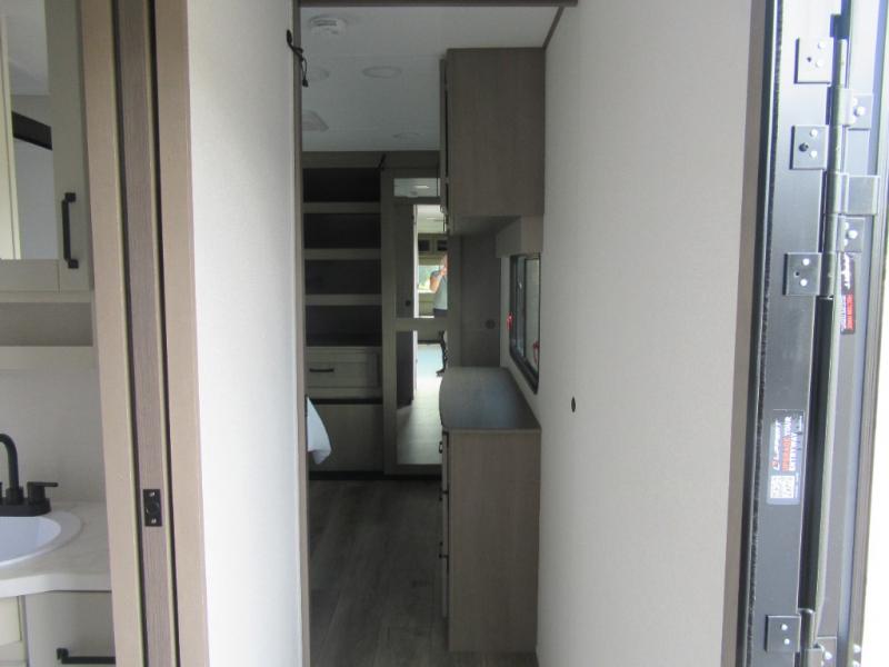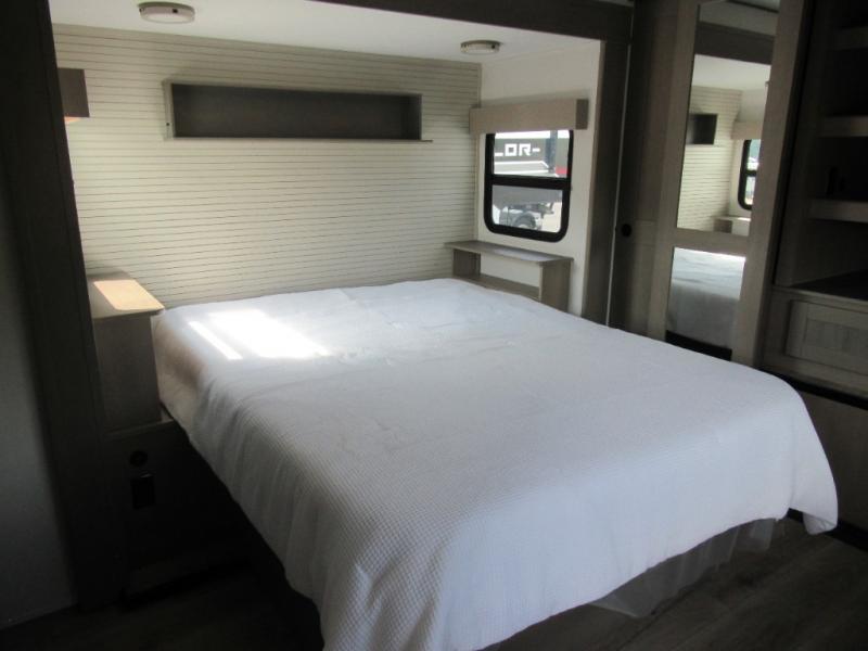 This rear living travel trailer will be perfect for extended stays at the campground or quick weekend trips to the lake! Once you've unloaded your gear from the pass-thru storage, head inside to relax on the rear tri-fold sofa with an adjustable headrest or on the theater seating across from the 40" TV and fireplace. There is also a booth dinette where you can dine together, or you can choose the optional swivel dinette. The spacious kitchen island will make meal time easier than ever, plus there is a pantry and 16 cu. ft. 12V refrigerator for food storage. The full bath is right next to the front private bedroom for easy nighttime use, and speaking of nighttime, you're sure to sleep soundly on the queen bed slide. There is also a large front closet, TV prep, plus washer and dryer prep if you choose to add these appliances.