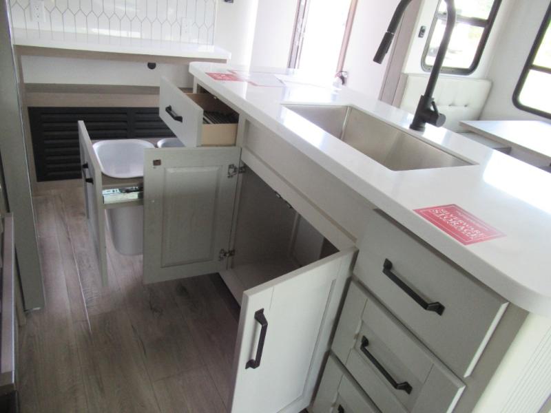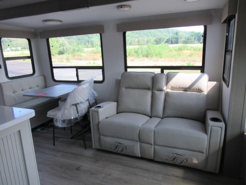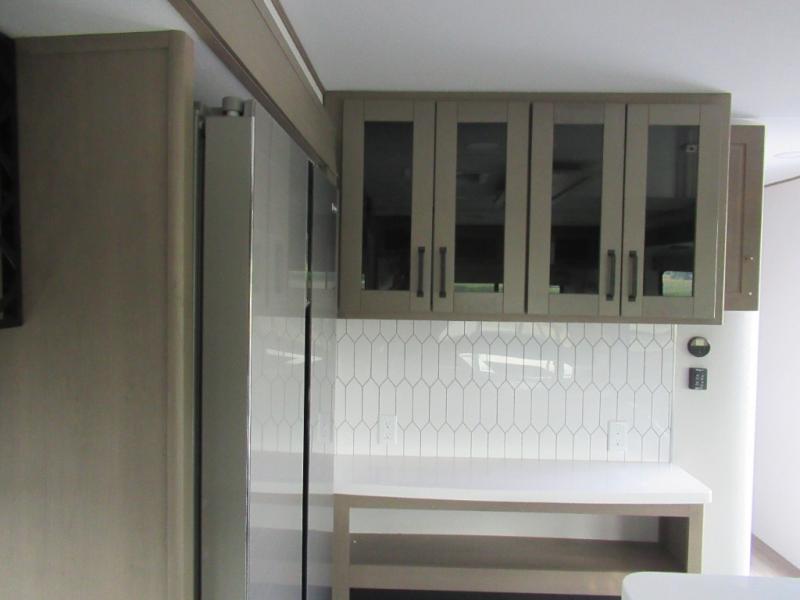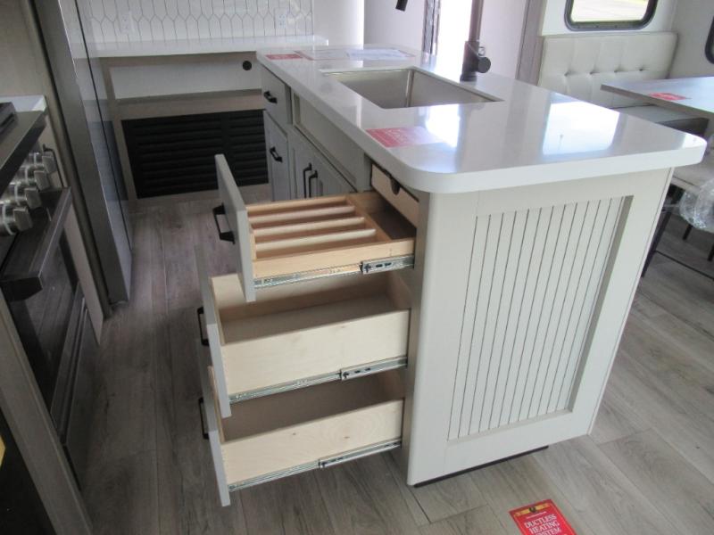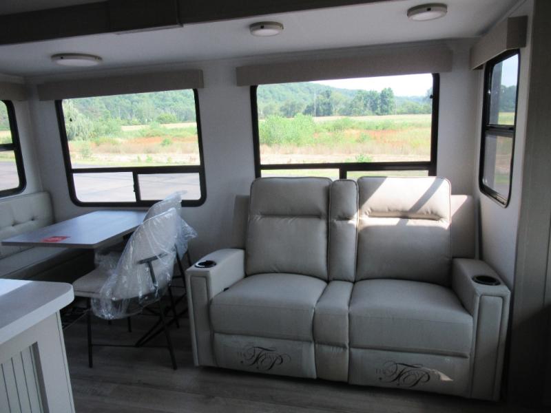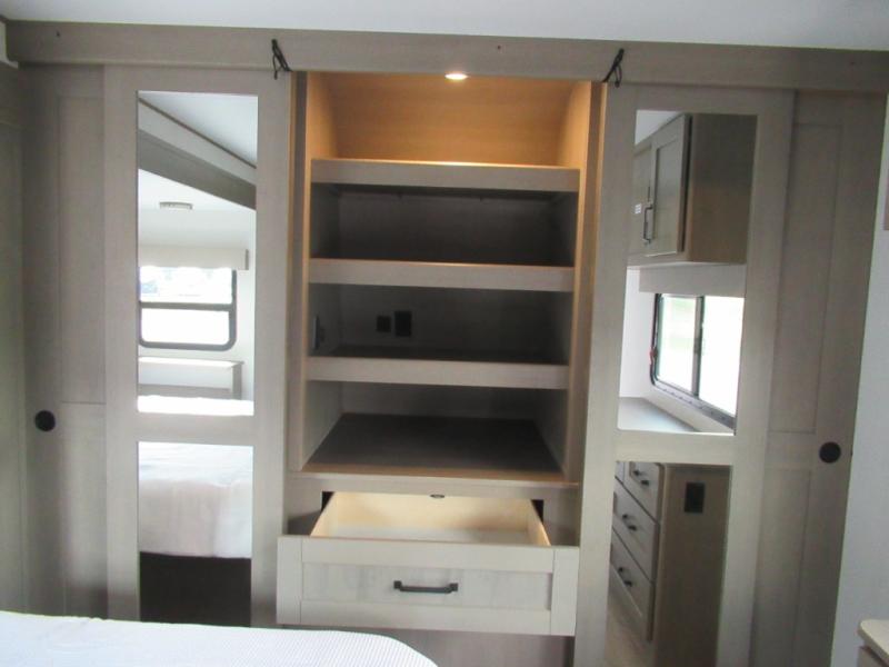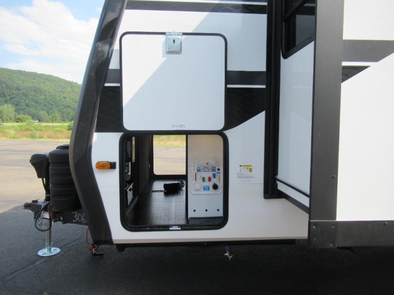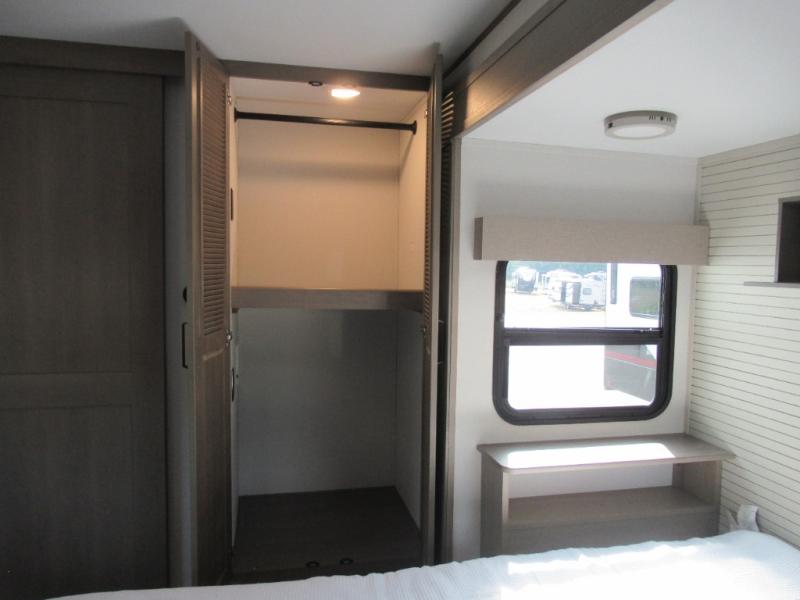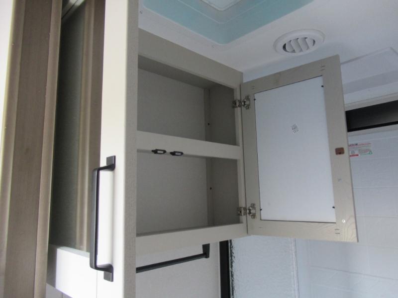 This rear living travel trailer will be perfect for extended stays at the campground or quick weekend trips to the lake! Once you've unloaded your gear from the pass-thru storage, head inside to relax on the rear tri-fold sofa with an adjustable headrest or on the theater seating across from the 40" TV and fireplace. There is also a booth dinette where you can dine together, or you can choose the optional swivel dinette. The spacious kitchen island will make meal time easier than ever, plus there is a pantry and 16 cu. ft. 12V refrigerator for food storage. The full bath is right next to the front private bedroom for easy nighttime use, and speaking of nighttime, you're sure to sleep soundly on the queen bed slide. There is also a large front closet, TV prep, plus washer and dryer prep if you choose to add these appliances.