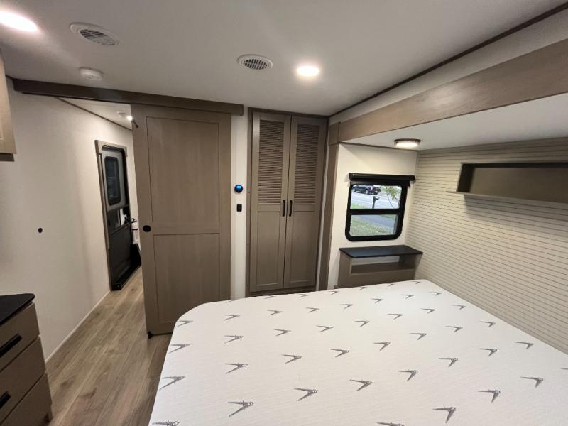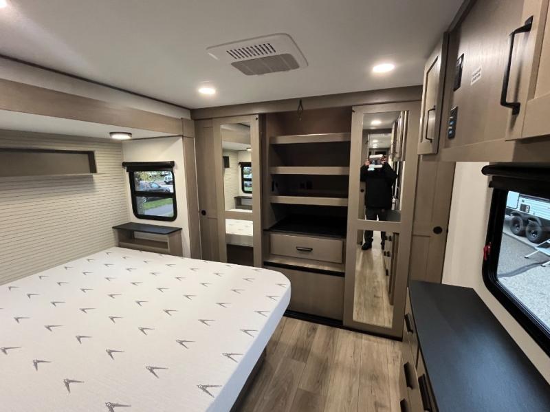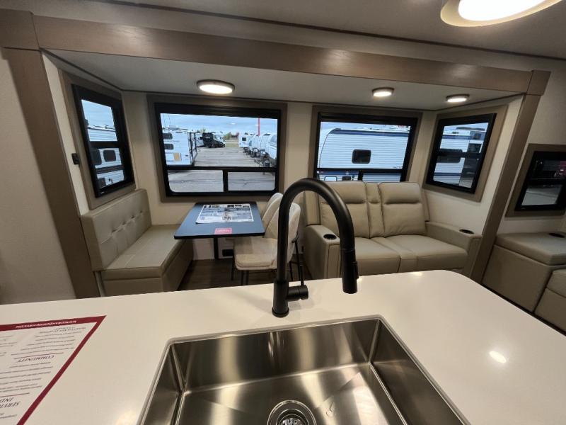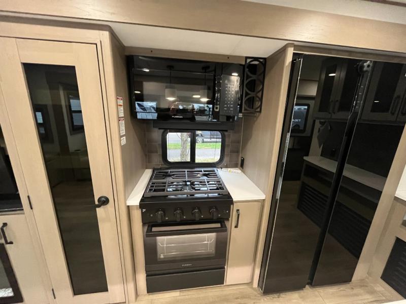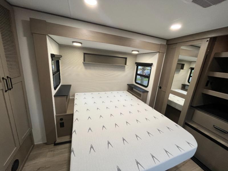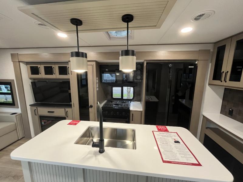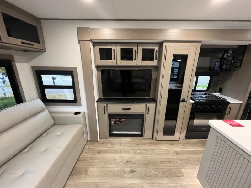 This rear living travel trailer will be perfect for extended stays at the campground or quick weekend trips to the lake! Once you've unloaded your gear from the pass-thru storage, head inside to relax on the rear tri-fold sofa with an adjustable headrest or on the theater seating across from the 40" TV and fireplace. There is also a booth dinette where you can dine together, or you can choose the optional swivel dinette. The spacious kitchen island will make meal time easier than ever, plus there is a pantry and 16 cu. ft. 12V refrigerator for food storage. The full bath is right next to the front private bedroom for easy nighttime use, and speaking of nighttime, you're sure to sleep soundly on the queen bed slide. There is also a large front closet, TV prep, plus washer and dryer prep if you choose to add these appliances.