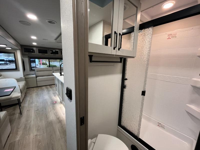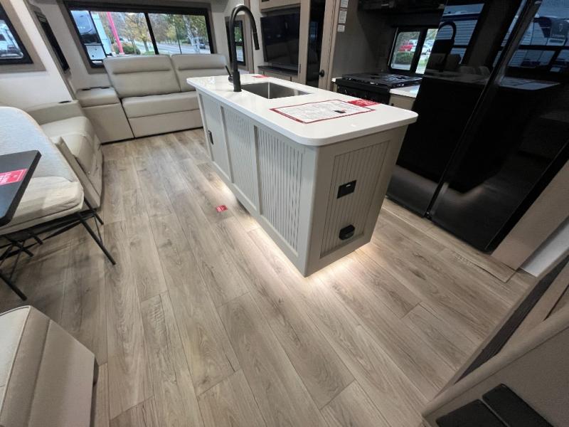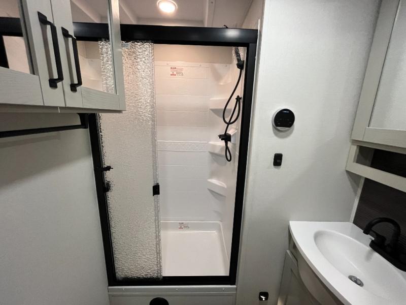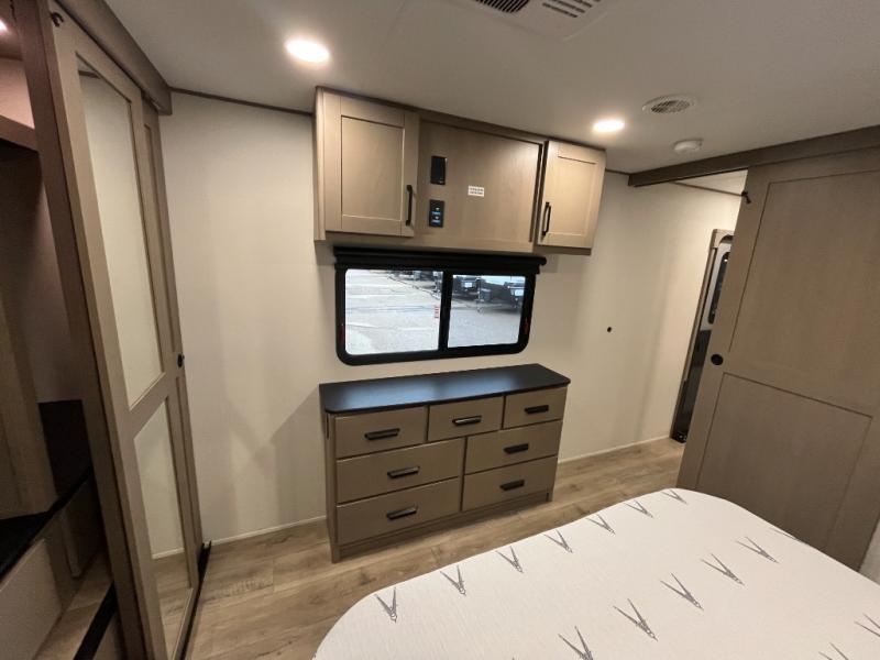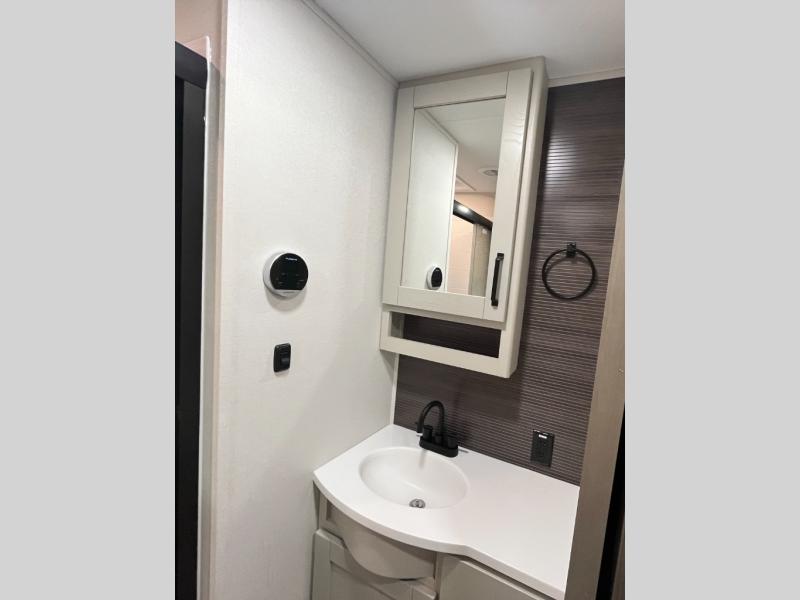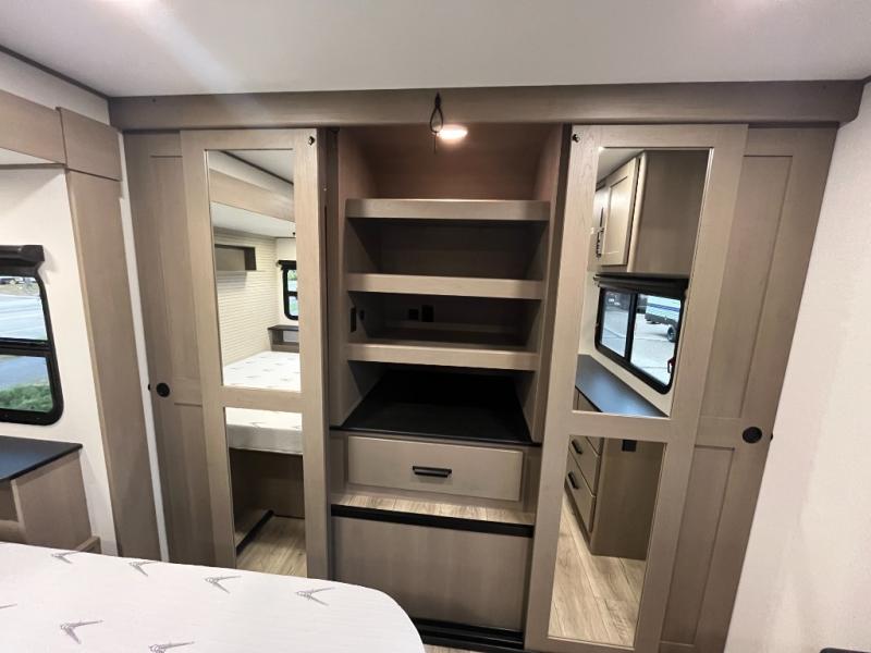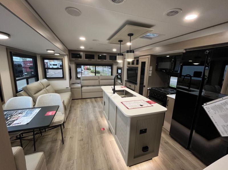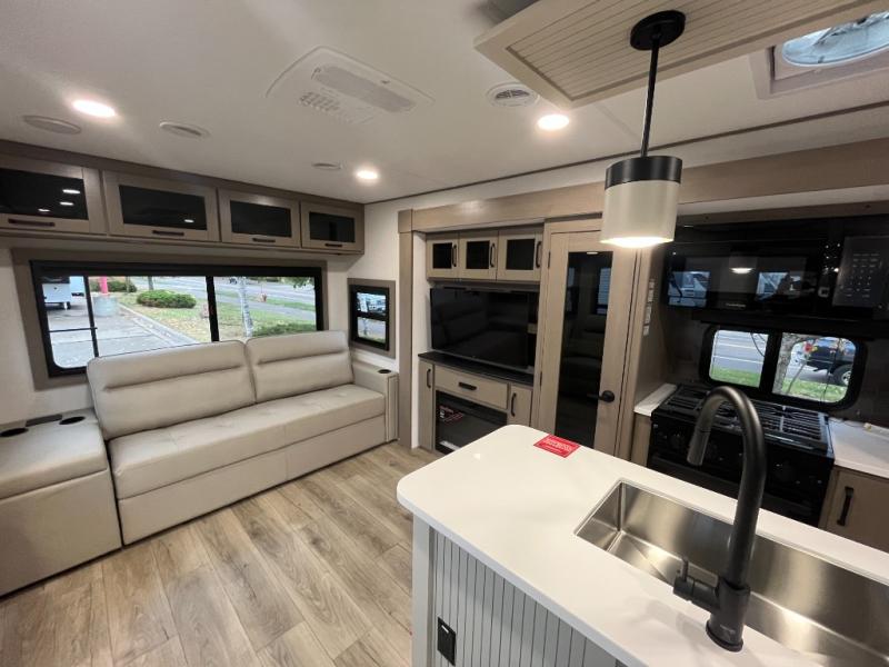 This rear living travel trailer will be perfect for extended stays at the campground or quick weekend trips to the lake! Once you've unloaded your gear from the pass-thru storage, head inside to relax on the rear tri-fold sofa with an adjustable headrest or on the theater seating across from the 40" TV and fireplace. There is also a booth dinette where you can dine together, or you can choose the optional swivel dinette. The spacious kitchen island will make meal time easier than ever, plus there is a pantry and 16 cu. ft. 12V refrigerator for food storage. The full bath is right next to the front private bedroom for easy nighttime use, and speaking of nighttime, you're sure to sleep soundly on the queen bed slide. There is also a large front closet, TV prep, plus washer and dryer prep if you choose to add these appliances.