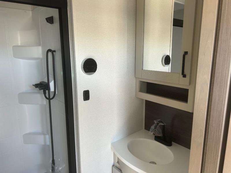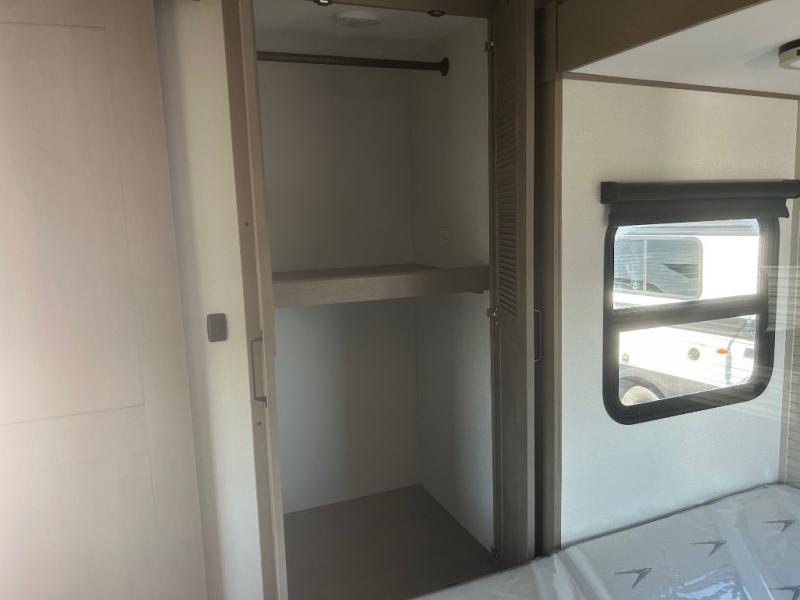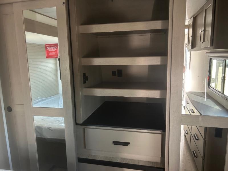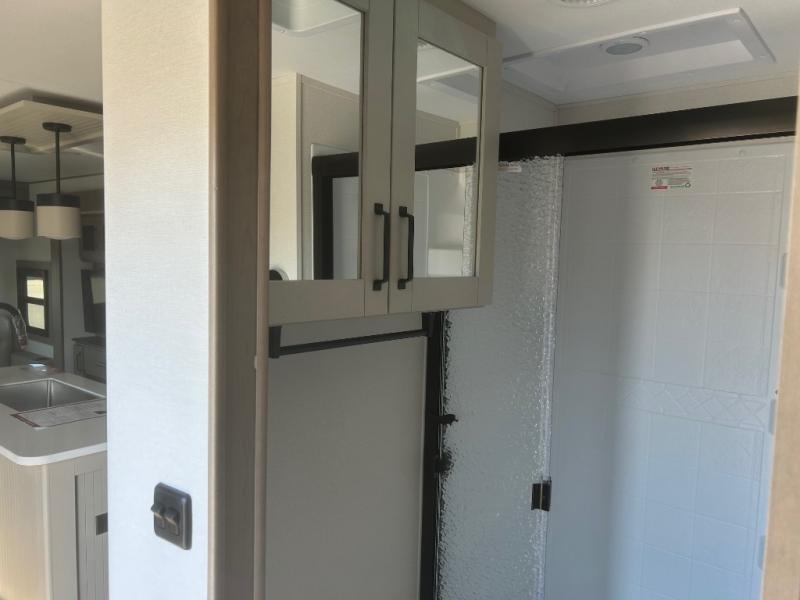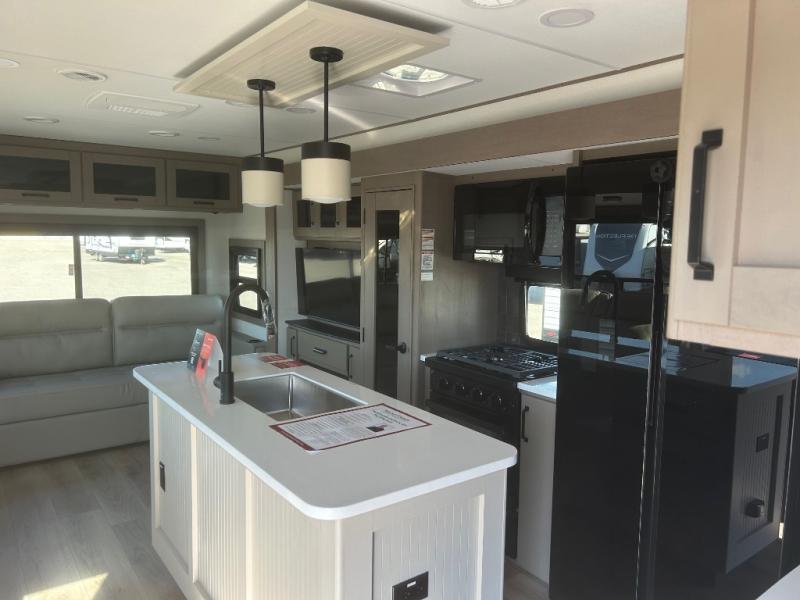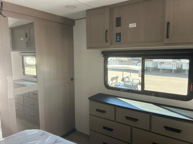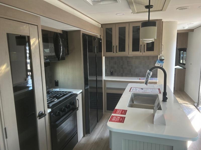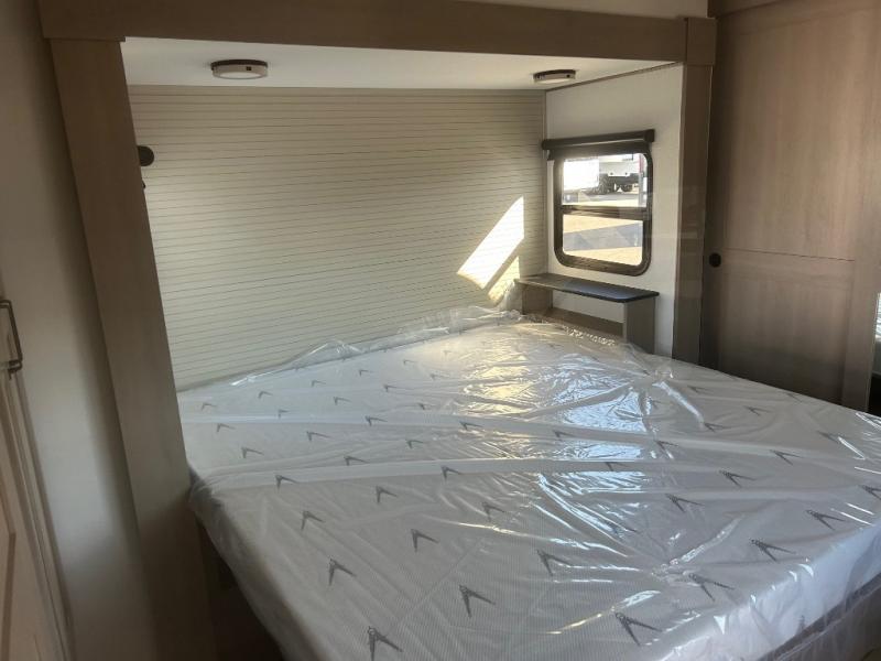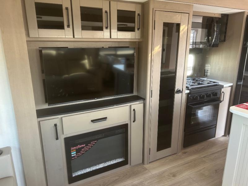 This rear living travel trailer will be perfect for extended stays at the campground or quick weekend trips to the lake! Once you've unloaded your gear from the pass-thru storage, head inside to relax on the rear tri-fold sofa with an adjustable headrest or on the theater seating across from the 40" TV and fireplace. There is also a booth dinette where you can dine together, or you can choose the optional swivel dinette. The spacious kitchen island will make meal time easier than ever, plus there is a pantry and 16 cu. ft. 12V refrigerator for food storage. The full bath is right next to the front private bedroom for easy nighttime use, and speaking of nighttime, you're sure to sleep soundly on the queen bed slide. There is also a large front closet, TV prep, plus washer and dryer prep if you choose to add these appliances.