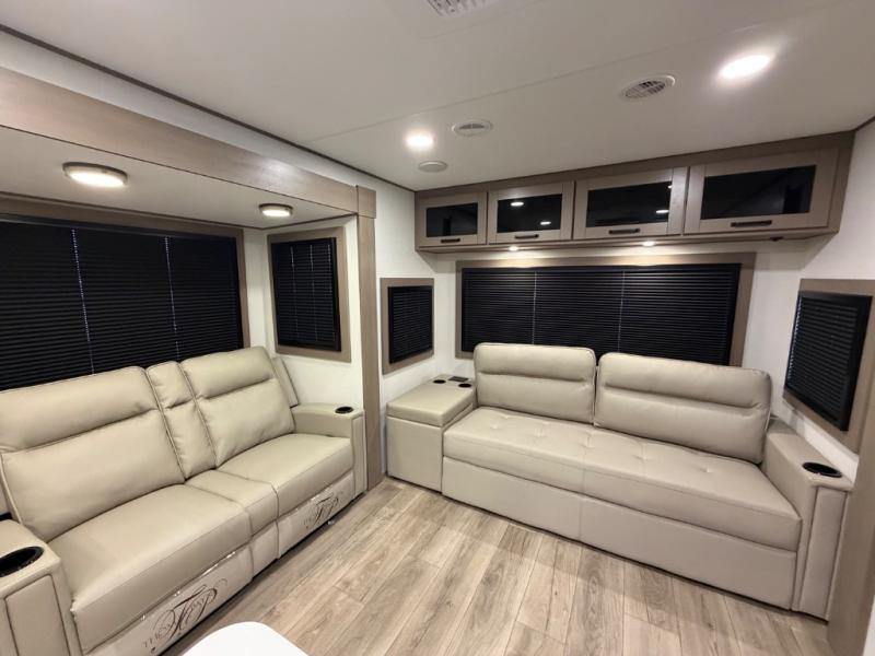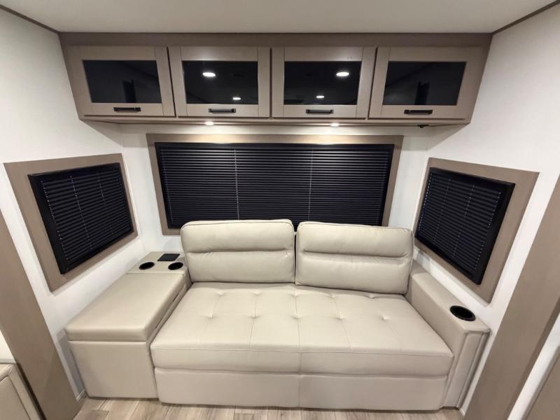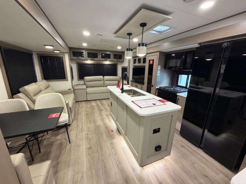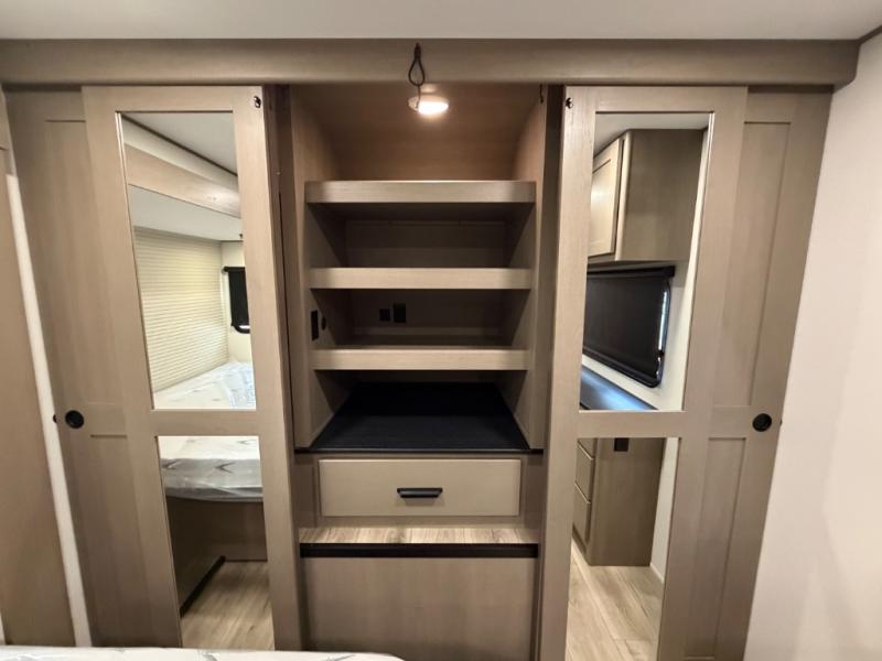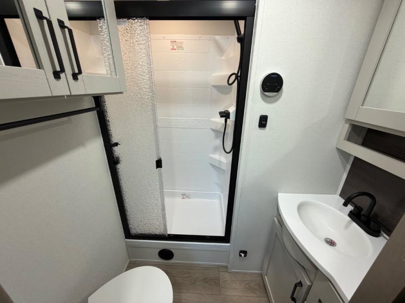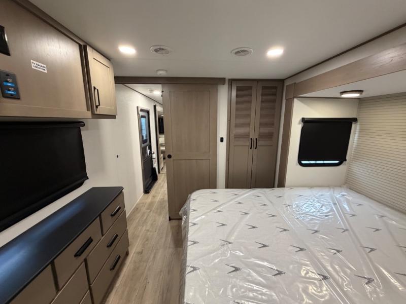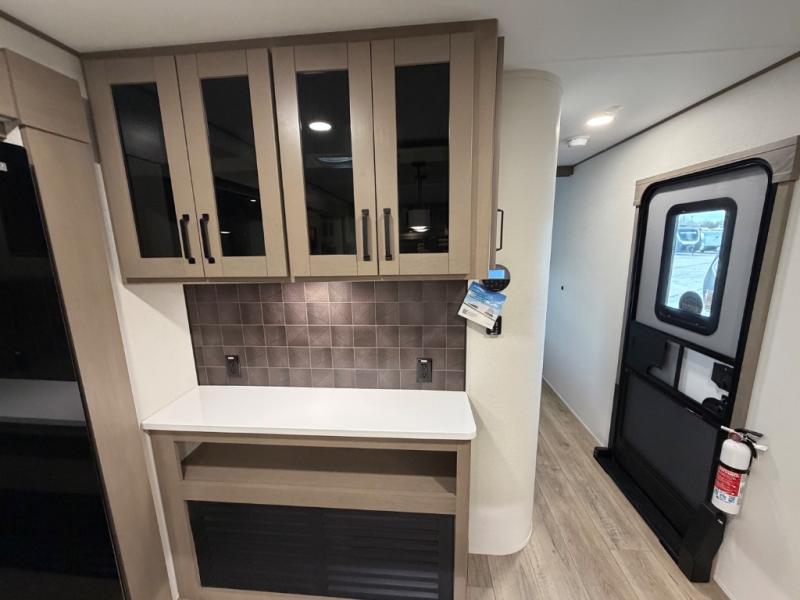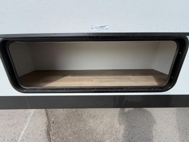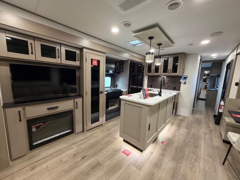 This rear living travel trailer will be perfect for extended stays at the campground or quick weekend trips to the lake! Once you've unloaded your gear from the pass-thru storage, head inside to relax on the rear tri-fold sofa with an adjustable headrest or on the theater seating across from the 40" TV and fireplace. There is also a booth dinette where you can dine together, or you can choose the optional swivel dinette. The spacious kitchen island will make meal time easier than ever, plus there is a pantry and 16 cu. ft. 12V refrigerator for food storage. The full bath is right next to the front private bedroom for easy nighttime use, and speaking of nighttime, you're sure to sleep soundly on the queen bed slide. There is also a large front closet, TV prep, plus washer and dryer prep if you choose to add these appliances.