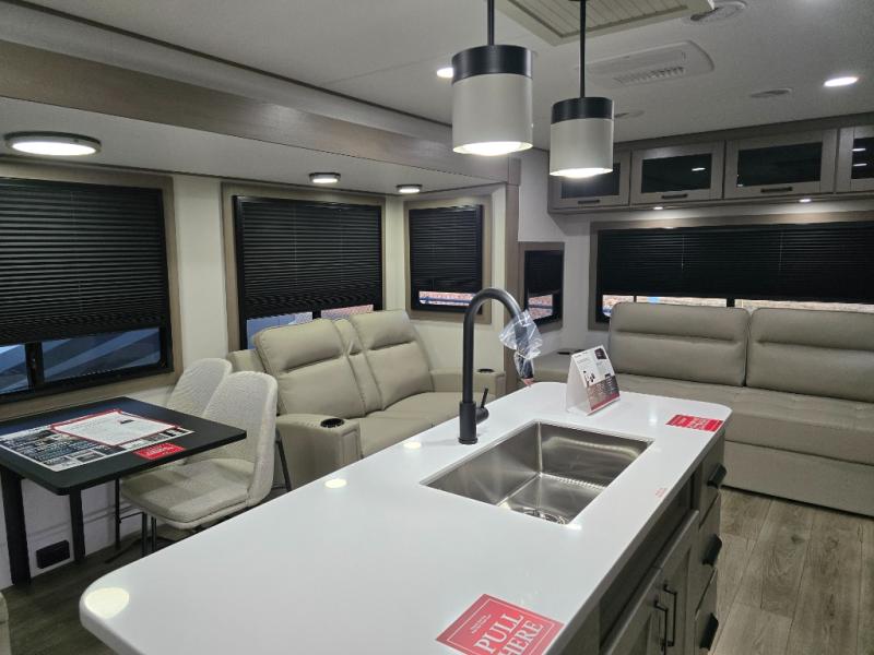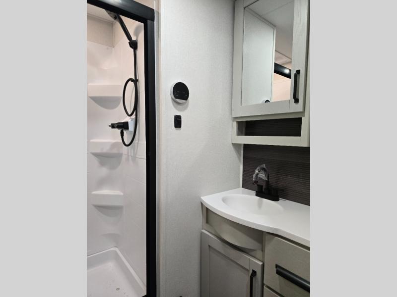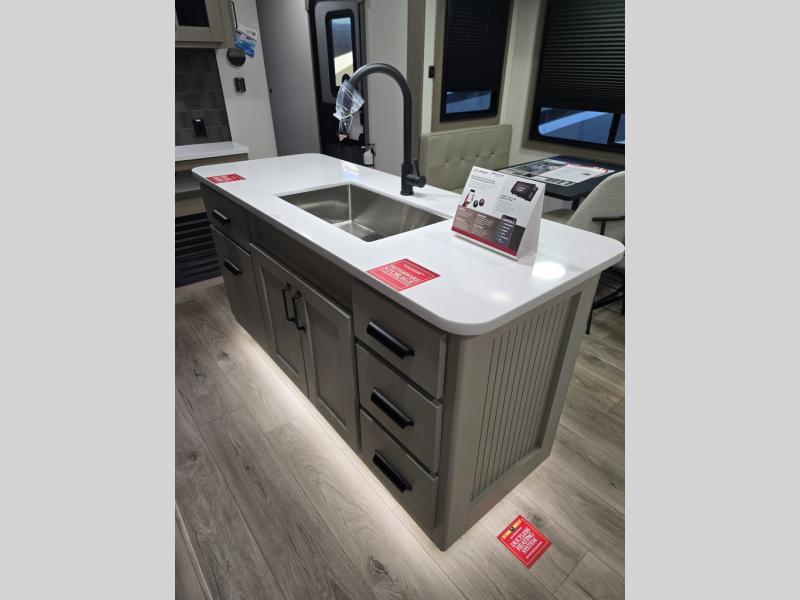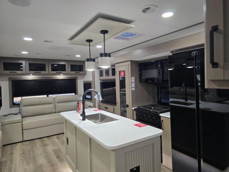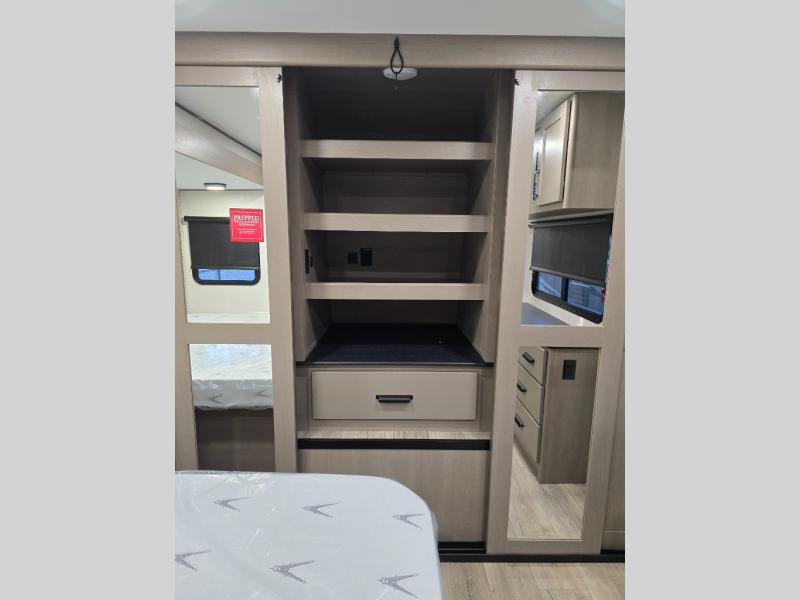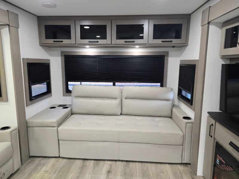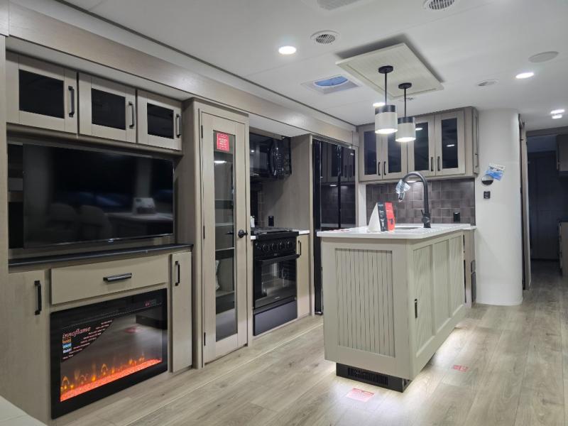 This rear living travel trailer will be perfect for extended stays at the campground or quick weekend trips to the lake! Once you've unloaded your gear from the pass-thru storage, head inside to relax on the rear tri-fold sofa with an adjustable headrest or on the theater seating across from the 40" TV and fireplace. There is also a booth dinette where you can dine together, or you can choose the optional swivel dinette. The spacious kitchen island will make meal time easier than ever, plus there is a pantry and 16 cu. ft. 12V refrigerator for food storage. The full bath is right next to the front private bedroom for easy nighttime use, and speaking of nighttime, you're sure to sleep soundly on the queen bed slide. There is also a large front closet, TV prep, plus washer and dryer prep if you choose to add these appliances.