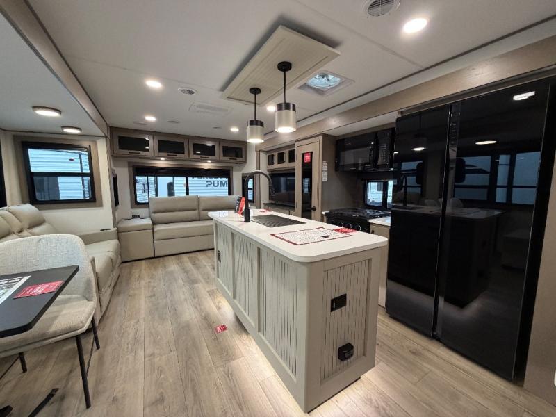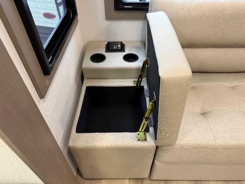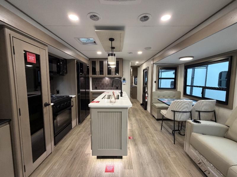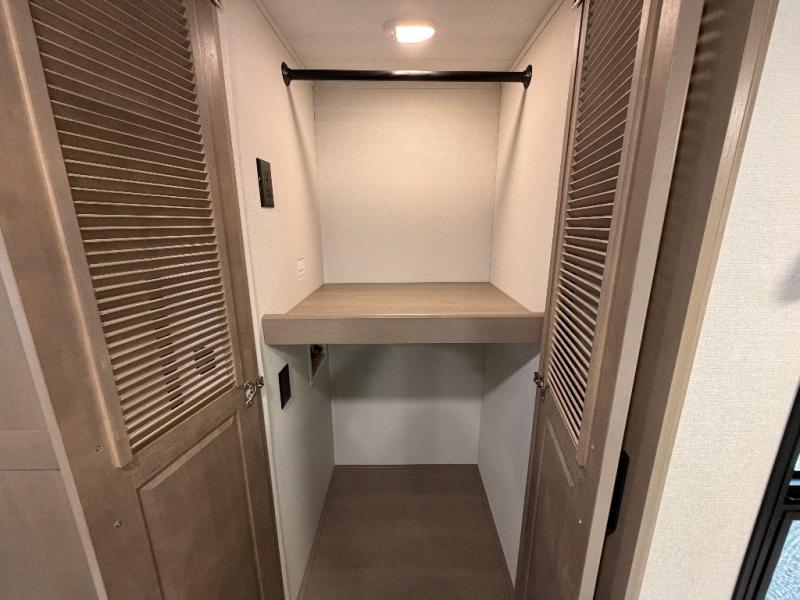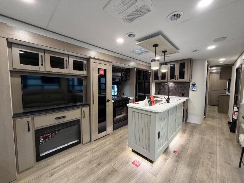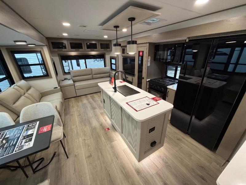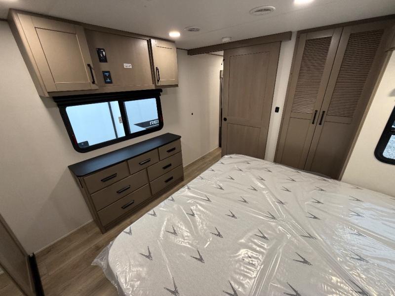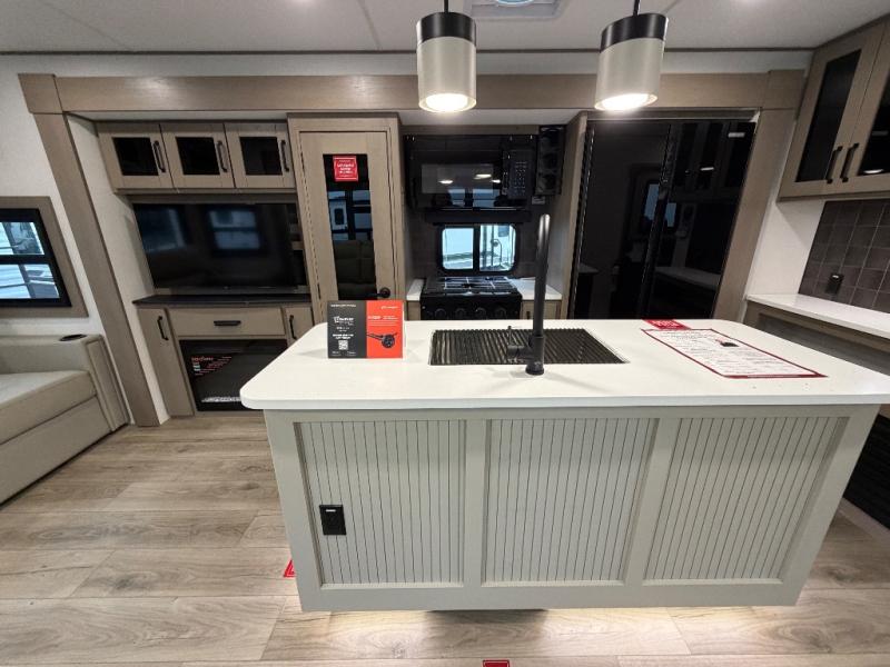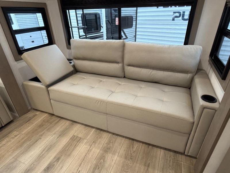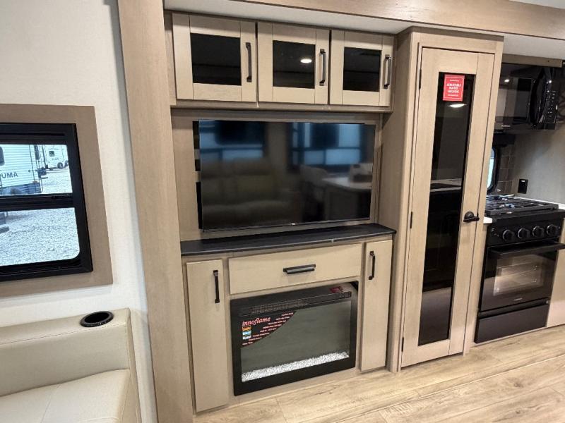This rear living travel trailer will be perfect for extended stays at the campground or quick weekend trips to the lake! Once you've unloaded your gear from the pass-thru storage, head inside to relax on the rear tri-fold sofa with an adjustable headrest or on the theater seating across from the 40" TV and fireplace. There is also a booth dinette where you can dine together, or you can choose the optional swivel dinette. The spacious kitchen island will make meal time easier than ever, plus there is a pantry and 16 cu. ft. 12V refrigerator for food storage. The full bath is right next to the front private bedroom for easy nighttime use, and speaking of nighttime, you're sure to sleep soundly on the queen bed slide. There is also a large front closet, TV prep, plus washer and dryer prep if you choose to add these appliances.