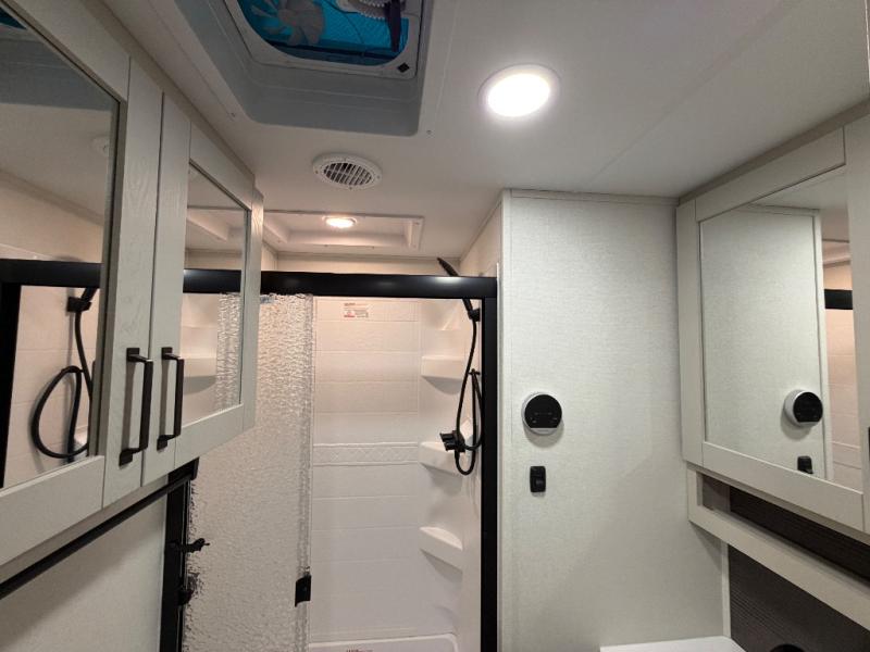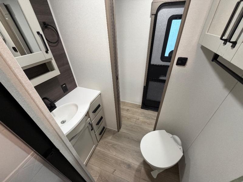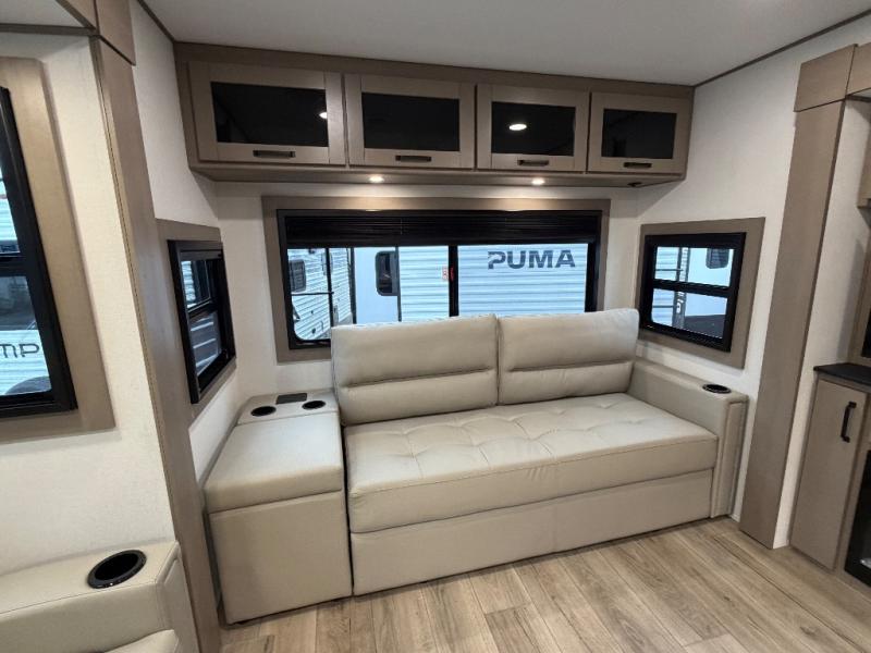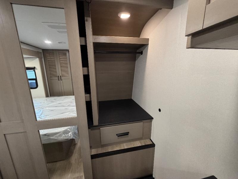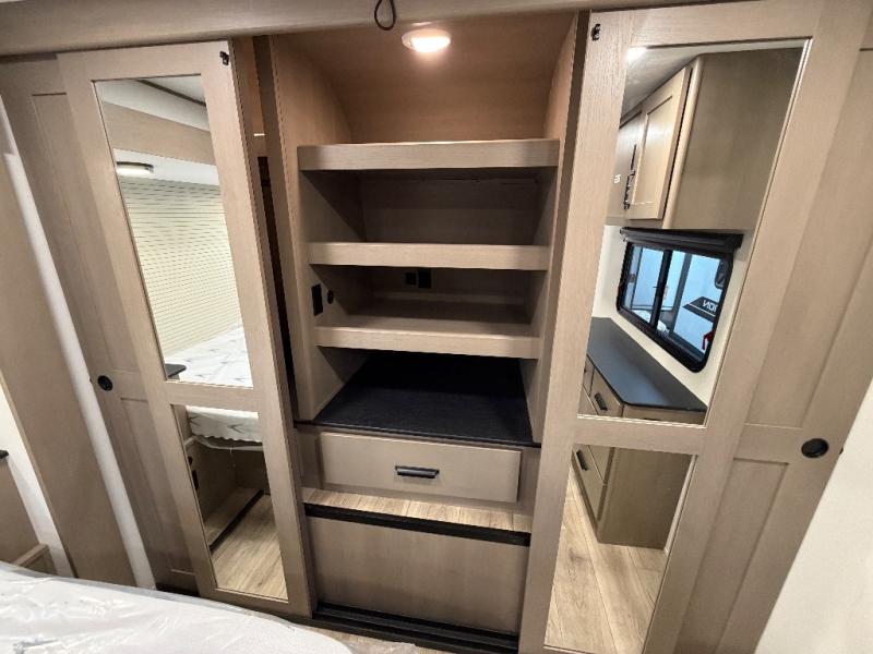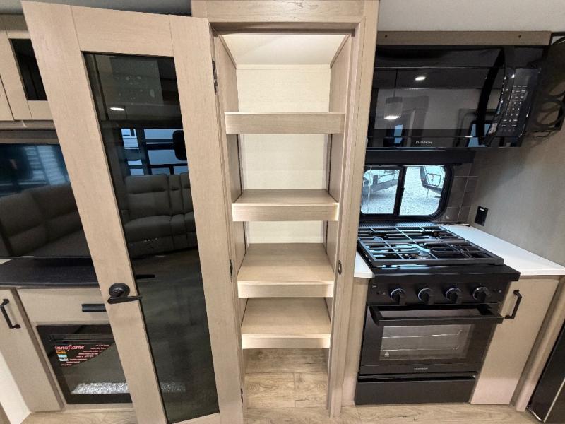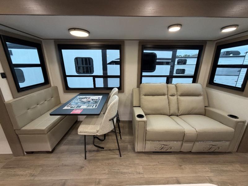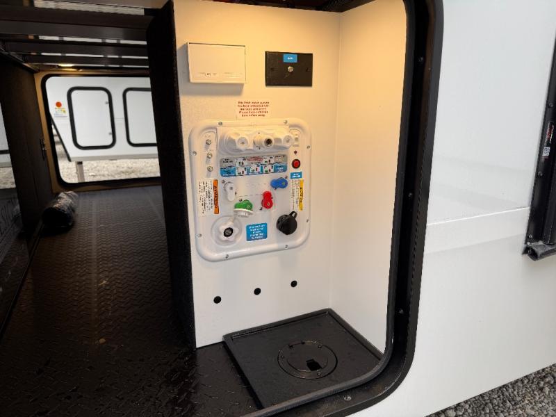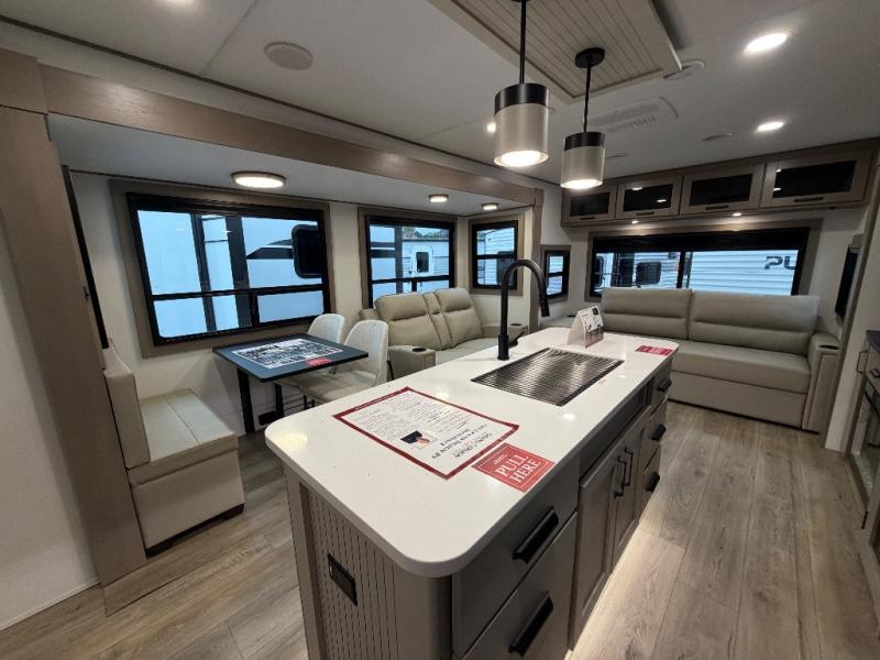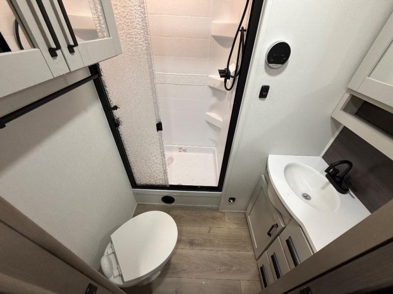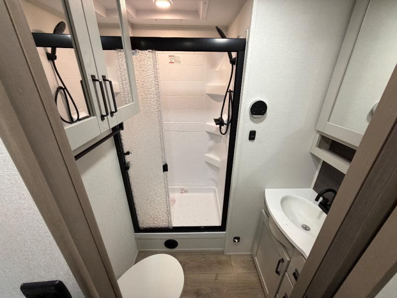 This rear living travel trailer will be perfect for extended stays at the campground or quick weekend trips to the lake! Once you've unloaded your gear from the pass-thru storage, head inside to relax on the rear tri-fold sofa with an adjustable headrest or on the theater seating across from the 40" TV and fireplace. There is also a booth dinette where you can dine together, or you can choose the optional swivel dinette. The spacious kitchen island will make meal time easier than ever, plus there is a pantry and 16 cu. ft. 12V refrigerator for food storage. The full bath is right next to the front private bedroom for easy nighttime use, and speaking of nighttime, you're sure to sleep soundly on the queen bed slide. There is also a large front closet, TV prep, plus washer and dryer prep if you choose to add these appliances.