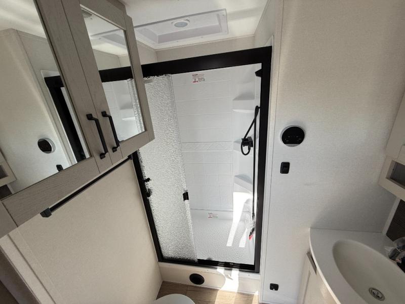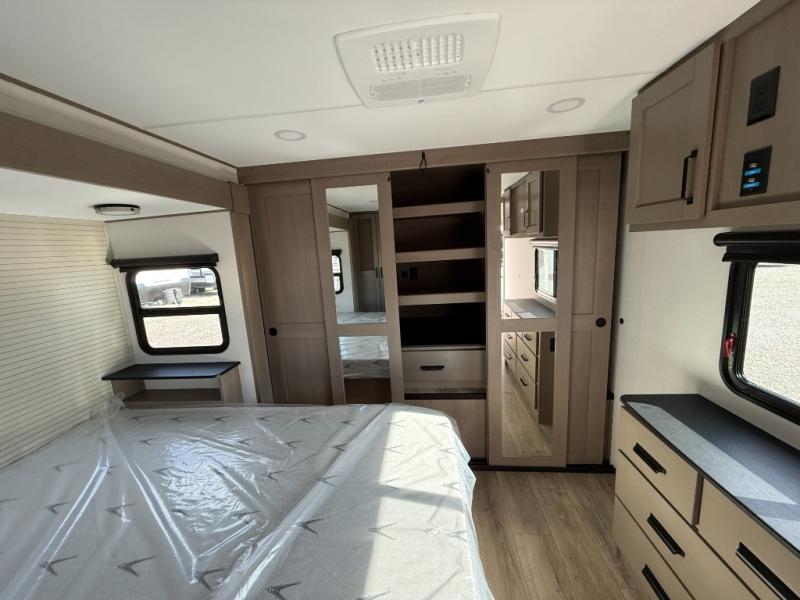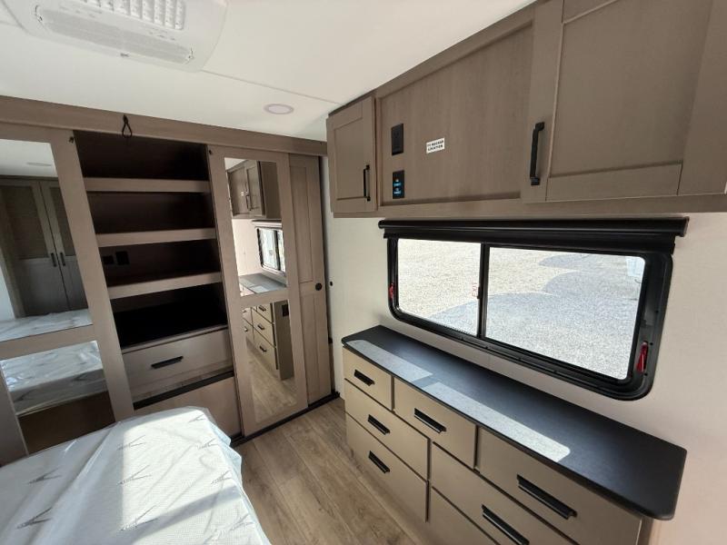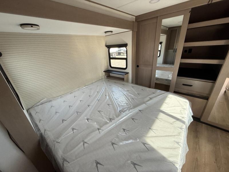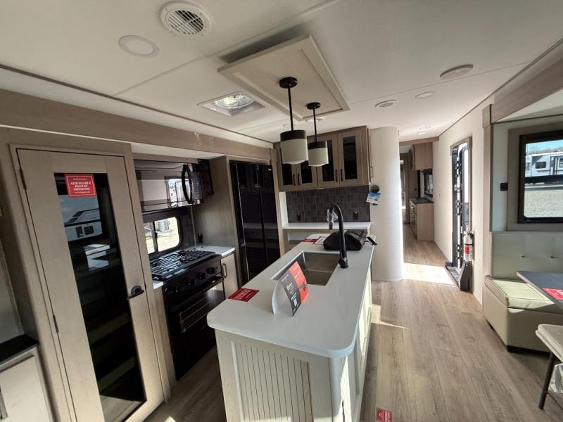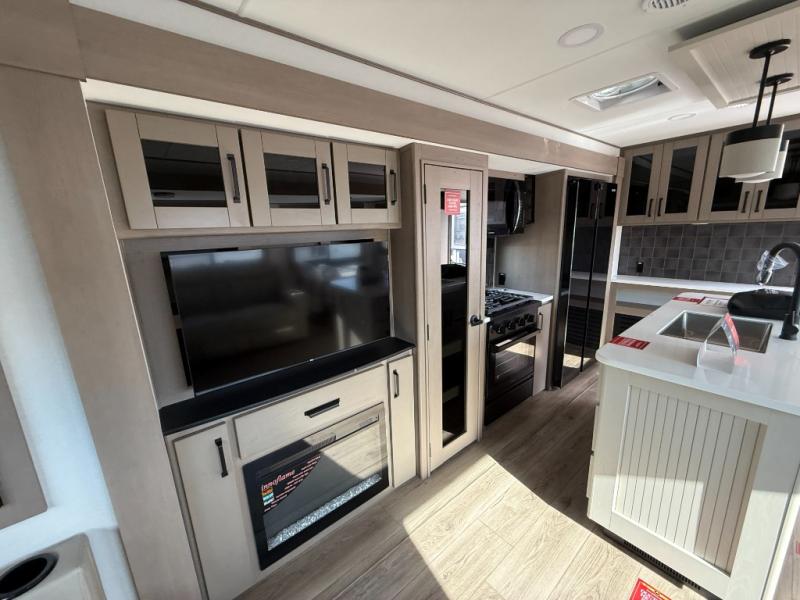 This rear living travel trailer will be perfect for extended stays at the campground or quick weekend trips to the lake! Once you've unloaded your gear from the pass-thru storage, head inside to relax on the rear tri-fold sofa with an adjustable headrest or on the theater seating across from the 40" TV and fireplace. There is also a booth dinette where you can dine together, or you can choose the optional swivel dinette. The spacious kitchen island will make meal time easier than ever, plus there is a pantry and 16 cu. ft. 12V refrigerator for food storage. The full bath is right next to the front private bedroom for easy nighttime use, and speaking of nighttime, you're sure to sleep soundly on the queen bed slide. There is also a large front closet, TV prep, plus washer and dryer prep if you choose to add these appliances.