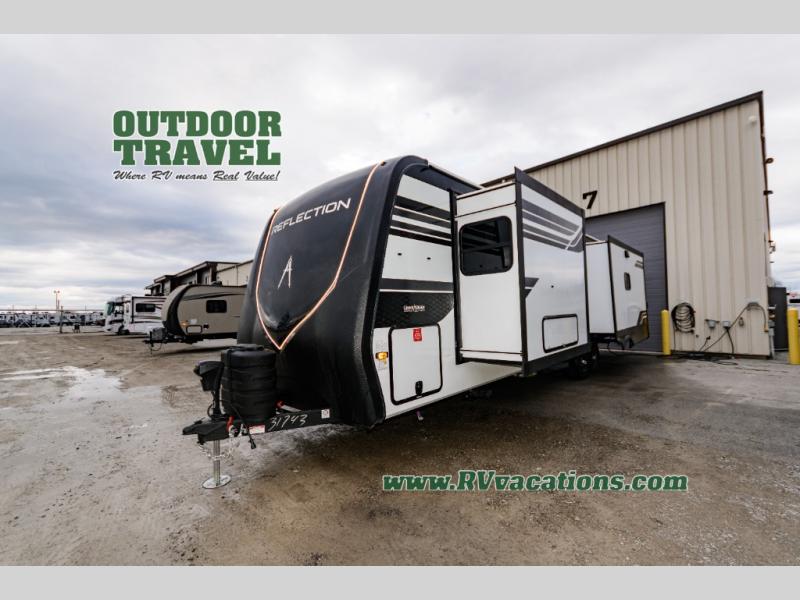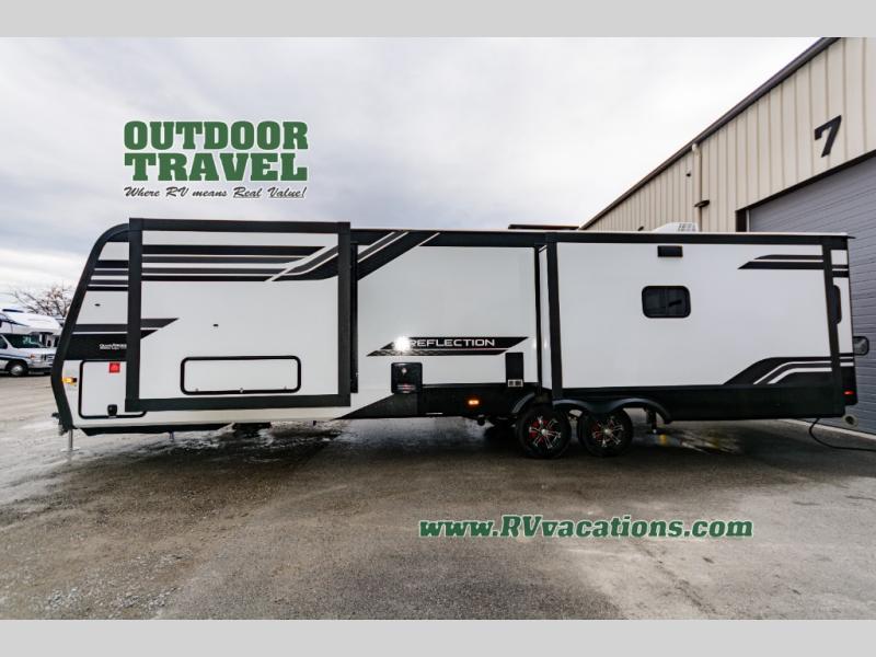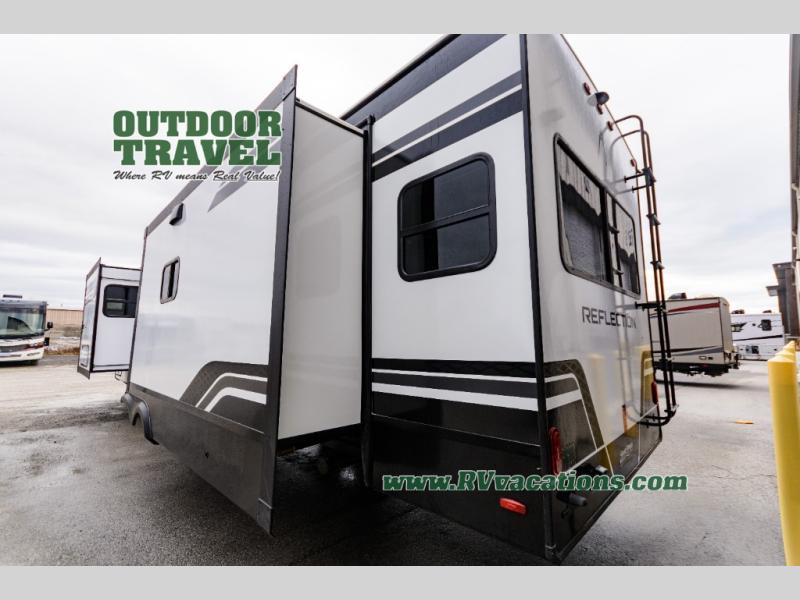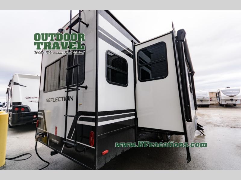 With any Reflection travel trailer by Grand Design, you will have a solar panel for off-grid camping and a 60 amp charge controller and inverter prep, a Universal All-In-One docking station, unobstructed pass-through storage, and Goodyear Endurance tires. Each is constructed of gel coat exterior sidewalls, residential 5" truss rafters, walk-on roof decking, a fiberglass and radiant foil roof and front cap insulation plus laminated aluminum framed side walls, roof and end walls in slide rooms. Head inside to enjoy residential hardwood cabinet doors, premium Congoleum flooring, a spacious shower with a glass door, and many more comforts!