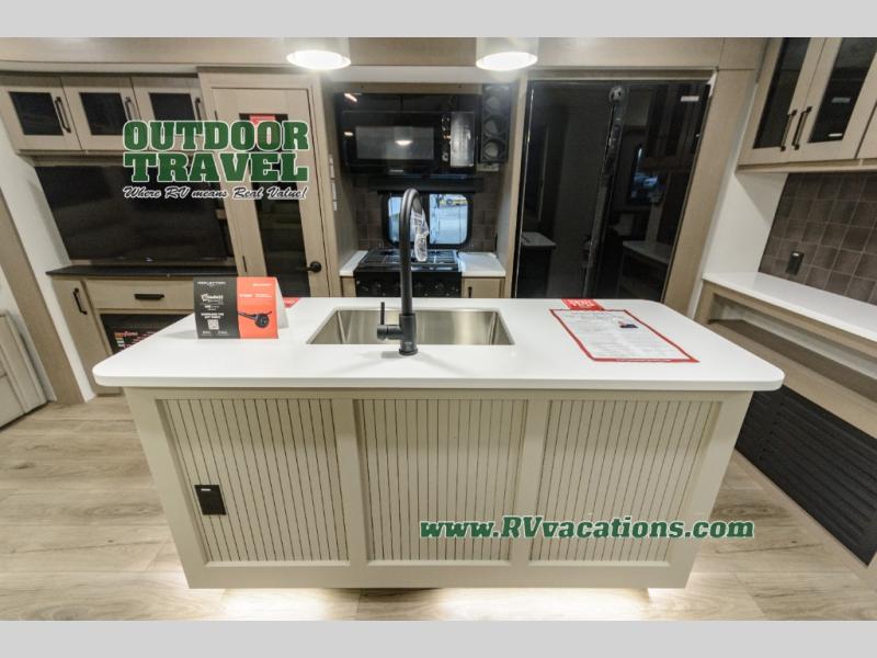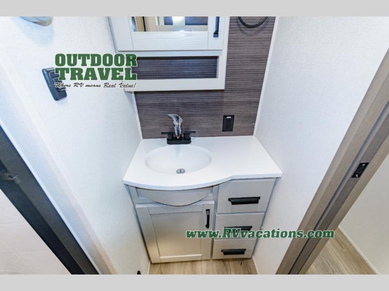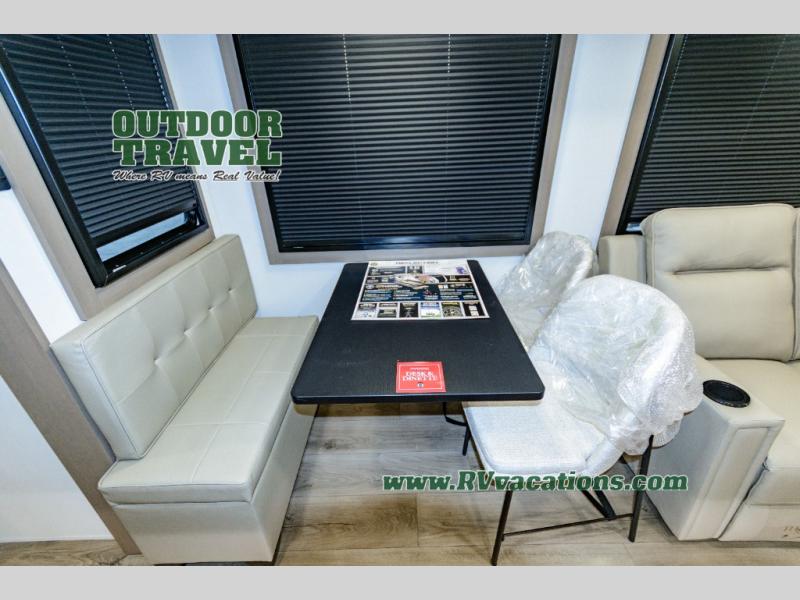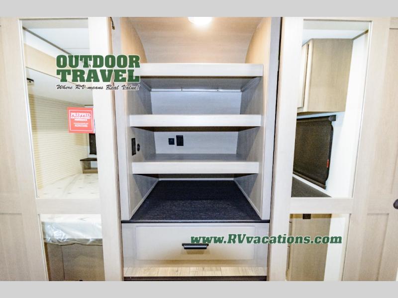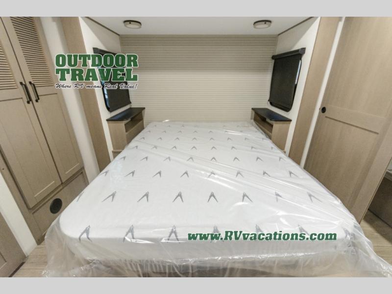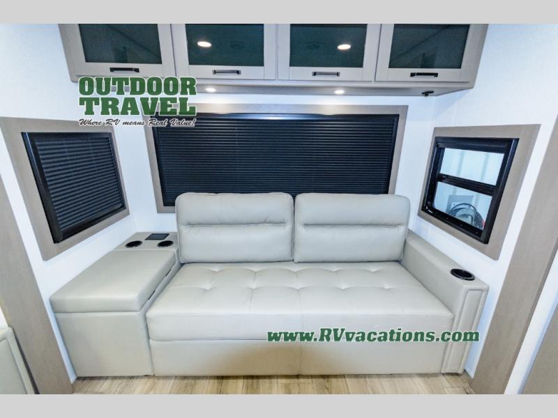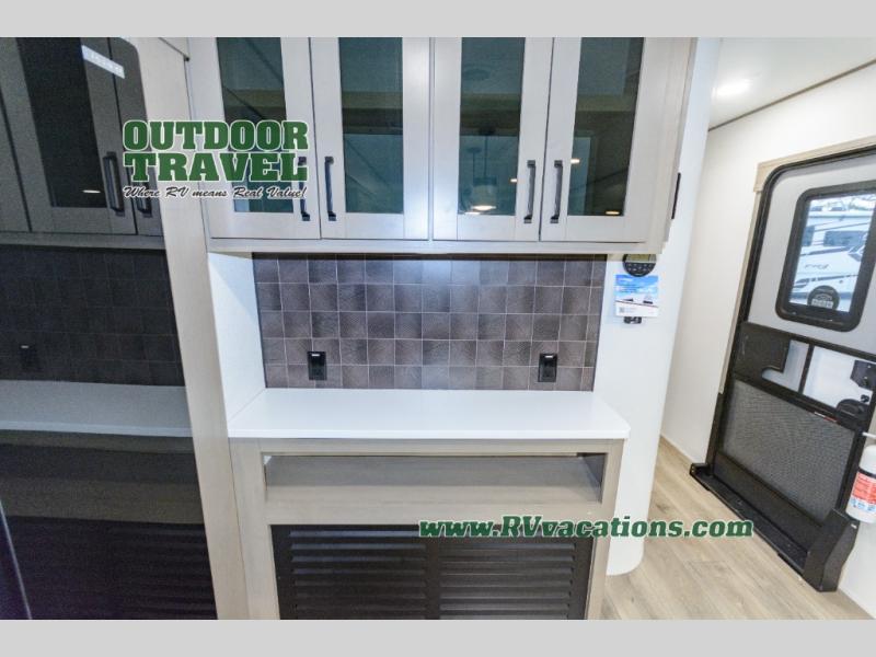 This rear living travel trailer will be perfect for extended stays at the campground or quick weekend trips to the lake! Once you've unloaded your gear from the pass-thru storage, head inside to relax on the rear tri-fold sofa with an adjustable headrest or on the theater seating across from the 40" TV and fireplace. There is also a booth dinette where you can dine together, or you can choose the optional swivel dinette. The spacious kitchen island will make meal time easier than ever, plus there is a pantry and 16 cu. ft. 12V refrigerator for food storage. The full bath is right next to the front private bedroom for easy nighttime use, and speaking of nighttime, you're sure to sleep soundly on the queen bed slide. There is also a large front closet, TV prep, plus washer and dryer prep if you choose to add these appliances.