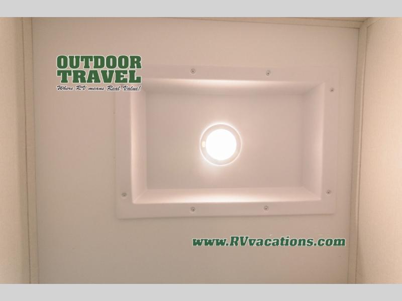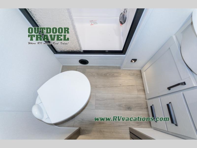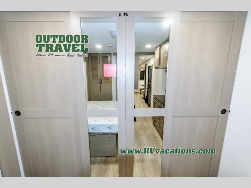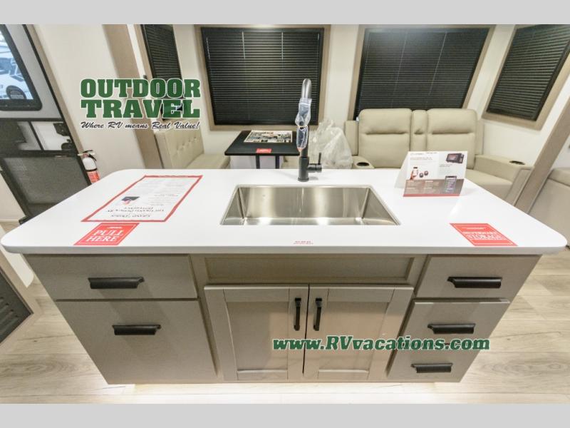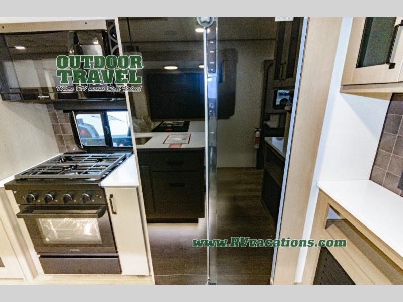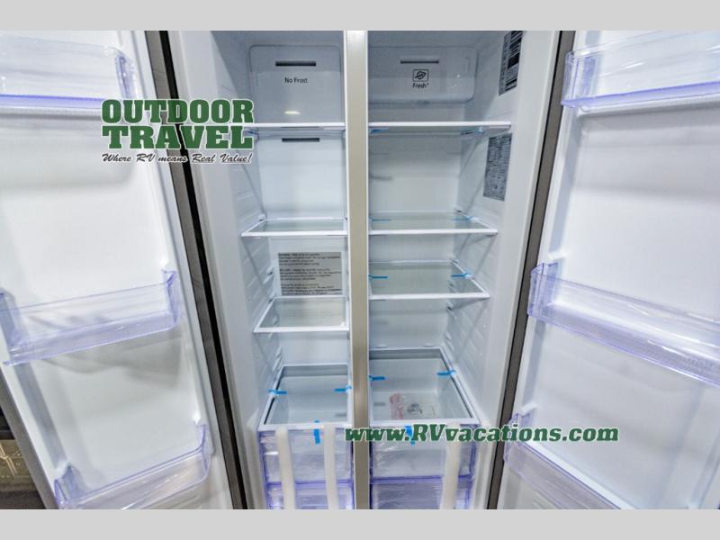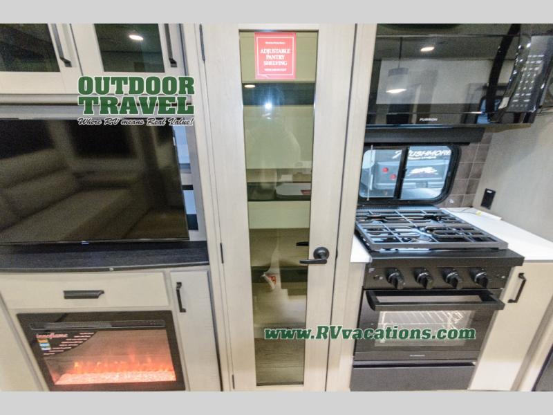This rear living travel trailer will be perfect for extended stays at the campground or quick weekend trips to the lake! Once you've unloaded your gear from the pass-thru storage, head inside to relax on the rear tri-fold sofa with an adjustable headrest or on the theater seating across from the 40" TV and fireplace. There is also a booth dinette where you can dine together, or you can choose the optional swivel dinette. The spacious kitchen island will make meal time easier than ever, plus there is a pantry and 16 cu. ft. 12V refrigerator for food storage. The full bath is right next to the front private bedroom for easy nighttime use, and speaking of nighttime, you're sure to sleep soundly on the queen bed slide. There is also a large front closet, TV prep, plus washer and dryer prep if you choose to add these appliances.