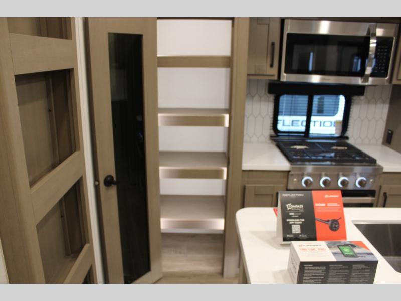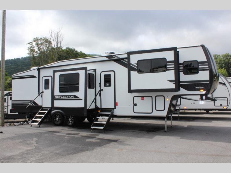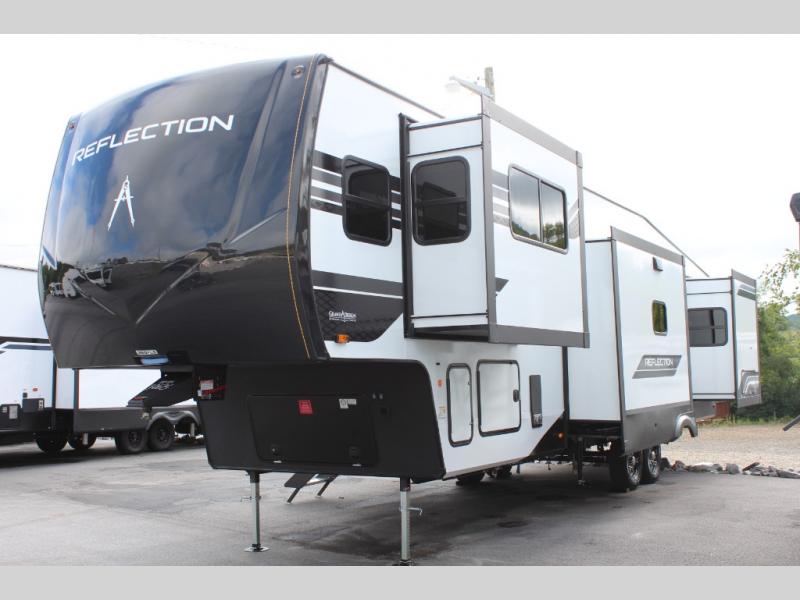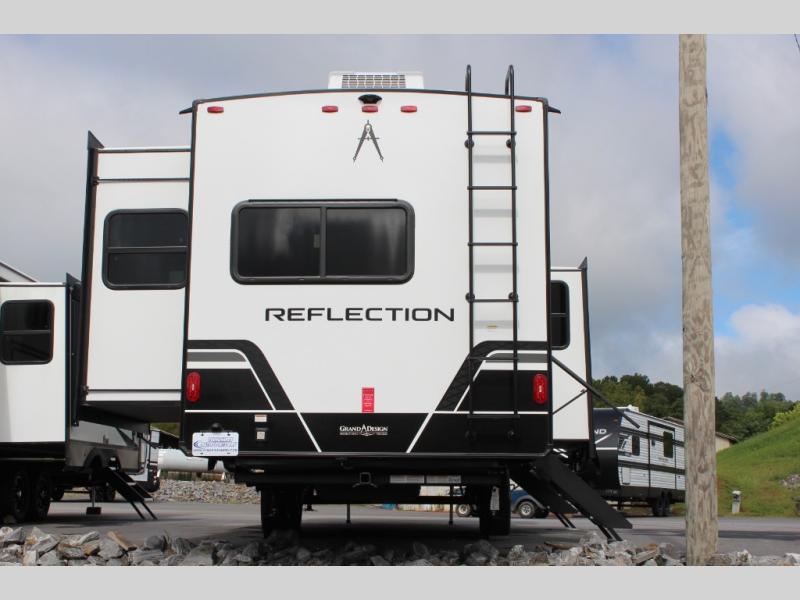 With any Reflection fifth wheel by Grand Design, you will have a solar panel for off-grid camping and a 60 amp charge controller and inverter prep, a Universal All-In-One docking station, unobstructed pass-through storage, and Goodyear Endurance tires. Each is constructed of gel coat exterior sidewalls, residential 5" truss rafters, walk-on roof decking, a fiberglass and radiant foil roof and front cap insulation plus laminated aluminum framed side walls, roof and end walls in slide rooms. Head inside to enjoy residential hardwood cabinet doors, premium Congoleum flooring, a spacious shower with a glass door, and many more comforts!