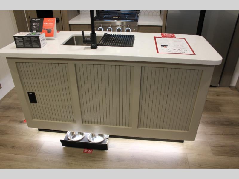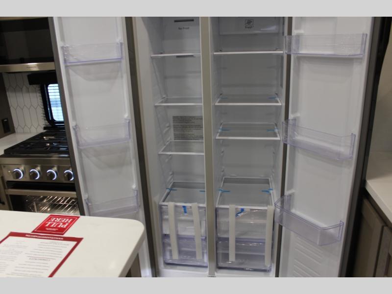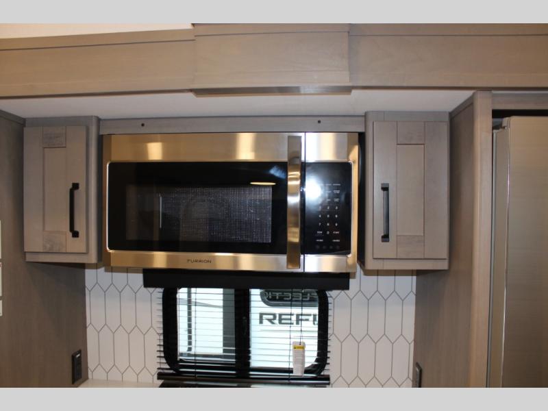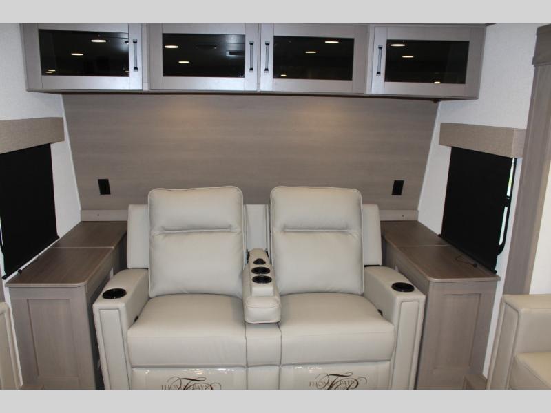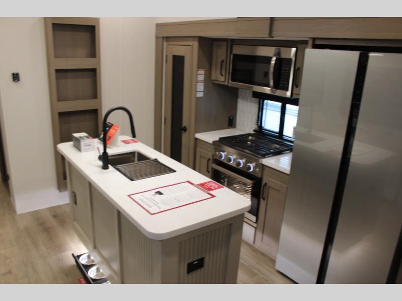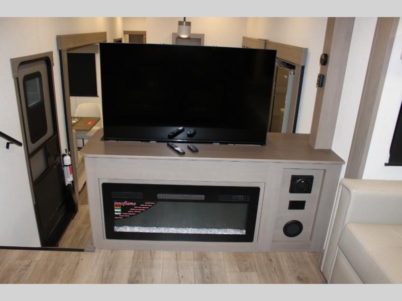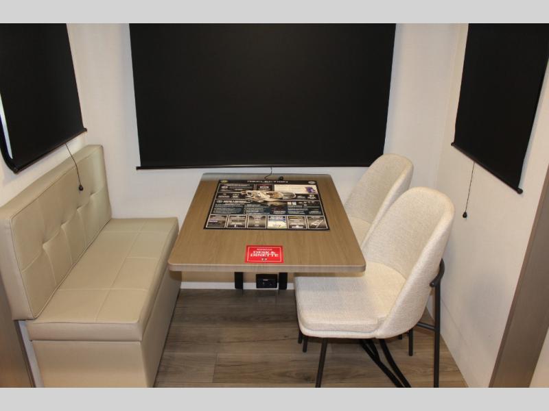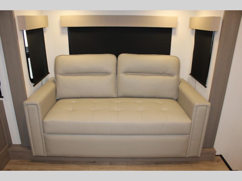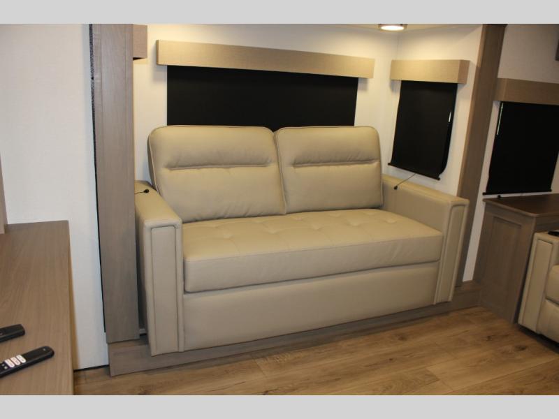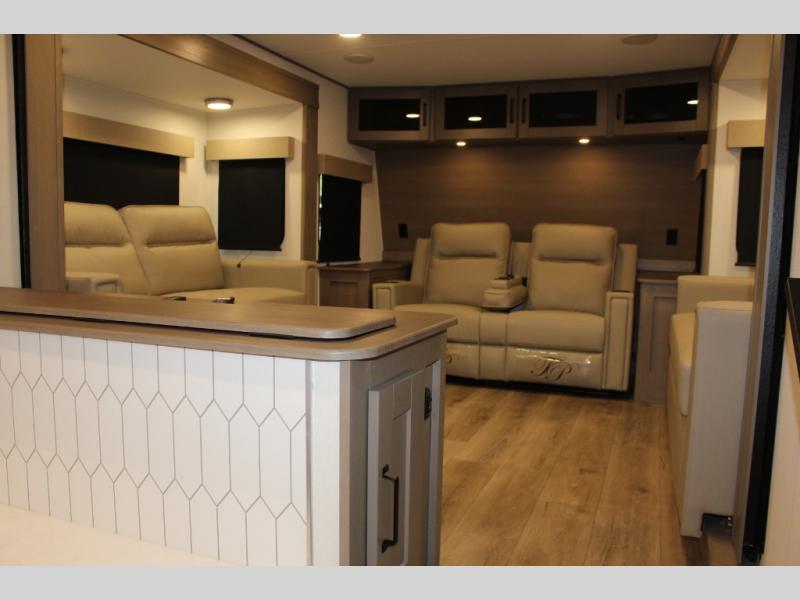 This fifth wheel might be your perfect retreat! The private rear bedroom comes with a standard queen bed, or upgrade to a king for even more room to relax. Up front you'll find a living room perfect for entertaining, with dual tri-fold sofas plus a pair of theater seats. The focal point is the entertainment center which is equipped with a 50" TV on a lift. The central kitchen is well-equipped for cooking, with a 16 cu. ft. refrigerator and a center island. A booth dinette provides great seating, or opt for the swivel dinette.