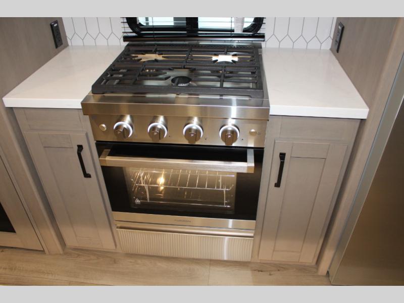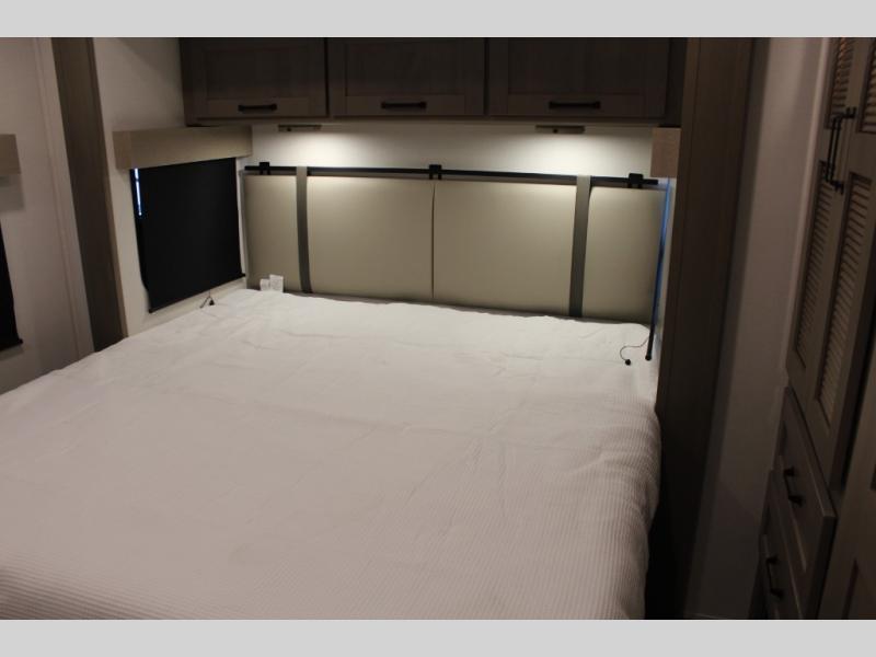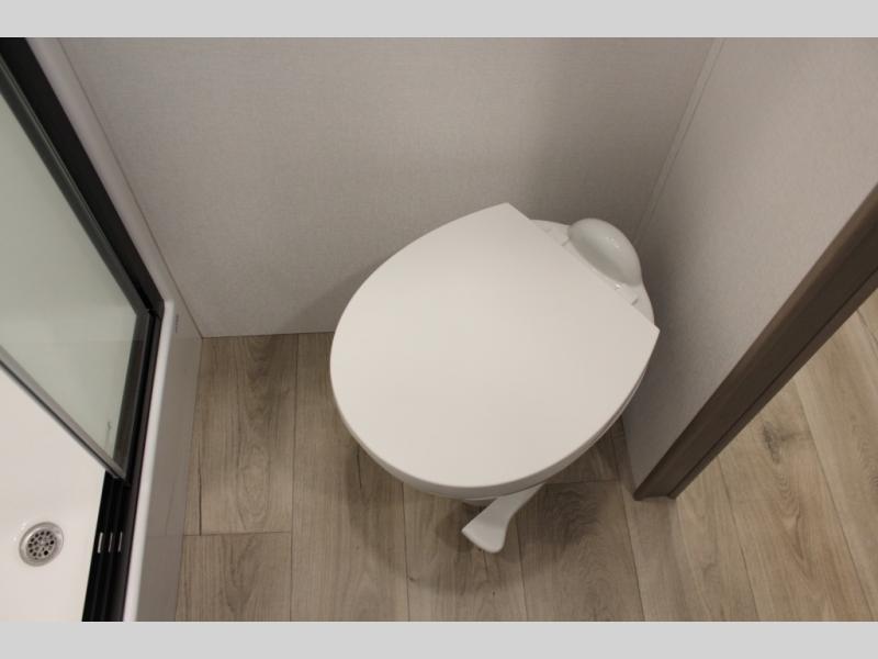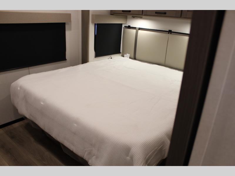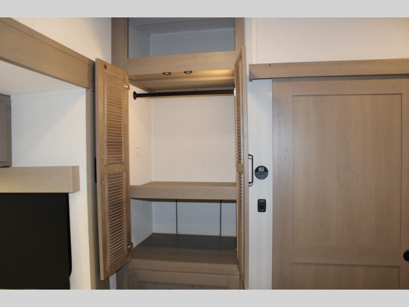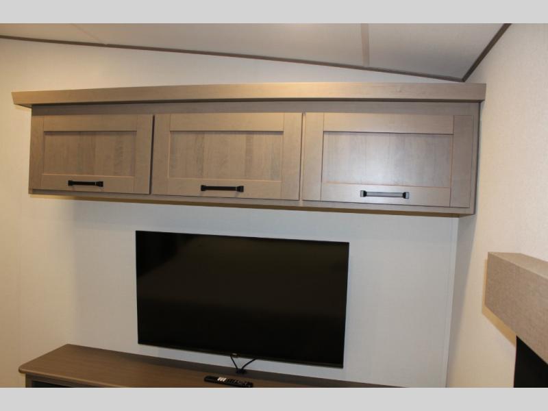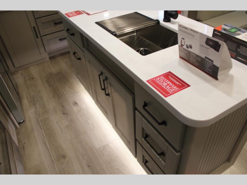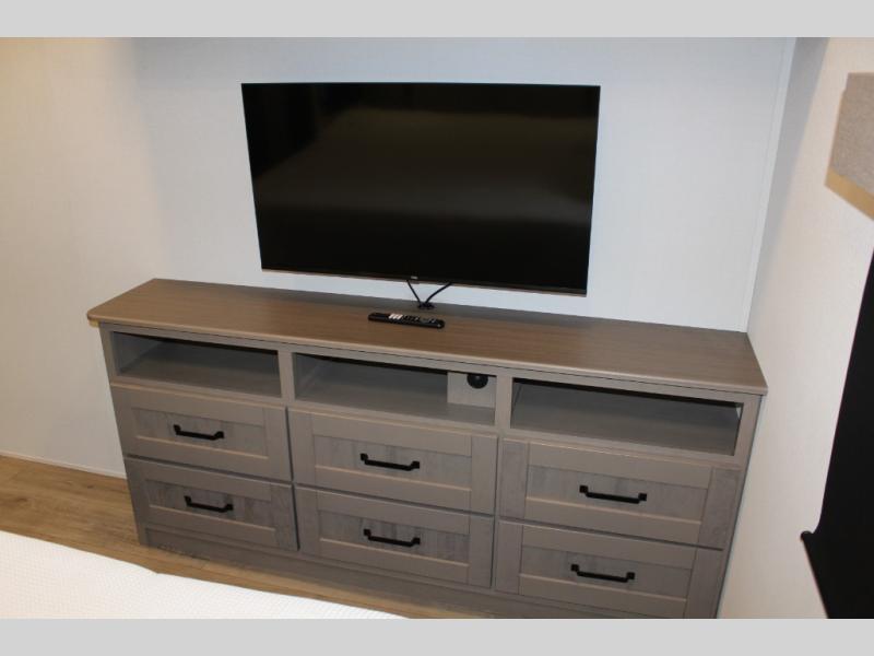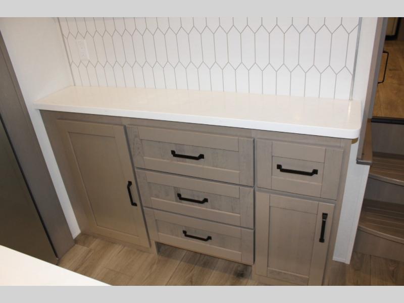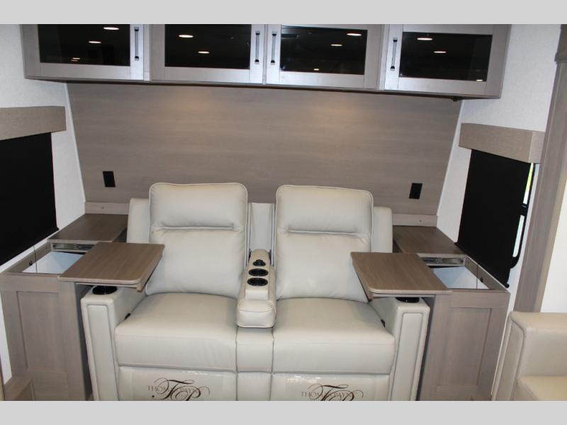 This fifth wheel might be your perfect retreat! The private rear bedroom comes with a standard queen bed, or upgrade to a king for even more room to relax. Up front you'll find a living room perfect for entertaining, with dual tri-fold sofas plus a pair of theater seats. The focal point is the entertainment center which is equipped with a 50" TV on a lift. The central kitchen is well-equipped for cooking, with a 16 cu. ft. refrigerator and a center island. A booth dinette provides great seating, or opt for the swivel dinette.