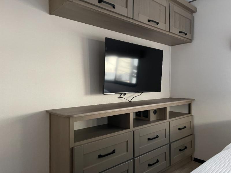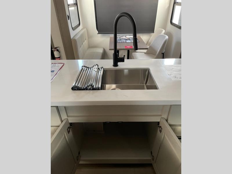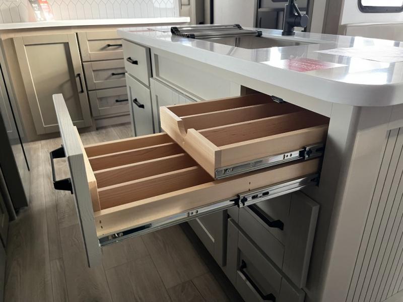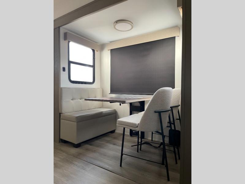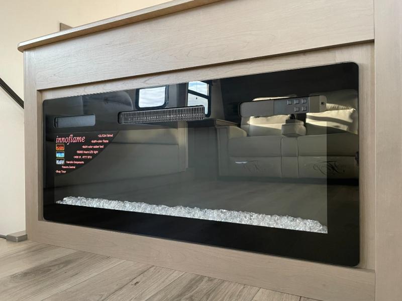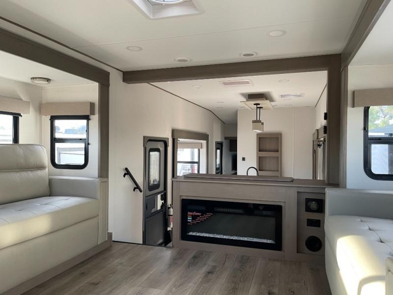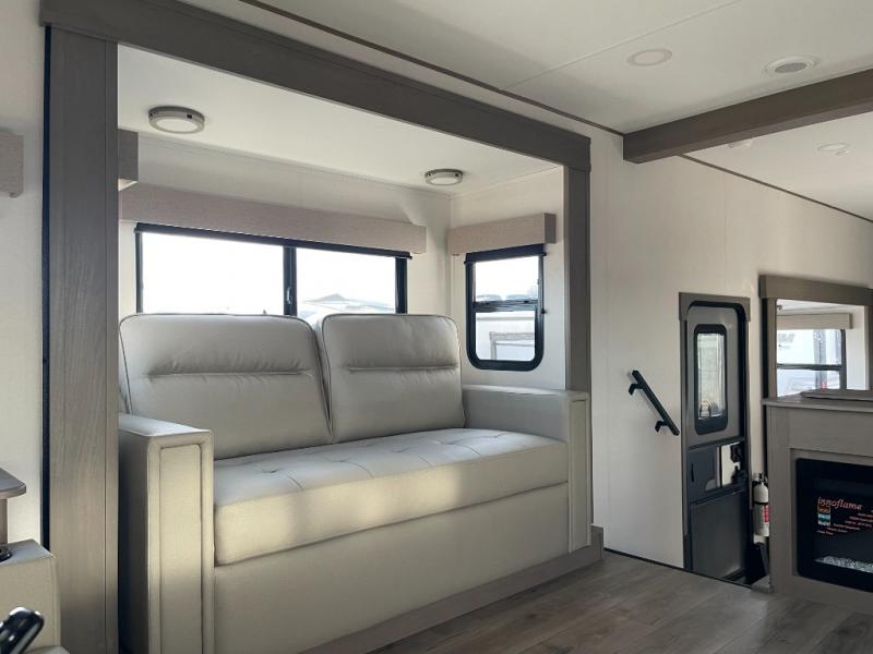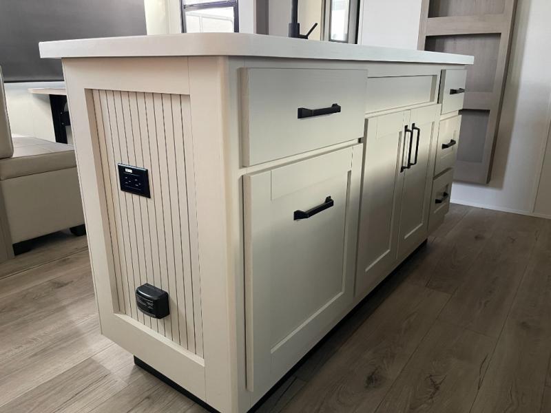 This fifth wheel might be your perfect retreat! The private rear bedroom comes with a standard queen bed, or upgrade to a king for even more room to relax. Up front you'll find a living room perfect for entertaining, with dual tri-fold sofas plus a pair of theater seats. The focal point is the entertainment center which is equipped with a 50" TV on a lift. The central kitchen is well-equipped for cooking, with a 16 cu. ft. refrigerator and a center island. A booth dinette provides great seating, or opt for the swivel dinette.
