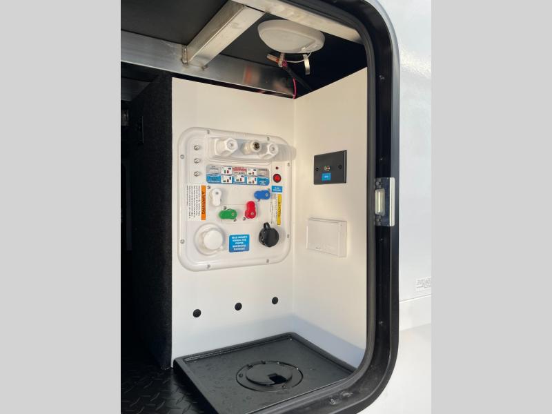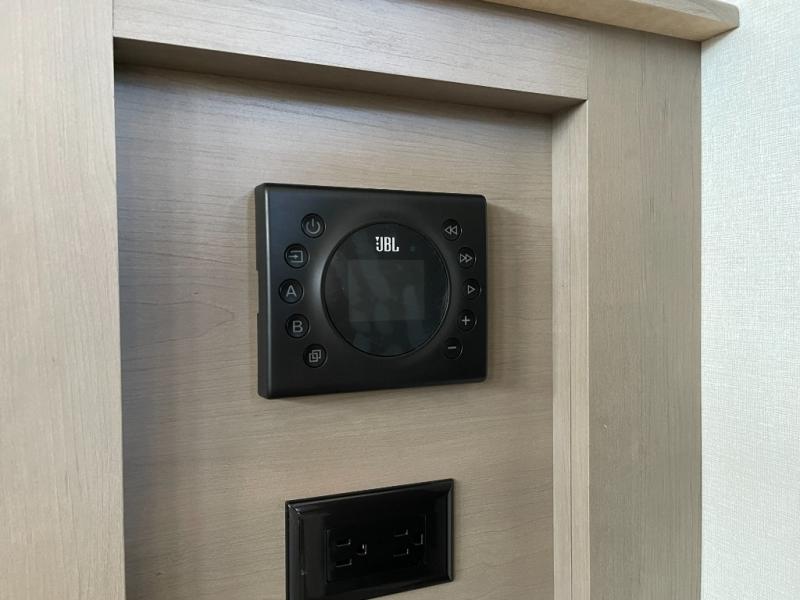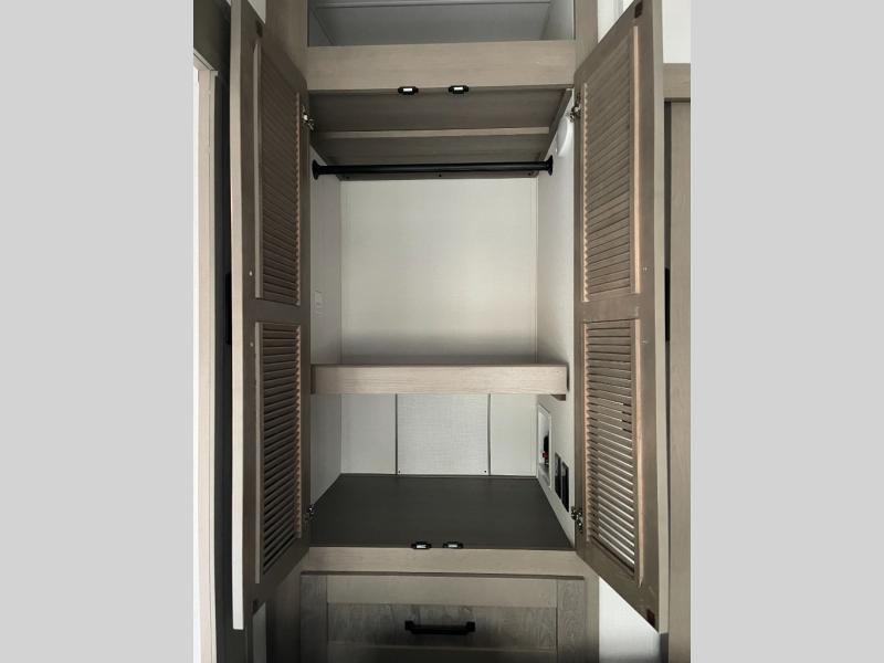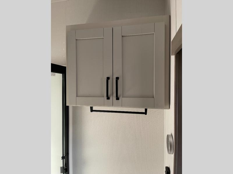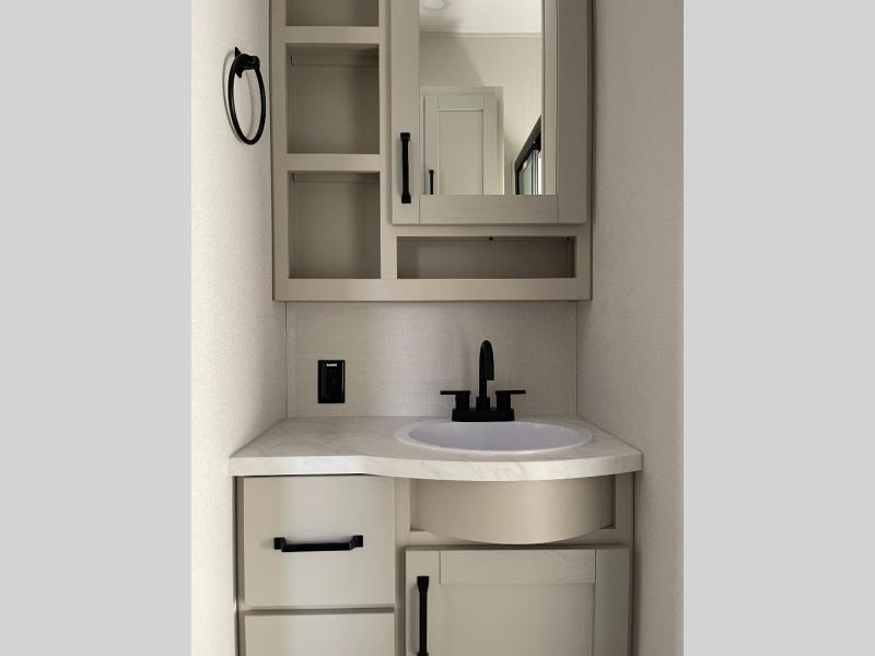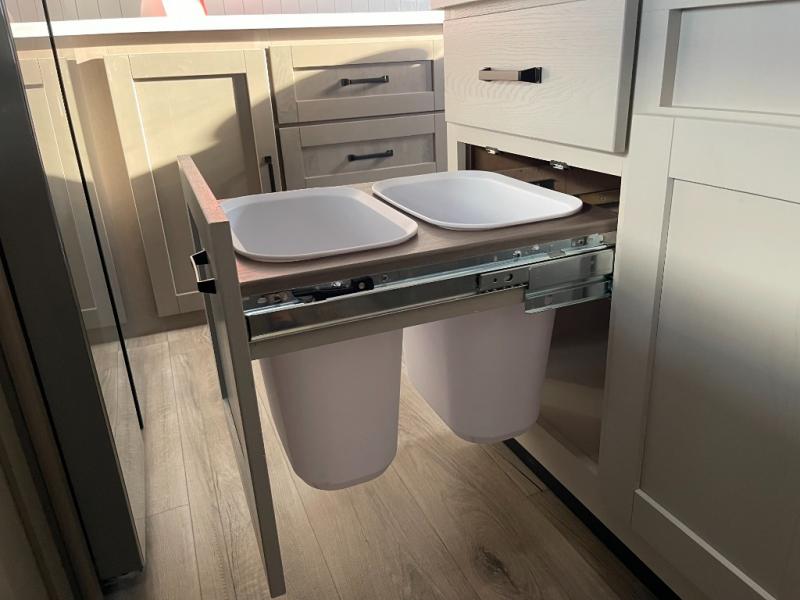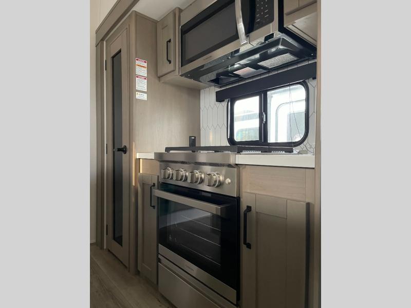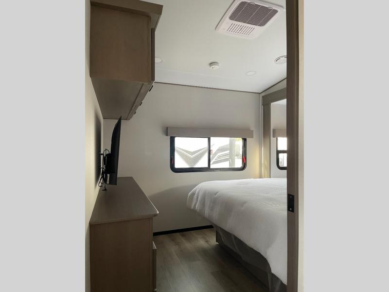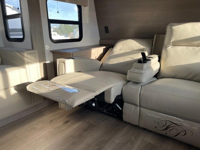 This fifth wheel might be your perfect retreat! The private rear bedroom comes with a standard queen bed, or upgrade to a king for even more room to relax. Up front you'll find a living room perfect for entertaining, with dual tri-fold sofas plus a pair of theater seats. The focal point is the entertainment center which is equipped with a 50" TV on a lift. The central kitchen is well-equipped for cooking, with a 16 cu. ft. refrigerator and a center island. A booth dinette provides great seating, or opt for the swivel dinette.