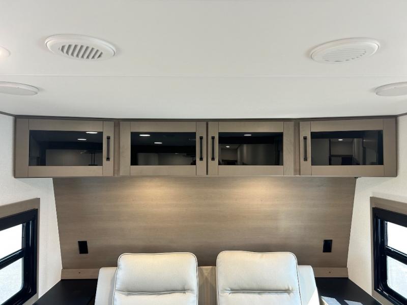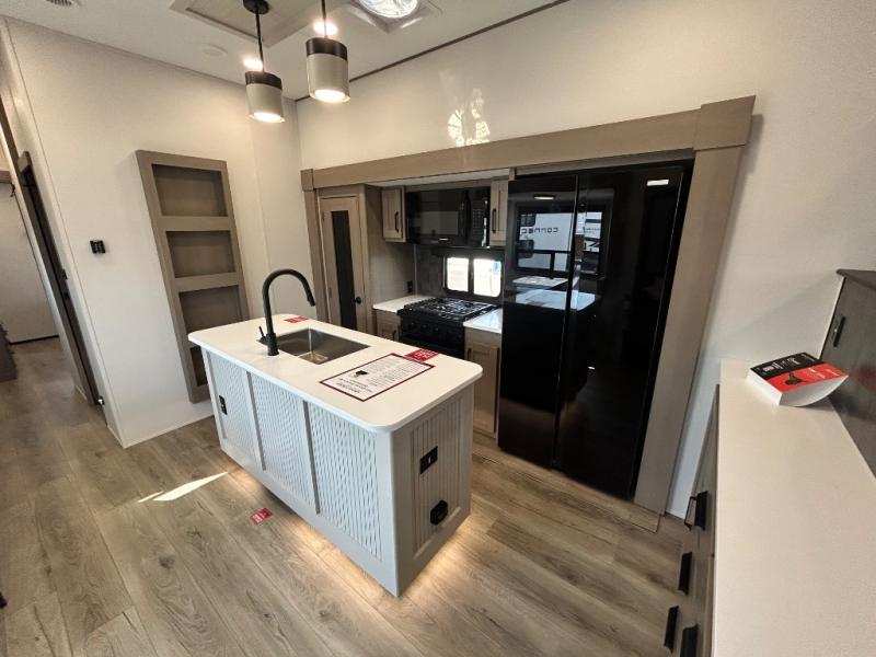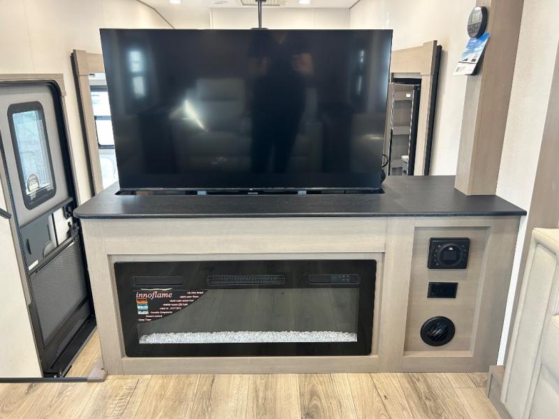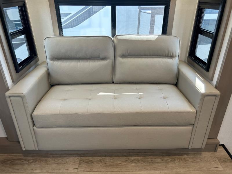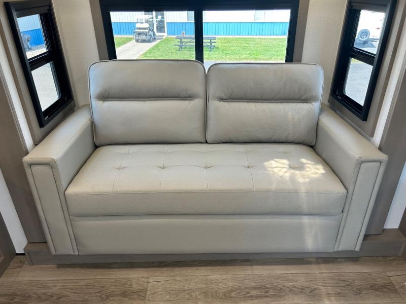 This fifth wheel might be your perfect retreat! The private rear bedroom comes with a standard queen bed, or upgrade to a king for even more room to relax. Up front you'll find a living room perfect for entertaining, with dual tri-fold sofas plus a pair of theater seats. The focal point is the entertainment center which is equipped with a 50" TV on a lift. The central kitchen is well-equipped for cooking, with a 16 cu. ft. refrigerator and a center island. A booth dinette provides great seating, or opt for the swivel dinette.