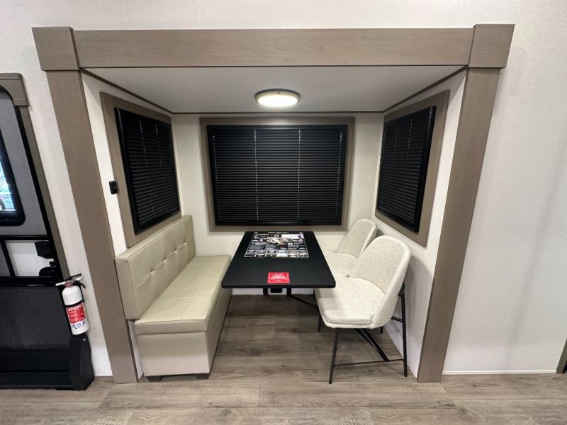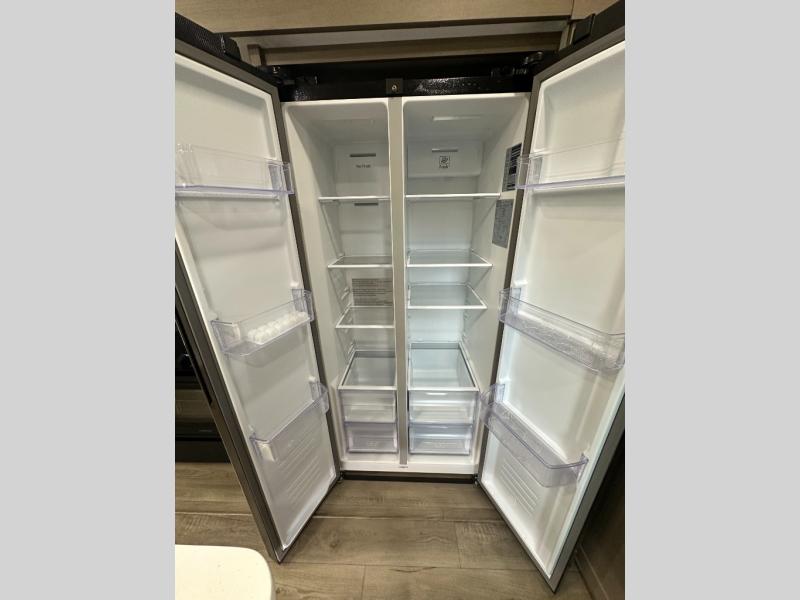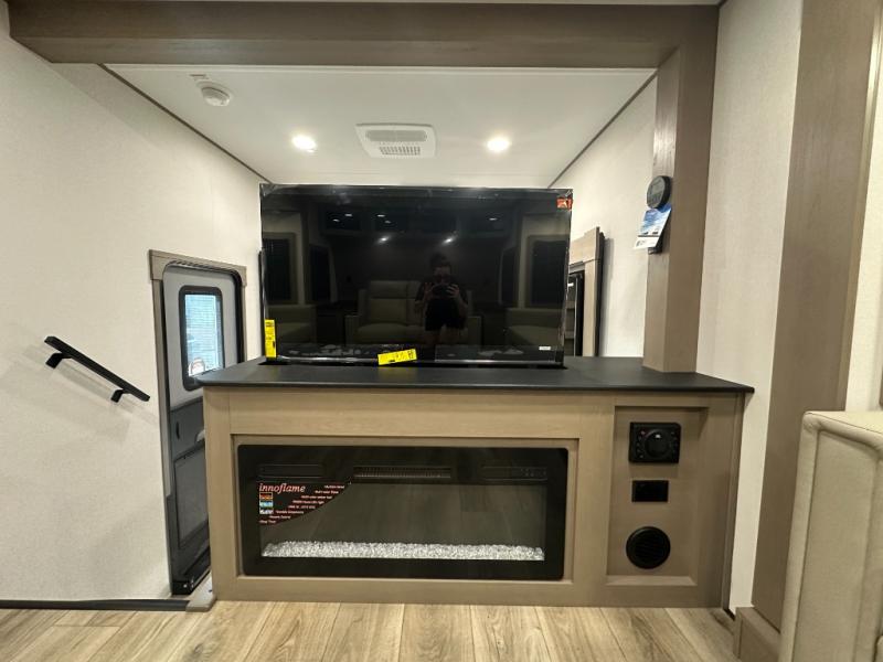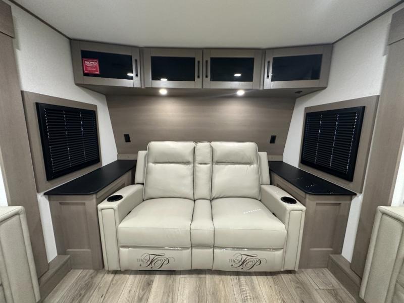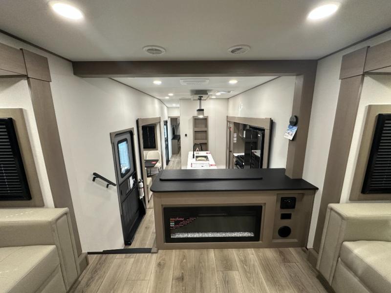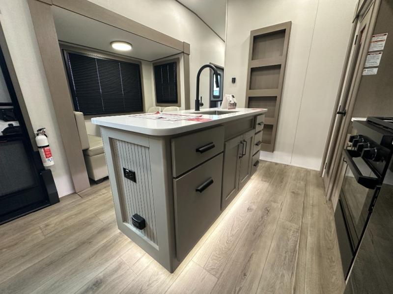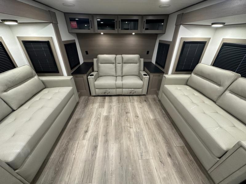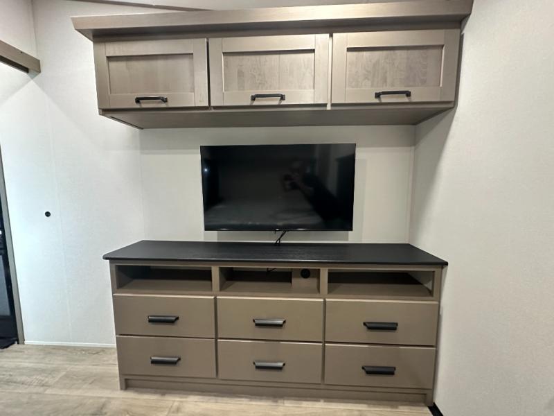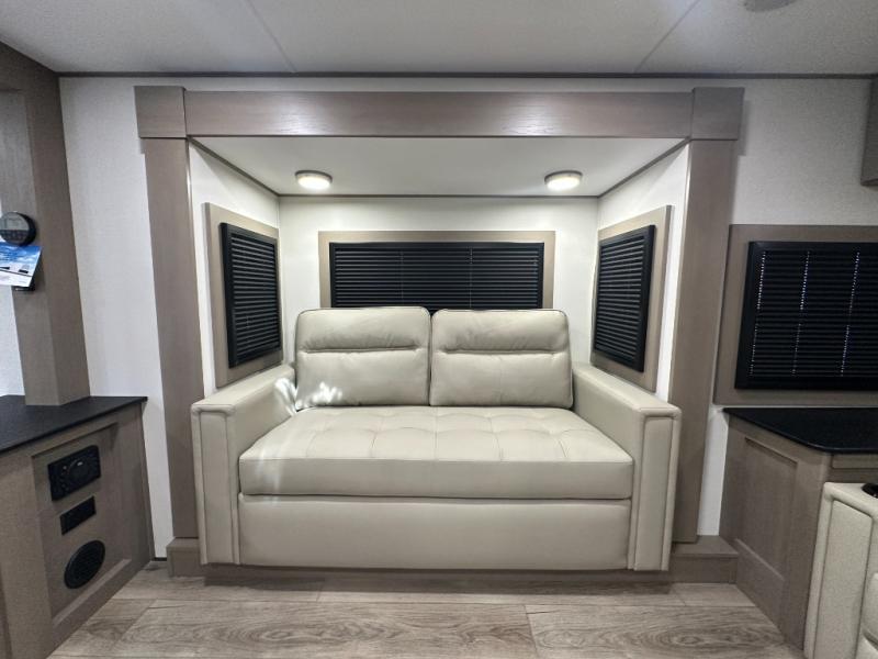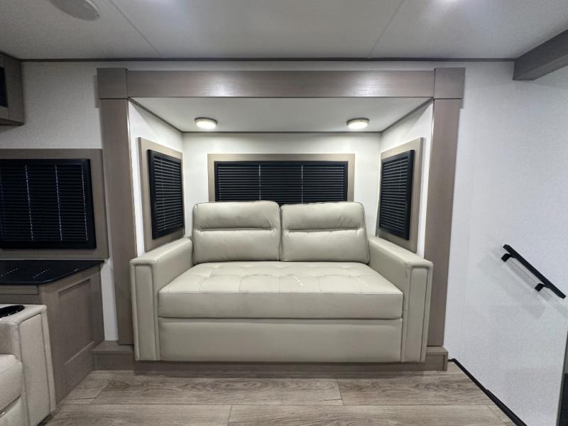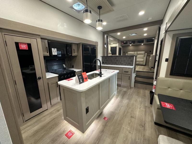 This fifth wheel might be your perfect retreat! The private rear bedroom comes with a standard queen bed, or upgrade to a king for even more room to relax. Up front you'll find a living room perfect for entertaining, with dual tri-fold sofas plus a pair of theater seats. The focal point is the entertainment center which is equipped with a 50" TV on a lift. The central kitchen is well-equipped for cooking, with a 16 cu. ft. refrigerator and a center island. A booth dinette provides great seating, or opt for the swivel dinette.