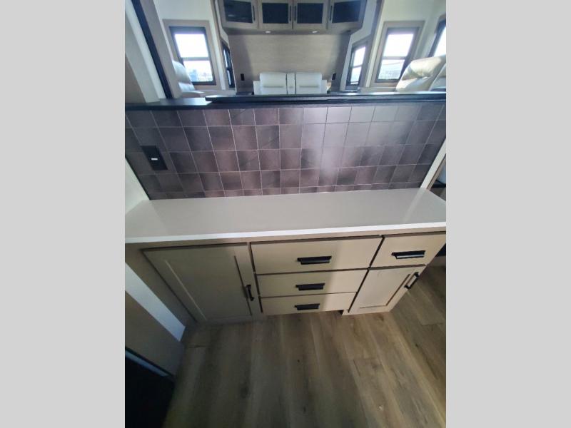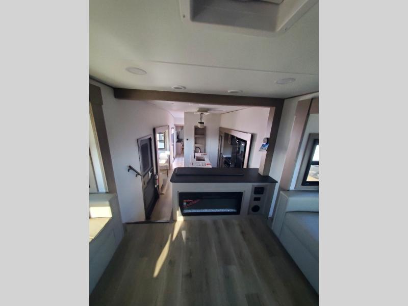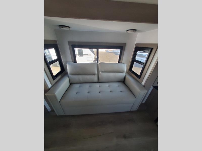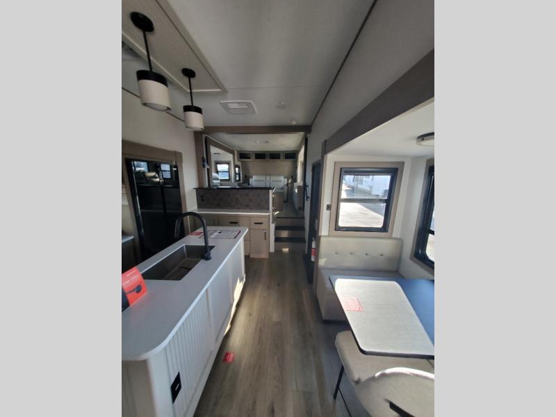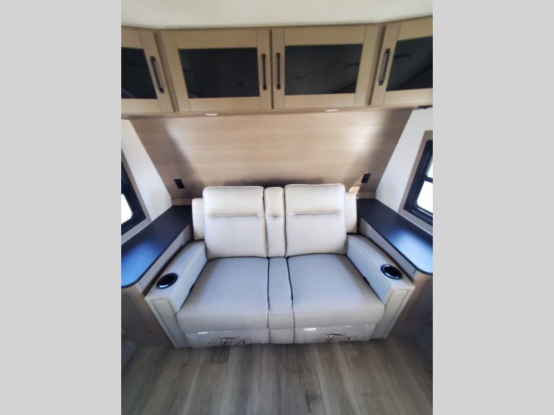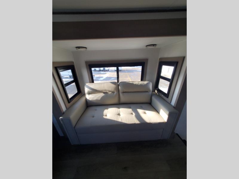 This fifth wheel might be your perfect retreat! The private rear bedroom comes with a standard queen bed, or upgrade to a king for even more room to relax. Up front you'll find a living room perfect for entertaining, with dual tri-fold sofas plus a pair of theater seats. The focal point is the entertainment center which is equipped with a 50" TV on a lift. The central kitchen is well-equipped for cooking, with a 16 cu. ft. refrigerator and a center island. A booth dinette provides great seating, or opt for the swivel dinette.