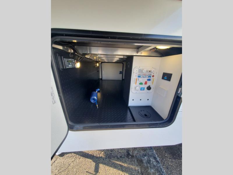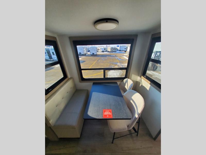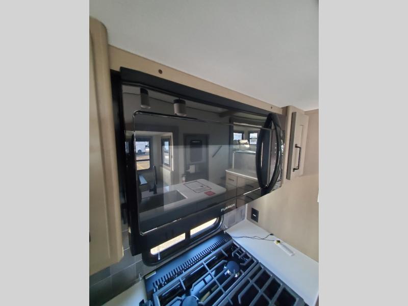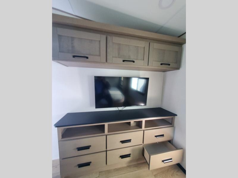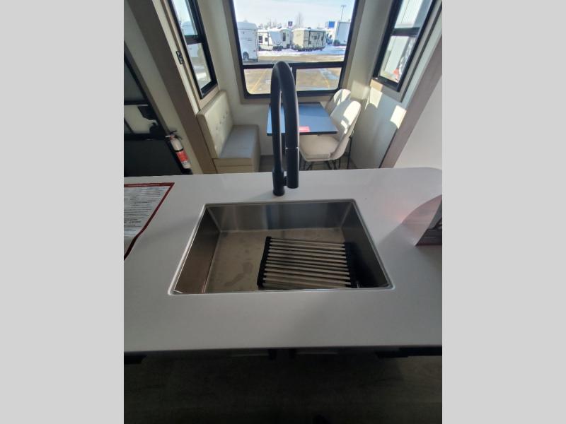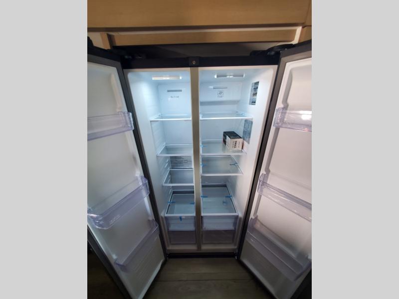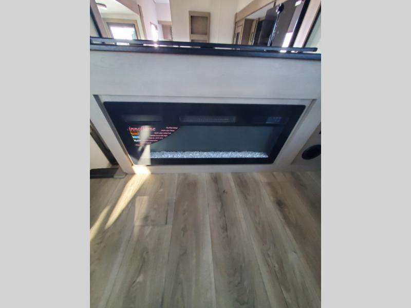 This fifth wheel might be your perfect retreat! The private rear bedroom comes with a standard queen bed, or upgrade to a king for even more room to relax. Up front you'll find a living room perfect for entertaining, with dual tri-fold sofas plus a pair of theater seats. The focal point is the entertainment center which is equipped with a 50" TV on a lift. The central kitchen is well-equipped for cooking, with a 16 cu. ft. refrigerator and a center island. A booth dinette provides great seating, or opt for the swivel dinette.