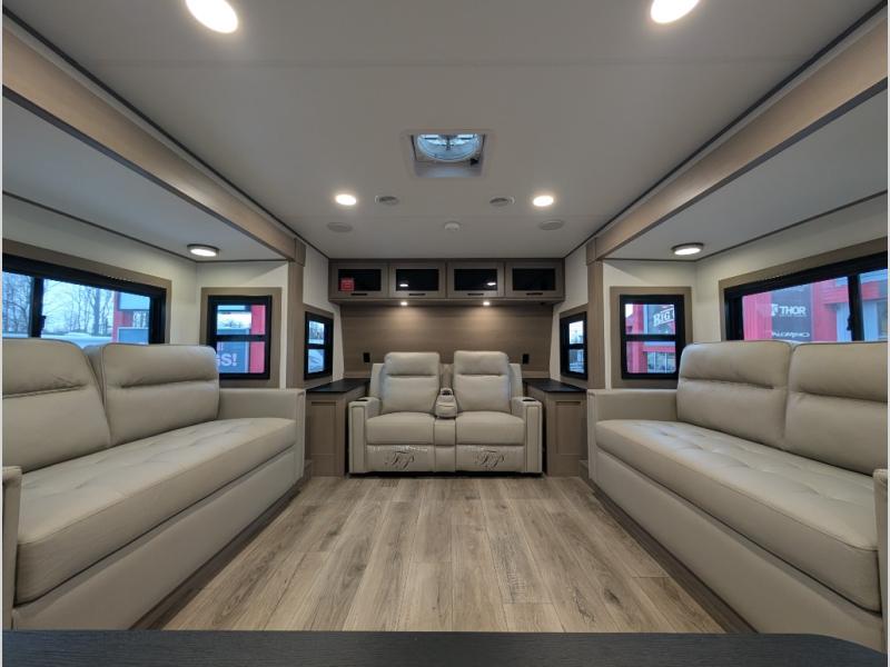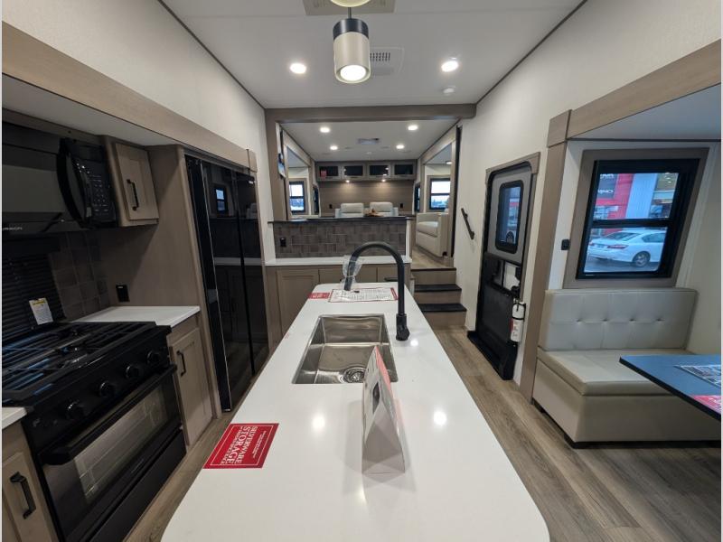 This fifth wheel might be your perfect retreat! The private rear bedroom comes with a standard queen bed, or upgrade to a king for even more room to relax. Up front you'll find a living room perfect for entertaining, with dual tri-fold sofas plus a pair of theater seats. The focal point is the entertainment center which is equipped with a 50" TV on a lift. The central kitchen is well-equipped for cooking, with a 16 cu. ft. refrigerator and a center island. A booth dinette provides great seating, or opt for the swivel dinette.