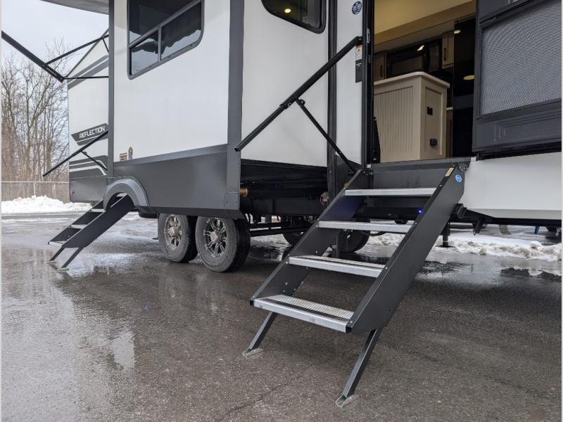 With any Reflection fifth wheel by Grand Design, you will have a solar panel for off-grid camping and a 60 amp charge controller and inverter prep, a Universal All-In-One docking station, unobstructed pass-through storage, and Goodyear Endurance tires. Each is constructed of gel coat exterior sidewalls, residential 5" truss rafters, walk-on roof decking, a fiberglass and radiant foil roof and front cap insulation plus laminated aluminum framed side walls, roof and end walls in slide rooms. Head inside to enjoy residential hardwood cabinet doors, premium Congoleum flooring, a spacious shower with a glass door, and many more comforts!