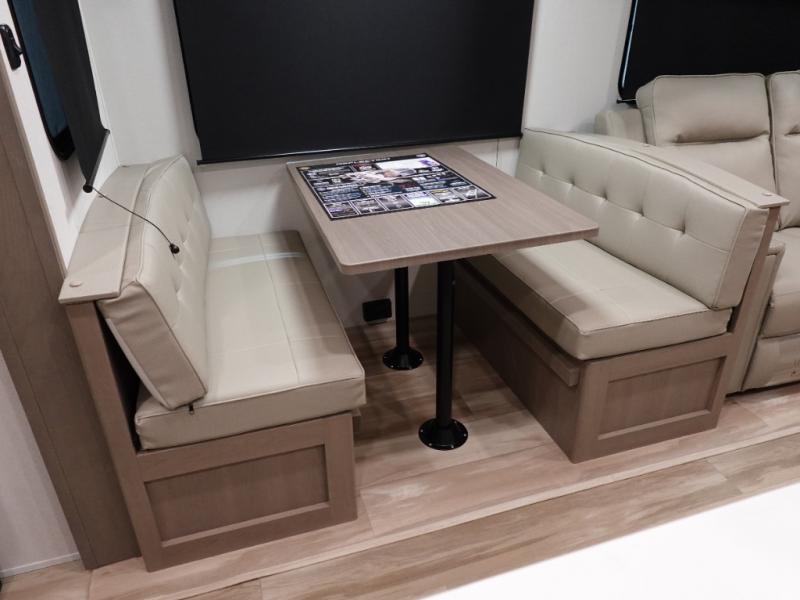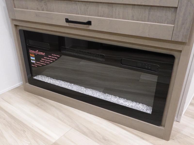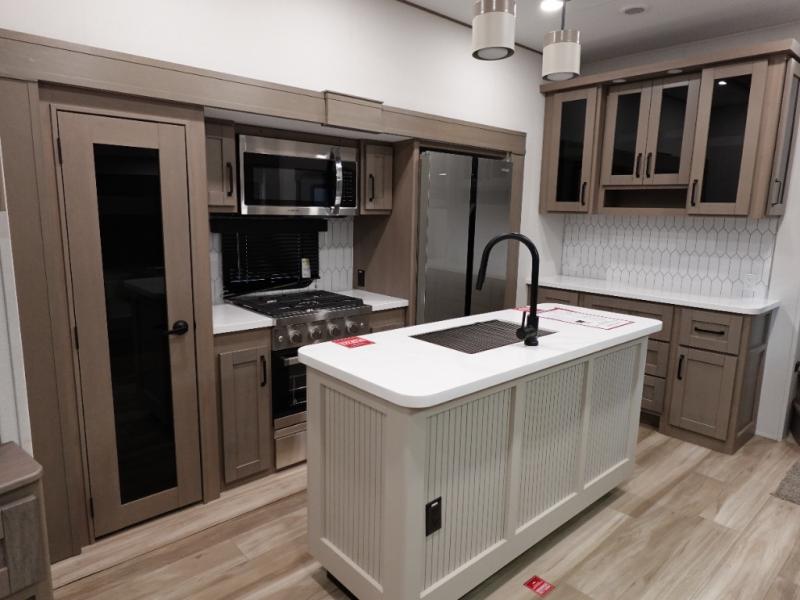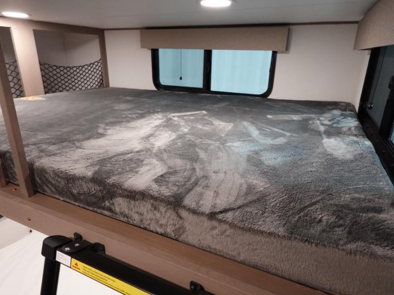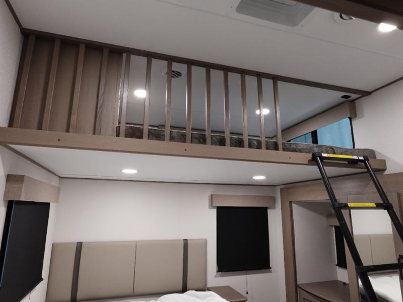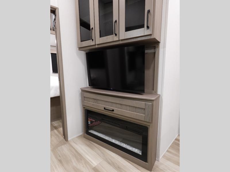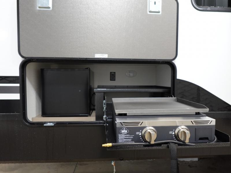 There is a whole lot to love about this fifth wheel! The front private bedroom has a queen bed to lay your head on at night, a slide with drawers and a linen closet, and even an entrance into the dual entry bathroom. The second private bedroom has a 54" x 74" top bed above a queen bed, a slide with a closet and drawers, and its very own half bathroom. The chef will have an easy time preparing delicious home cooked meals with the kitchen island, plus there is an outside kitchen complete with a 4.1 cu. ft. refrigerator to enjoy a cold beverage while you grill on the griddle. Enjoy a relaxing evening indoors either playing games at the booth dinette or on the theater seating across from the entertainment center with a fireplace and 40" TV.