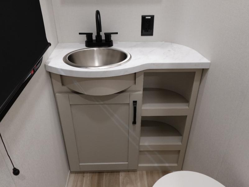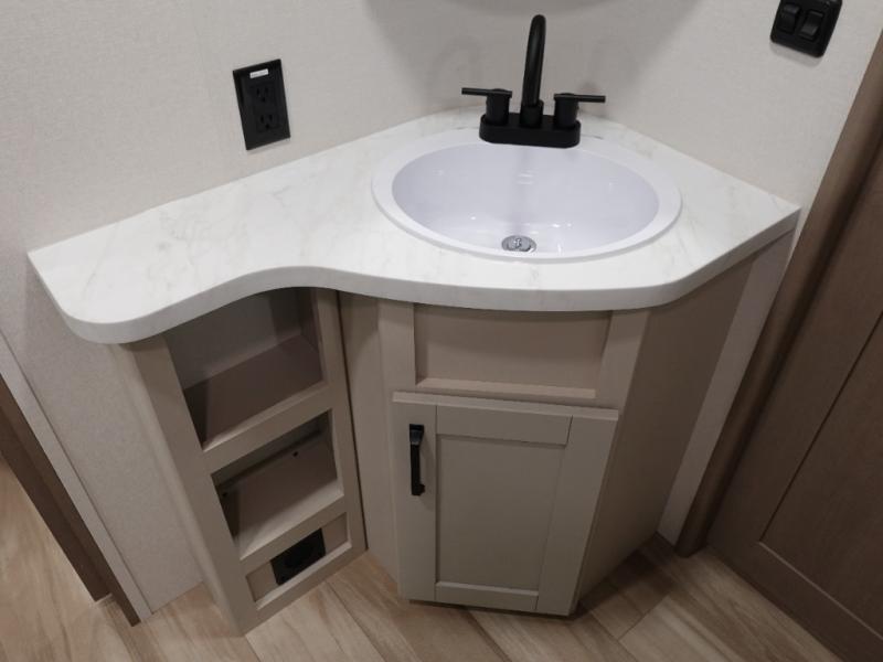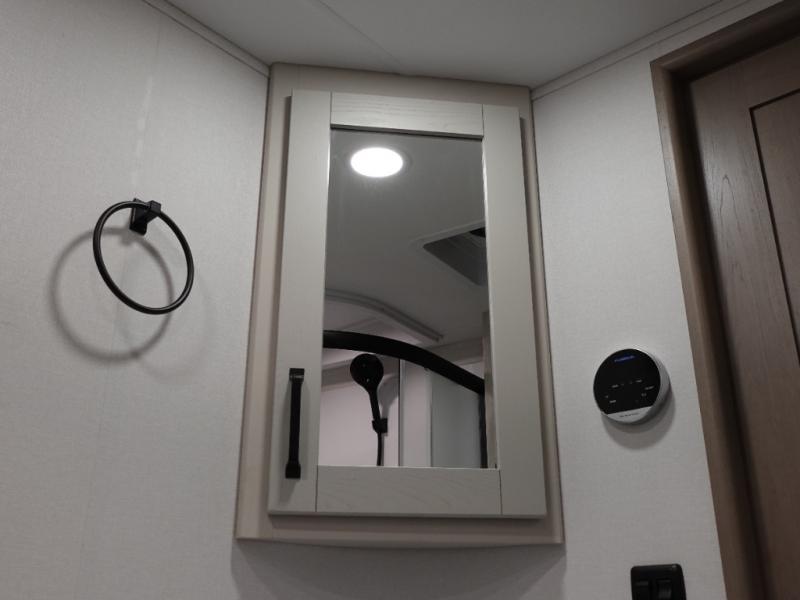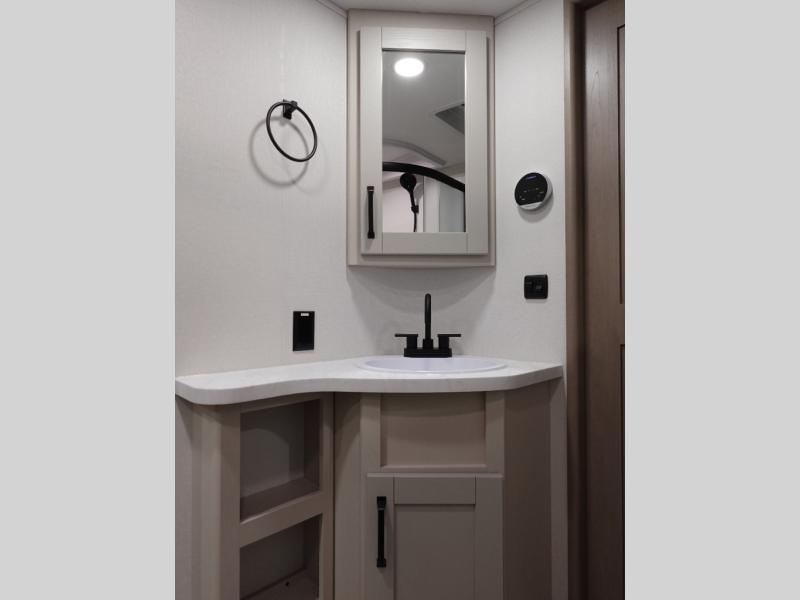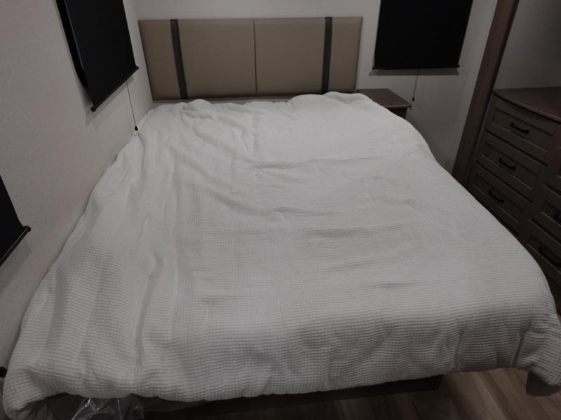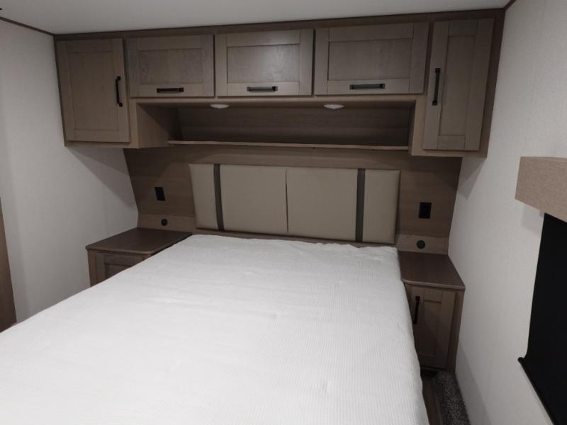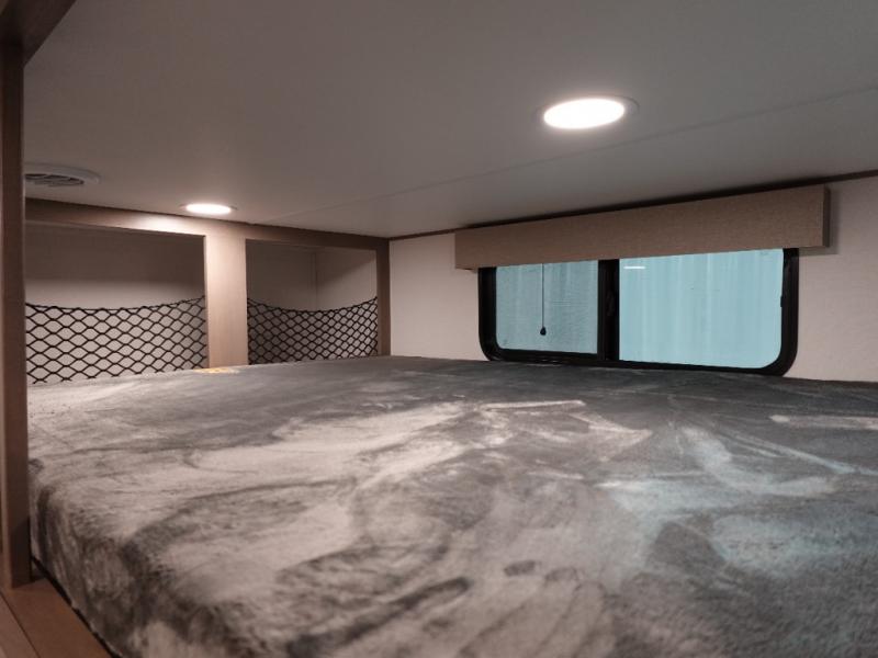 There is a whole lot to love about this fifth wheel! The front private bedroom has a queen bed to lay your head on at night, a slide with drawers and a linen closet, and even an entrance into the dual entry bathroom. The second private bedroom has a 54" x 74" top bed above a queen bed, a slide with a closet and drawers, and its very own half bathroom. The chef will have an easy time preparing delicious home cooked meals with the kitchen island, plus there is an outside kitchen complete with a 4.1 cu. ft. refrigerator to enjoy a cold beverage while you grill on the griddle. Enjoy a relaxing evening indoors either playing games at the booth dinette or on the theater seating across from the entertainment center with a fireplace and 40" TV.