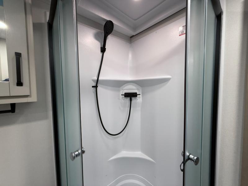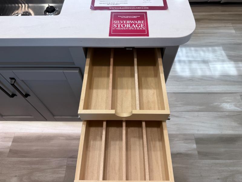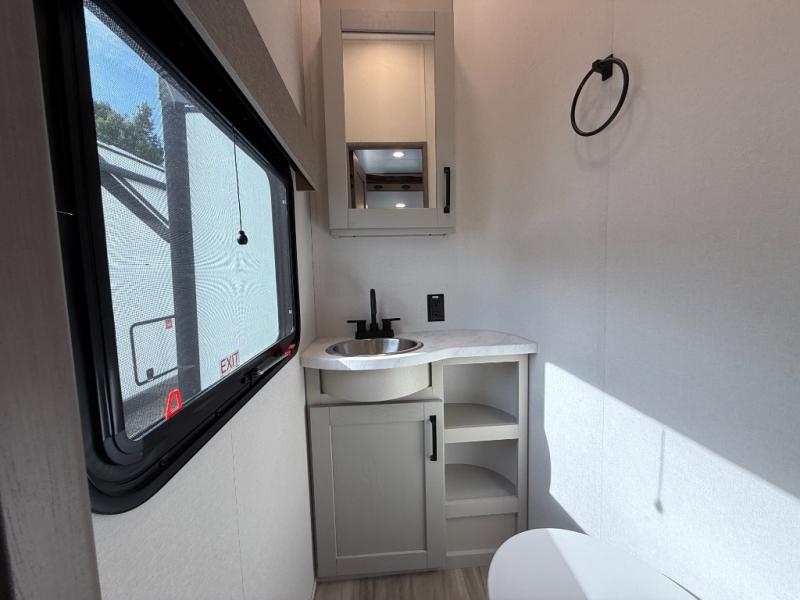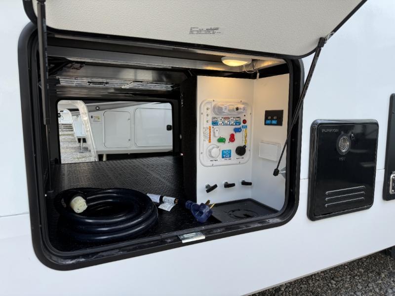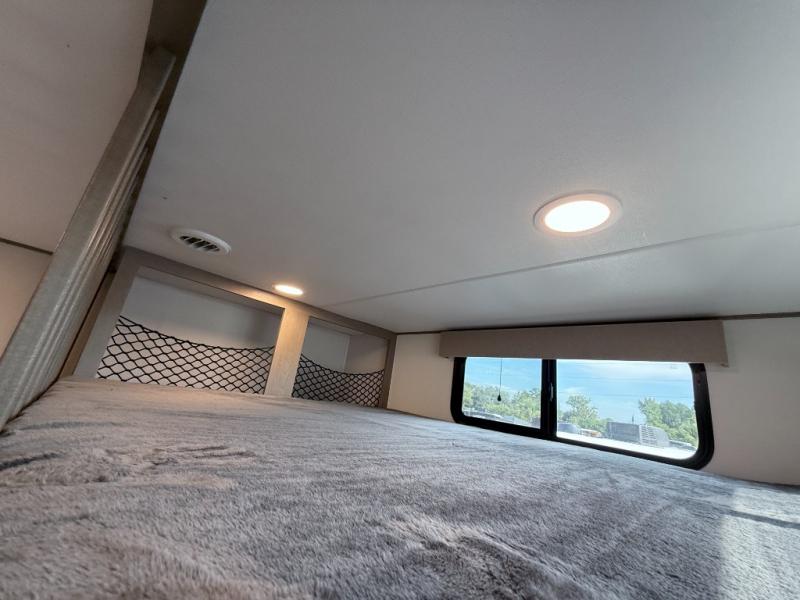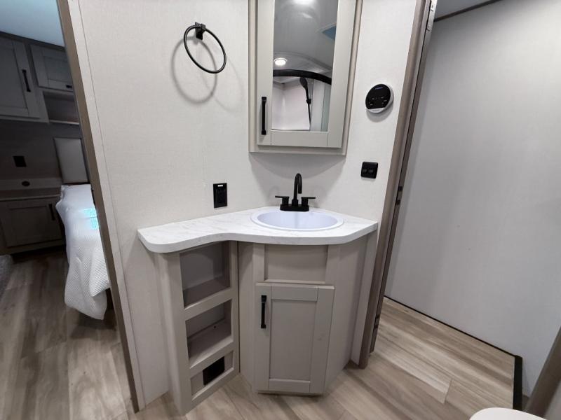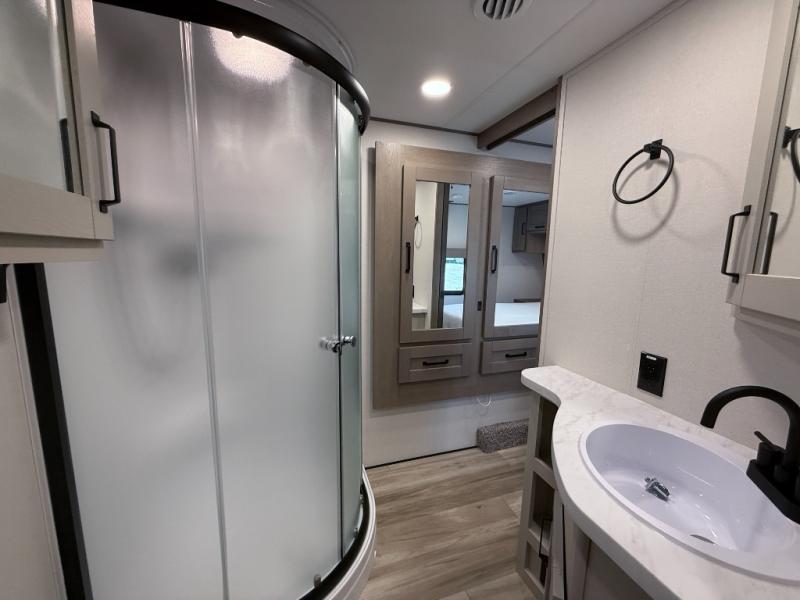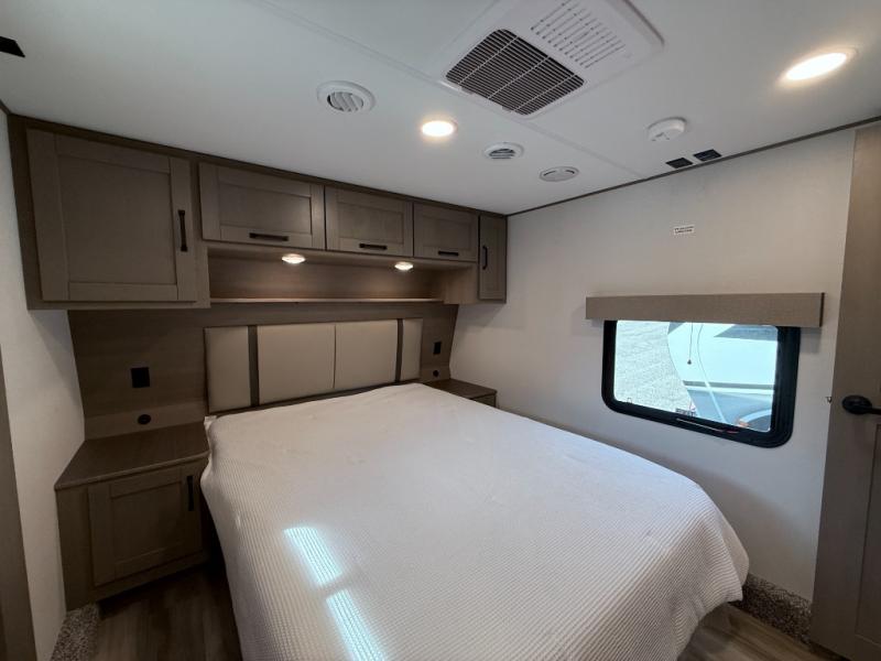 - Front private bedroom with queen bed, slide-out storage, and dual-entry full bath