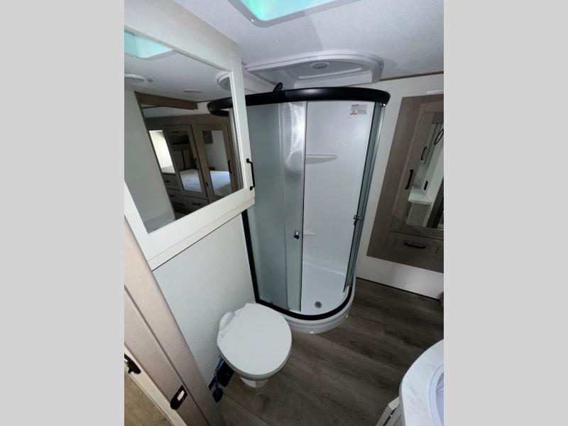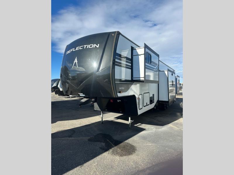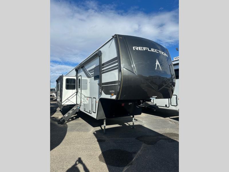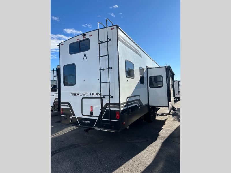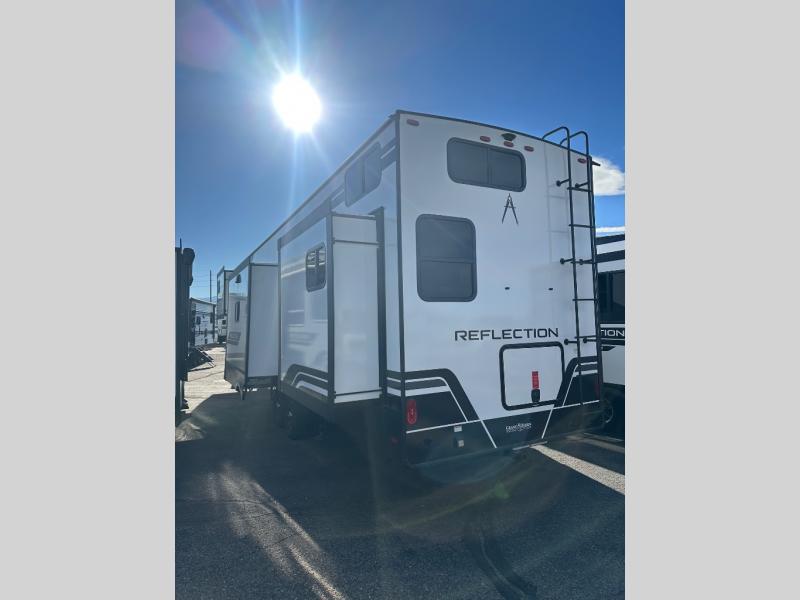 With any Reflection fifth wheel by Grand Design, you will have a solar panel for off-grid camping and a 60 amp charge controller and inverter prep, a Universal All-In-One docking station, unobstructed pass-through storage, and Goodyear Endurance tires. Each is constructed of gel coat exterior sidewalls, residential 5" truss rafters, walk-on roof decking, a fiberglass and radiant foil roof and front cap insulation plus laminated aluminum framed side walls, roof and end walls in slide rooms. Head inside to enjoy residential hardwood cabinet doors, premium Congoleum flooring, a spacious shower with a glass door, and many more comforts!
