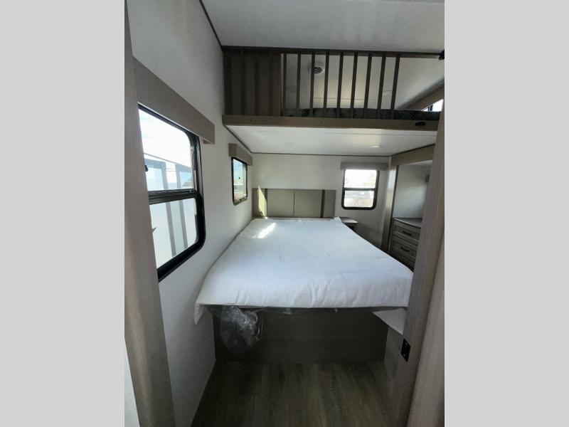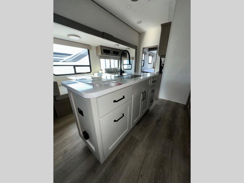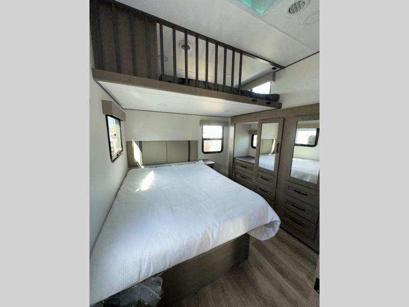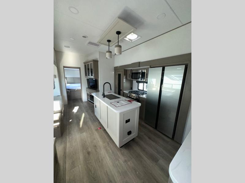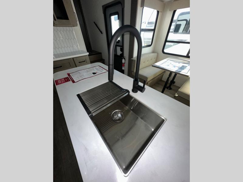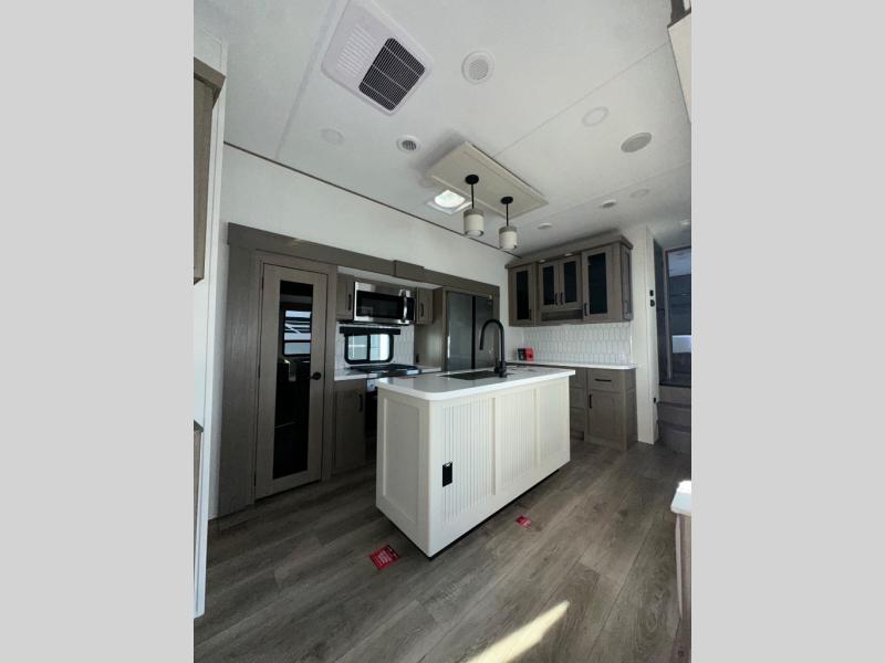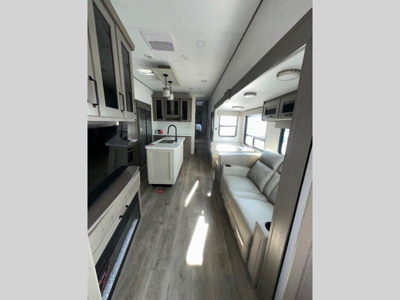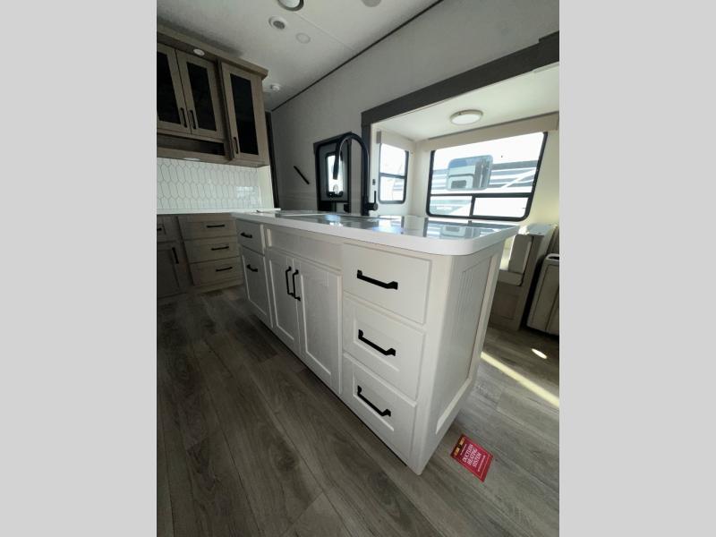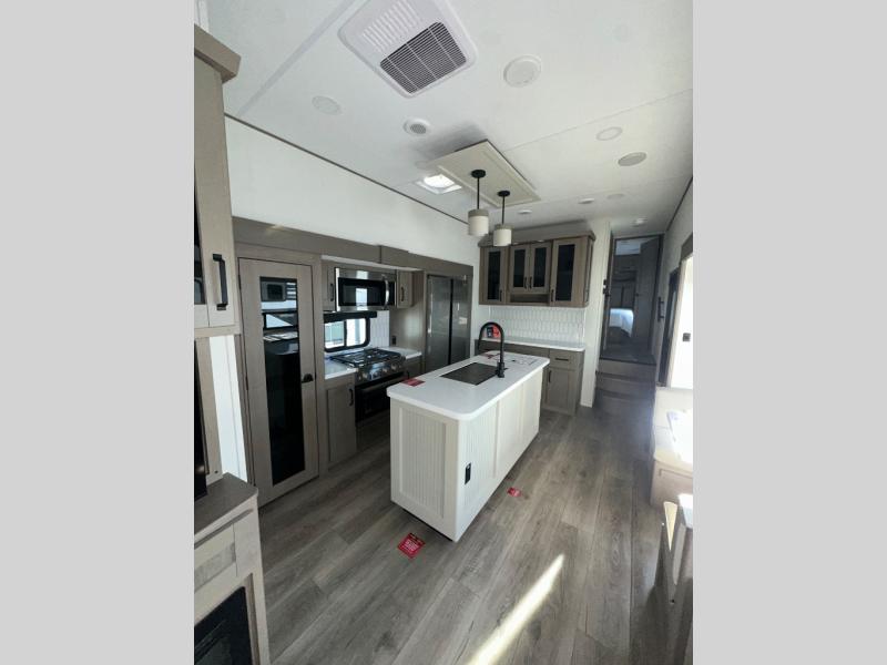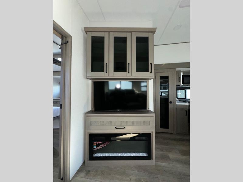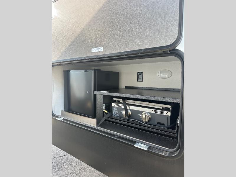 There is a whole lot to love about this fifth wheel! The front private bedroom has a queen bed to lay your head on at night, a slide with drawers and a linen closet, and even an entrance into the dual entry bathroom. The second private bedroom has a 54" x 74" top bed above a queen bed, a slide with a closet and drawers, and its very own half bathroom. The chef will have an easy time preparing delicious home cooked meals with the kitchen island, plus there is an outside kitchen complete with a 4.1 cu. ft. refrigerator to enjoy a cold beverage while you grill on the griddle. Enjoy a relaxing evening indoors either playing games at the booth dinette or on the theater seating across from the entertainment center with a fireplace and 40" TV. You could even switch out the seating for an optional tri-fold sofa or the dinette for an optional swivel dinette!
