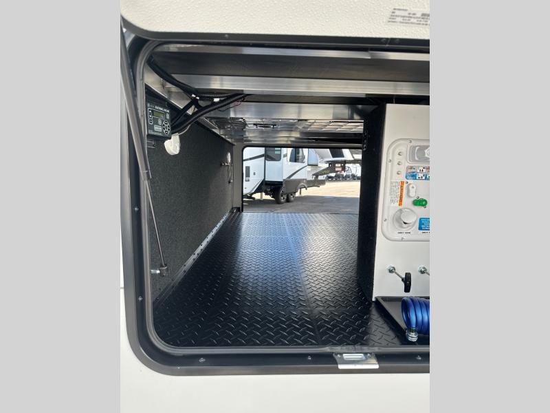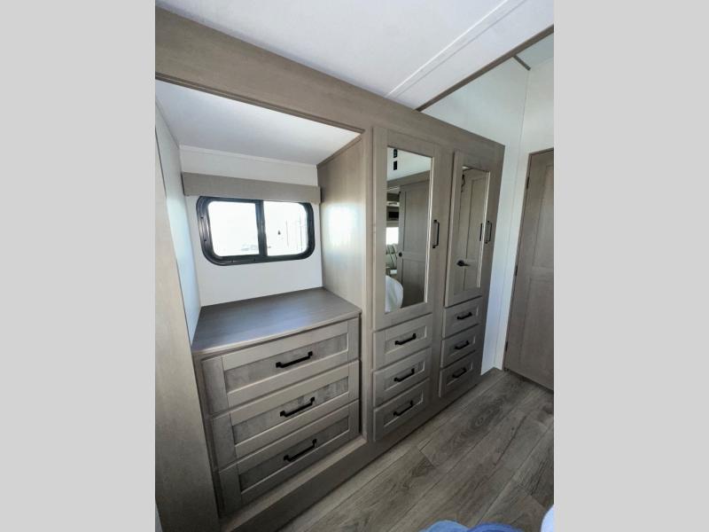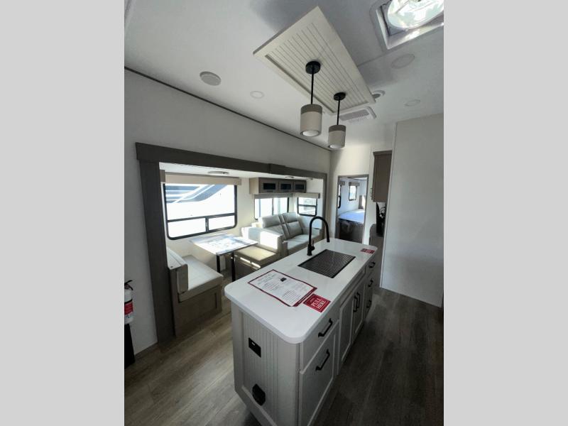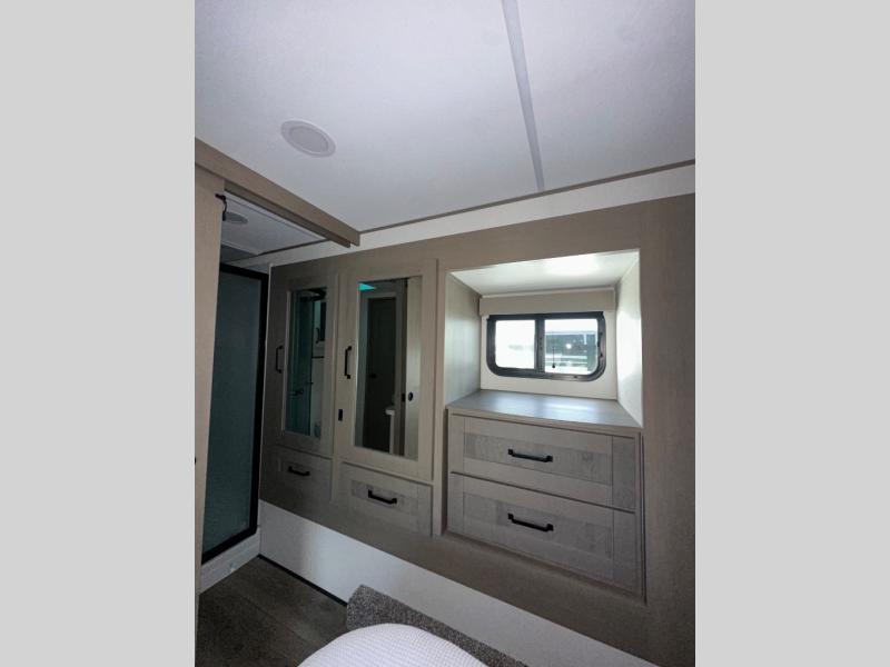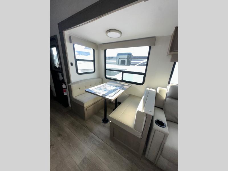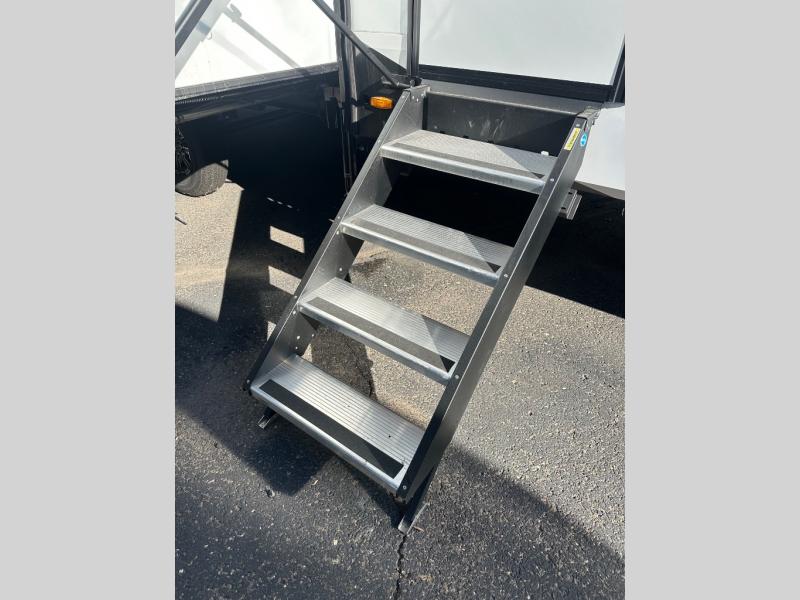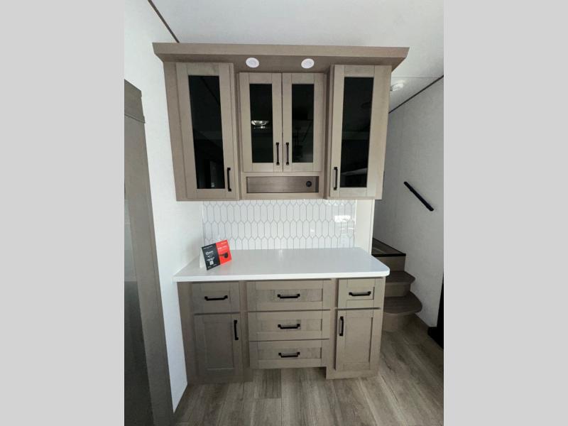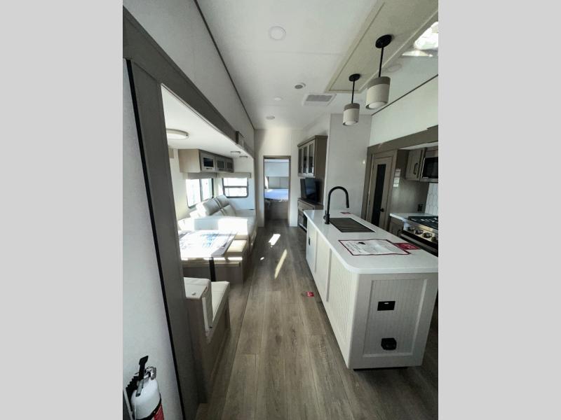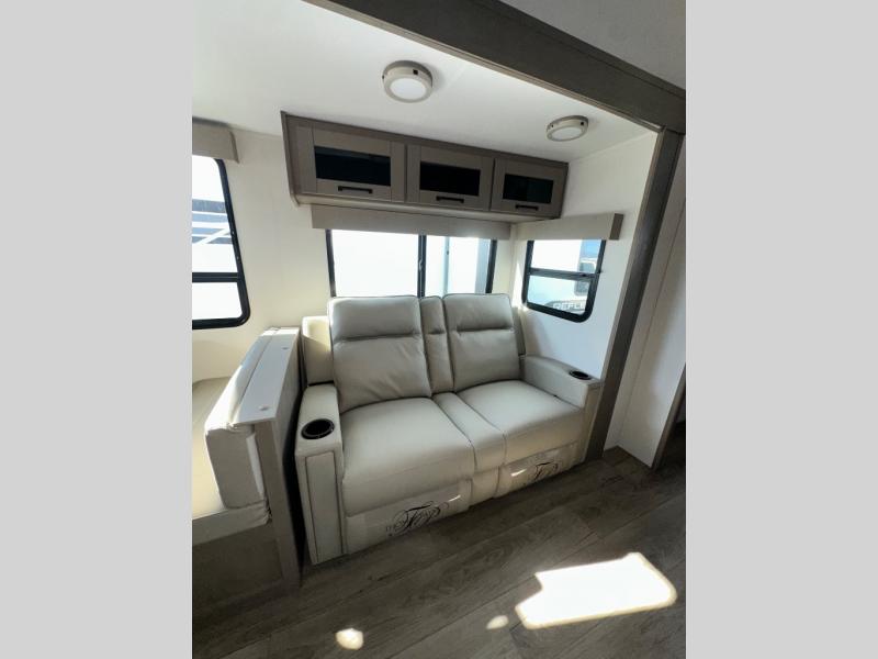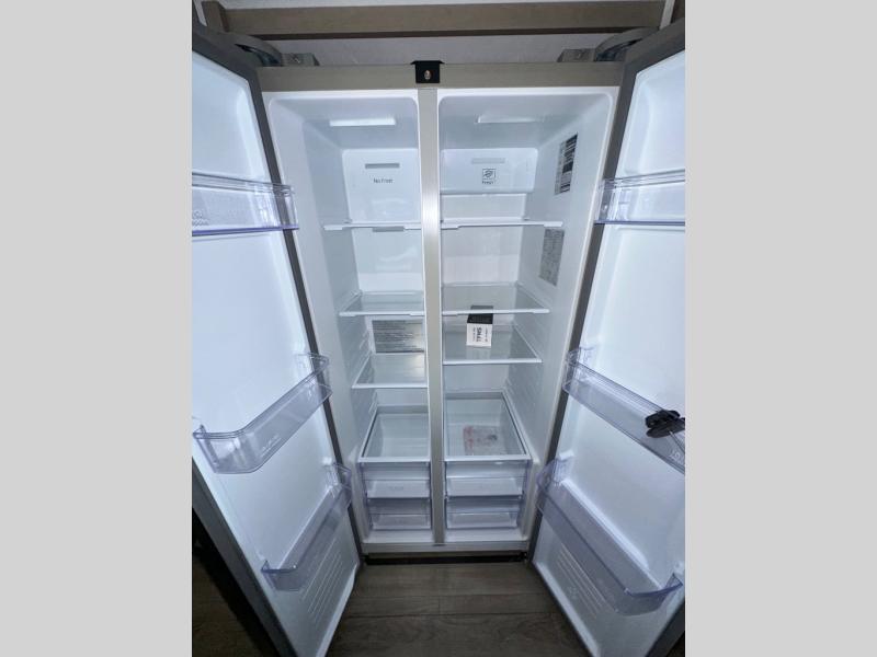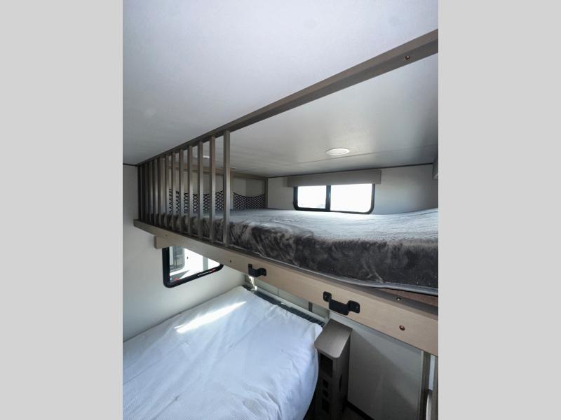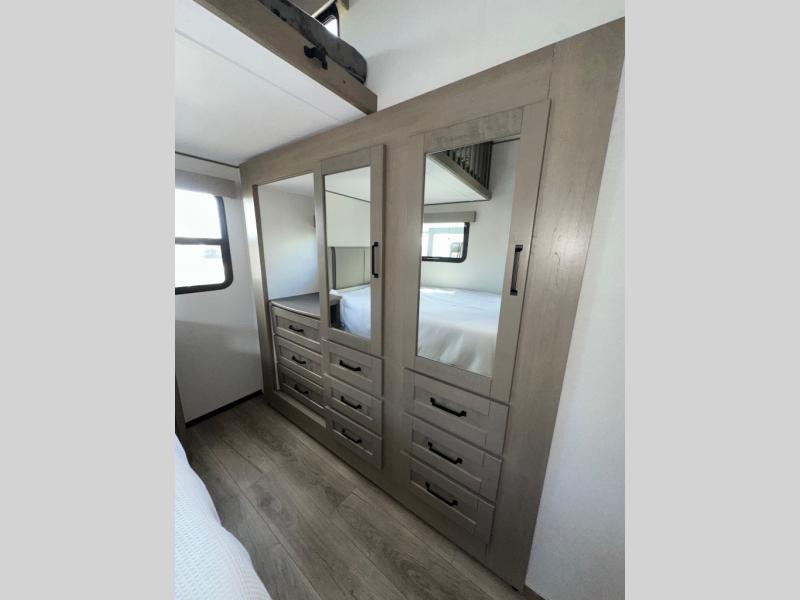 There is a whole lot to love about this fifth wheel! The front private bedroom has a queen bed to lay your head on at night, a slide with drawers and a linen closet, and even an entrance into the dual entry bathroom. The second private bedroom has a 54" x 74" top bed above a queen bed, a slide with a closet and drawers, and its very own half bathroom. The chef will have an easy time preparing delicious home cooked meals with the kitchen island, plus there is an outside kitchen complete with a 4.1 cu. ft. refrigerator to enjoy a cold beverage while you grill on the griddle. Enjoy a relaxing evening indoors either playing games at the booth dinette or on the theater seating across from the entertainment center with a fireplace and 40" TV. You could even switch out the seating for an optional tri-fold sofa or the dinette for an optional swivel dinette!