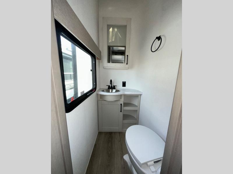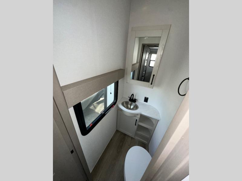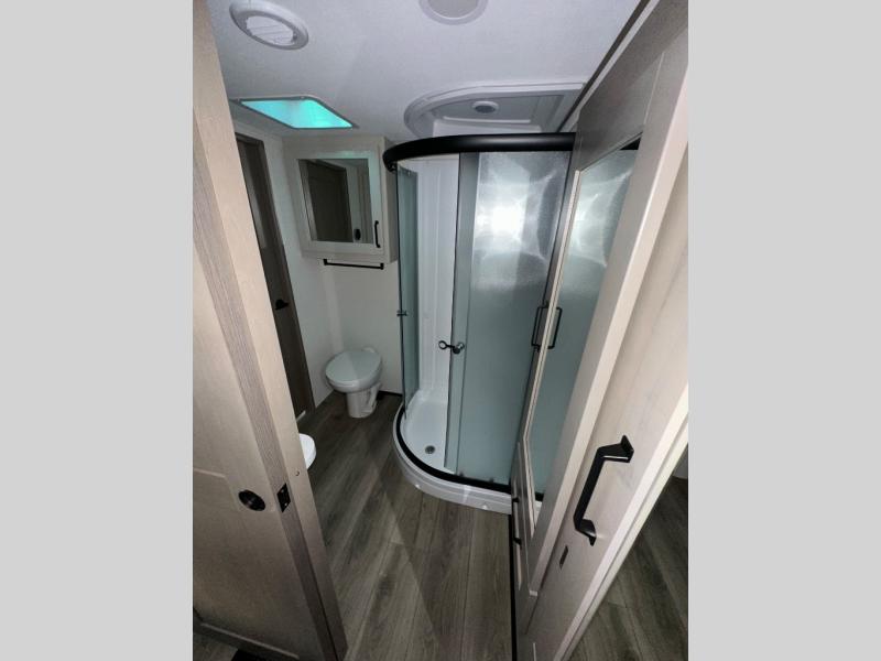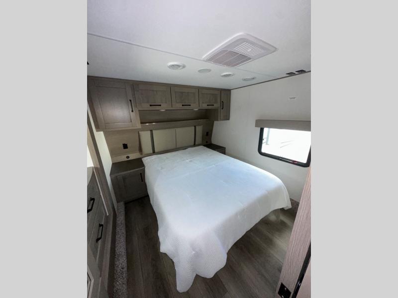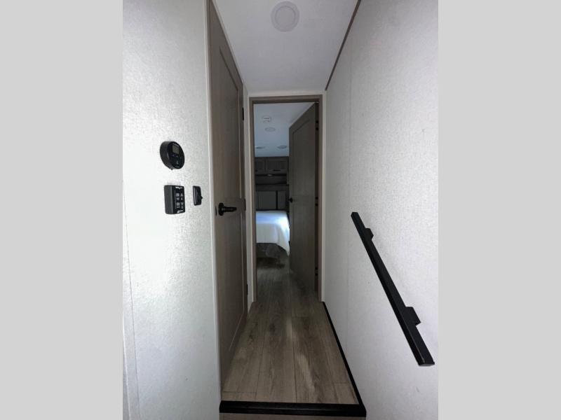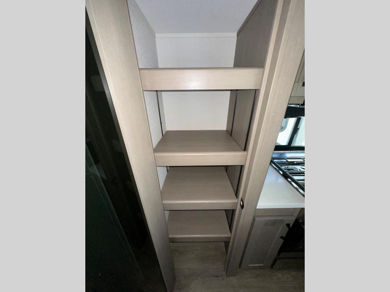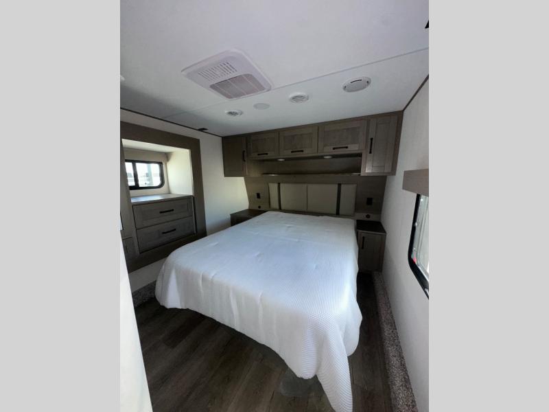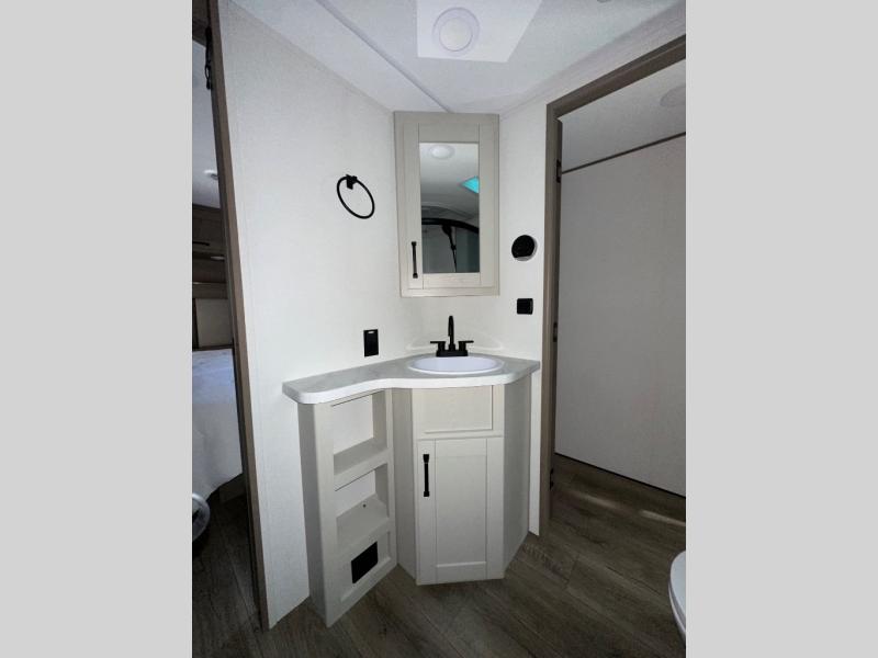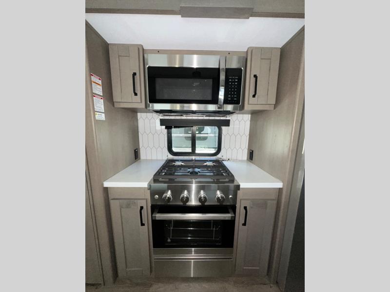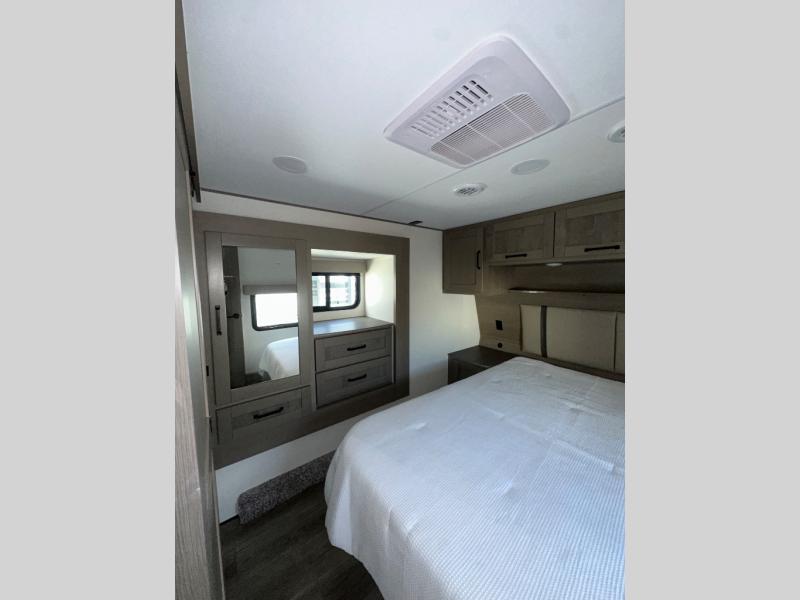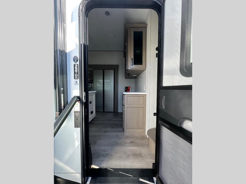 There is a whole lot to love about this fifth wheel! The front private bedroom has a queen bed to lay your head on at night, a slide with drawers and a linen closet, and even an entrance into the dual entry bathroom. The second private bedroom has a 54" x 74" top bed above a queen bed, a slide with a closet and drawers, and its very own half bathroom. The chef will have an easy time preparing delicious home cooked meals with the kitchen island, plus there is an outside kitchen complete with a 4.1 cu. ft. refrigerator to enjoy a cold beverage while you grill on the griddle. Enjoy a relaxing evening indoors either playing games at the booth dinette or on the theater seating across from the entertainment center with a fireplace and 40" TV. You could even switch out the seating for an optional tri-fold sofa or the dinette for an optional swivel dinette!