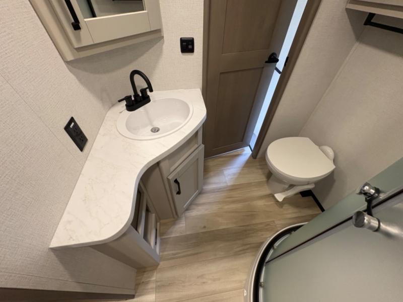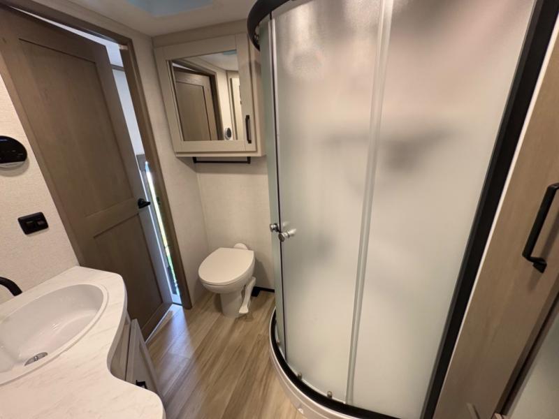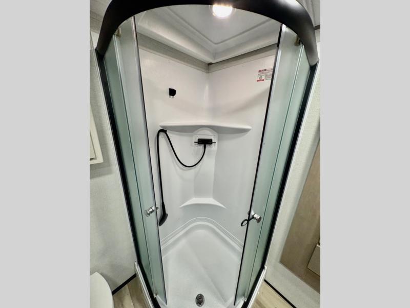 Stay off-grid longer with the factory-installed solar panel, 60-amp charge controller, and inverter prep. Inside, enjoy residential hardwood cabinetry, premium Congoleum flooring, and a spacious glass shower that elevates your camping experience from ordinary to extraordinary.