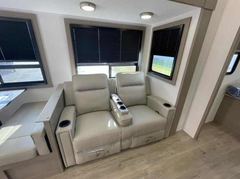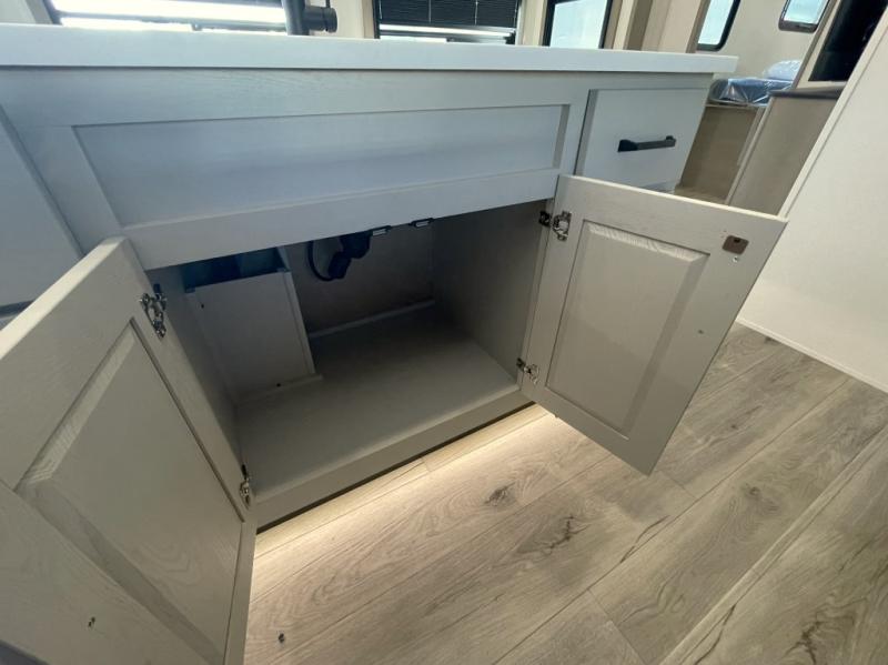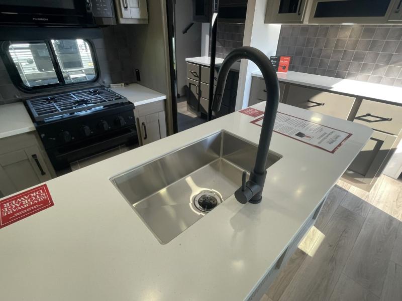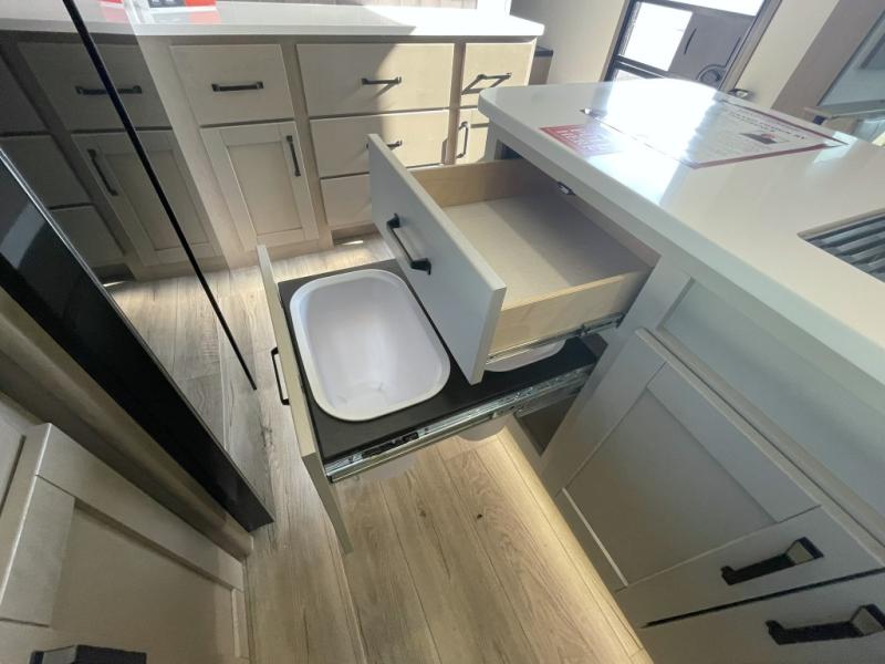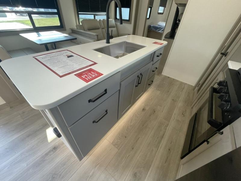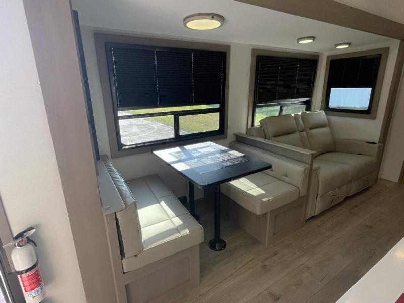 Inside the main living area, you can unwind on plush theater seats, enjoy a movie night by the fireplace, or gather around the booth dinette for dinner or game night. The kitchen is built to handle it all with solid surface countertops, a deep stainless steel sink, a large pantry, and high-end appliances.
