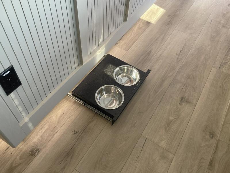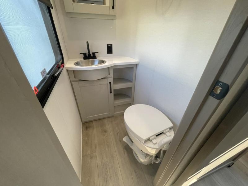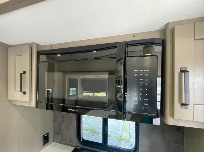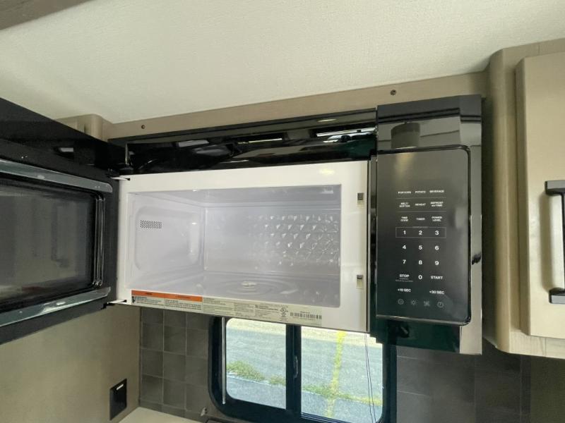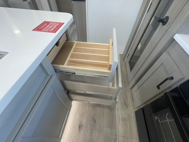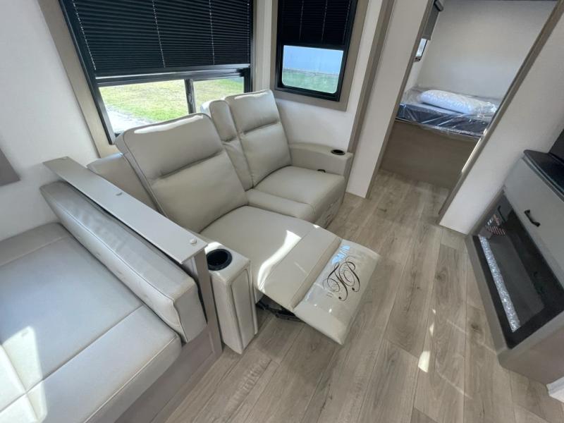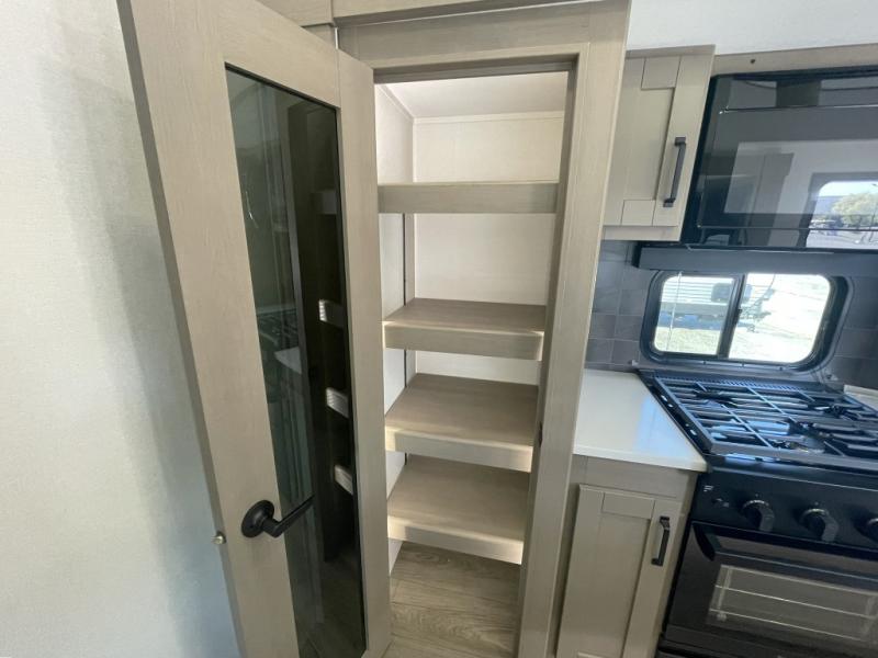 Inside the main living area, you can unwind on plush theater seats, enjoy a movie night by the fireplace, or gather around the booth dinette for dinner or game night. The kitchen is built to handle it all with solid surface countertops, a deep stainless steel sink, a large pantry, and high-end appliances.