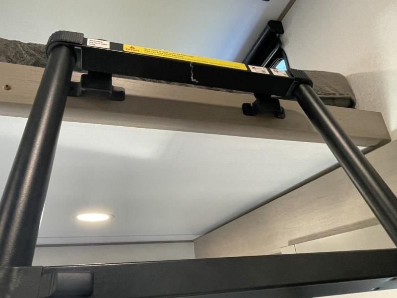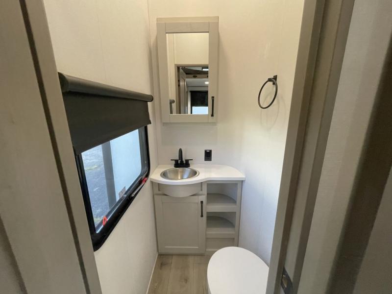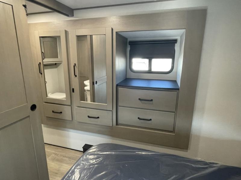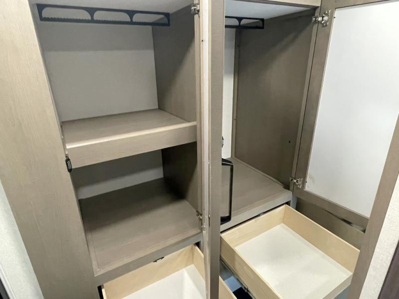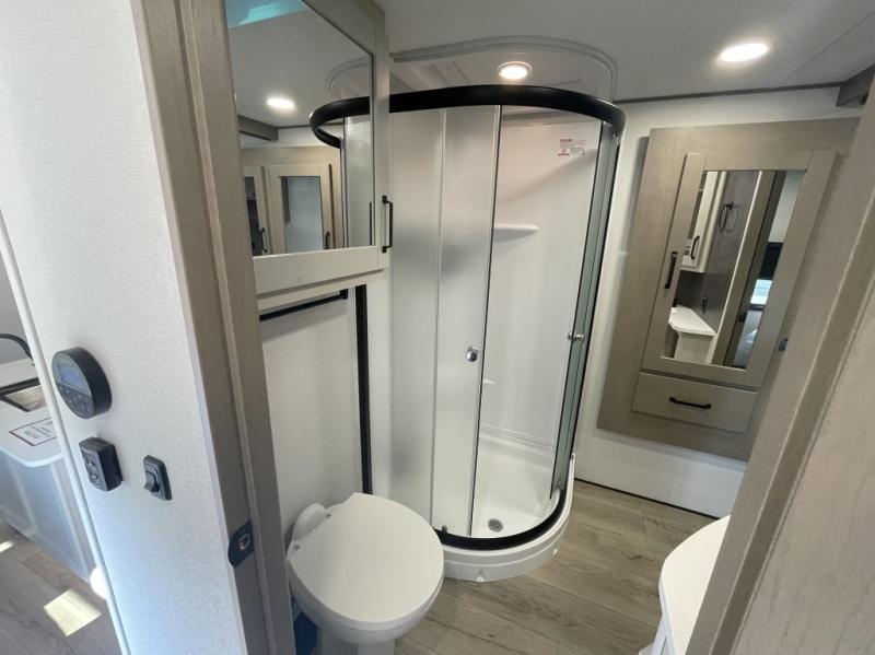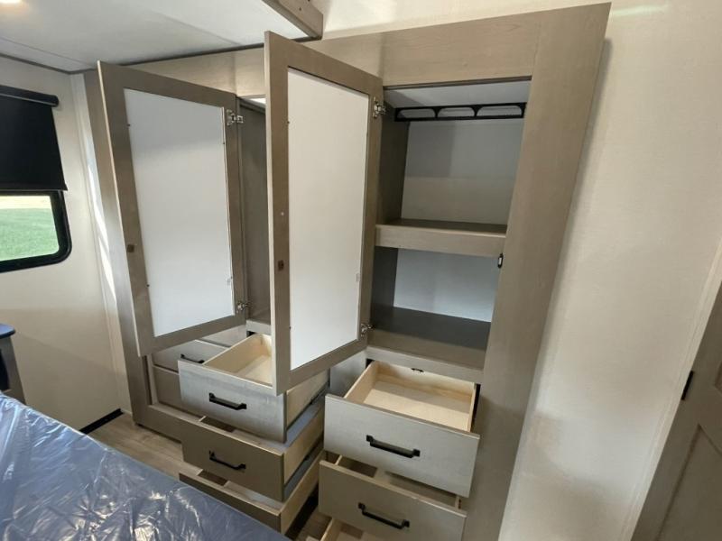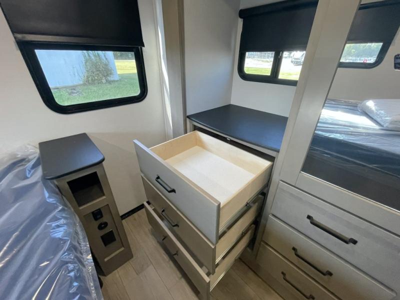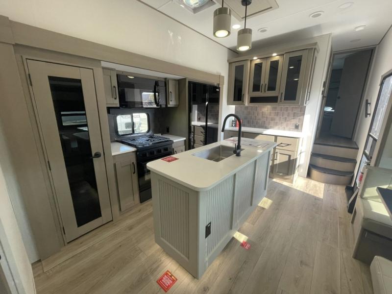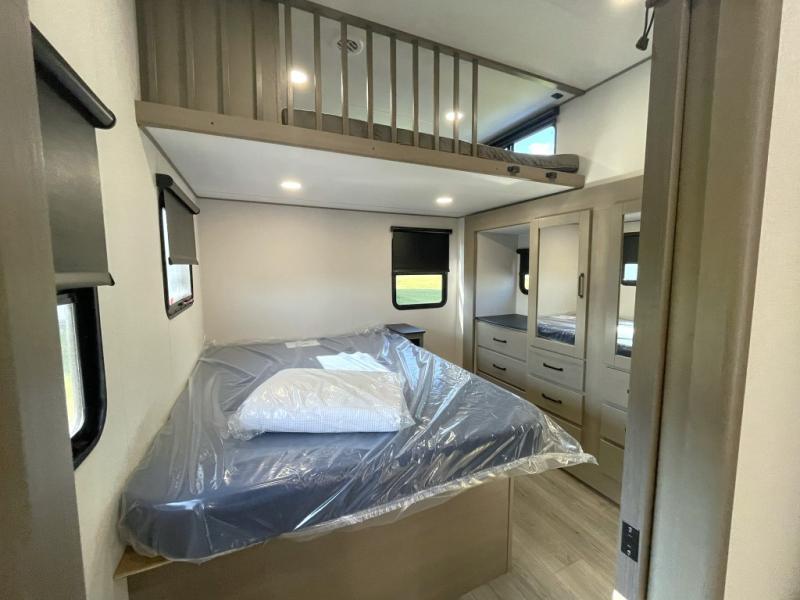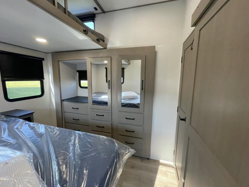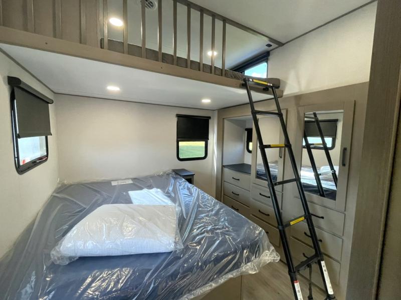 This is the ideal fifth wheel for families or groups who need extra space without sacrificing style. The front bedroom features a walk-around queen bed, a large slide for clothes storage, and direct access to the main full bathroom. In the rear bedroom, you will find a unique double-bed setup with a 54 by 74 inch upper bunk over a queen bed, plus its own half bathroom—perfect for kids, teens, or overnight guests.