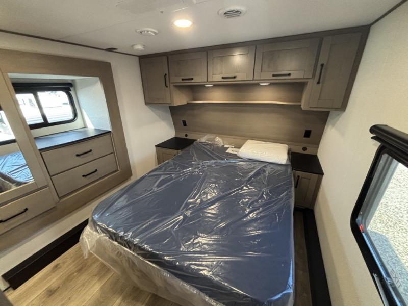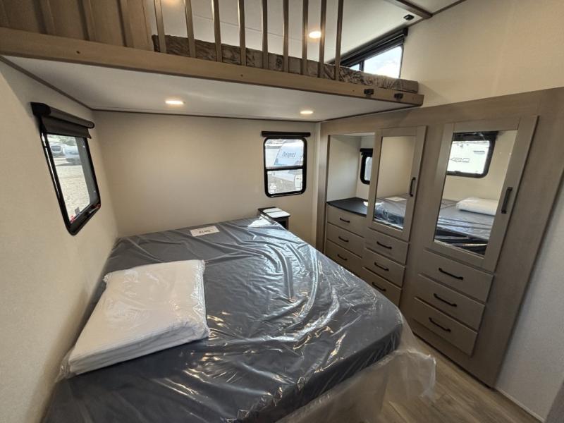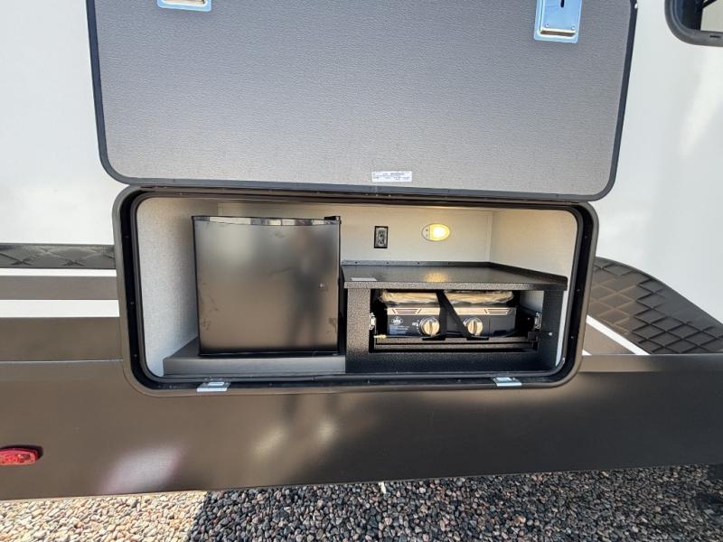 There is a whole lot to love about this fifth wheel! The front private bedroom has a queen bed to lay your head on at night, a slide with drawers and a linen closet, and even an entrance into the dual entry bathroom. The second private bedroom has a 54" x 74" top bed above a queen bed, a slide with a closet and drawers, and its very own half bathroom. The chef will have an easy time preparing delicious home cooked meals with the kitchen island, plus there is an outside kitchen complete with a 4.1 cu. ft. refrigerator to enjoy a cold beverage while you grill on the griddle. Enjoy a relaxing evening indoors either playing games at the booth dinette or on the theater seating across from the entertainment center with a fireplace and 40" TV. You could even switch out the seating for an optional tri-fold sofa or the dinette for an optional swivel dinette!