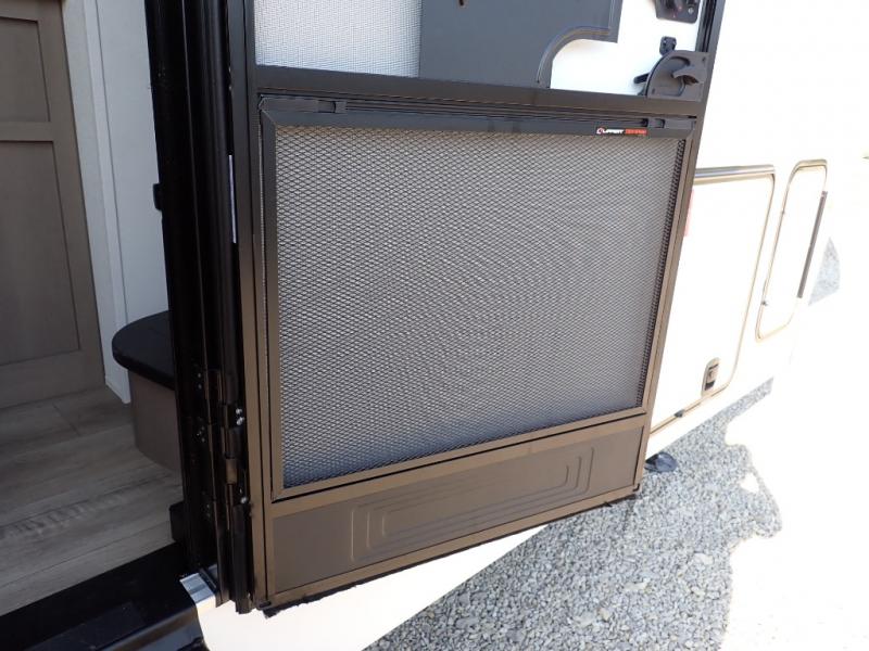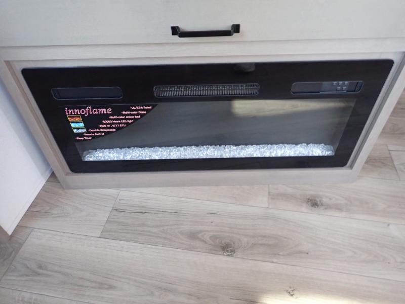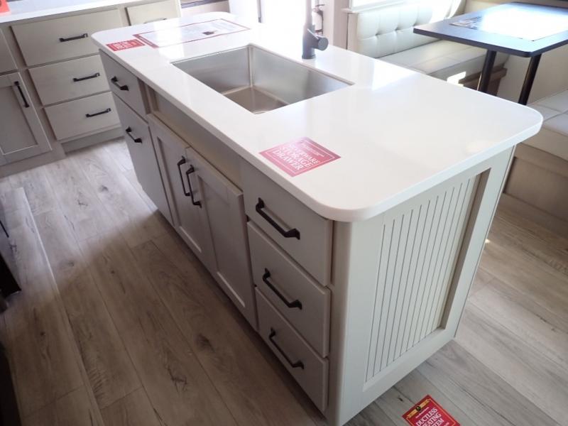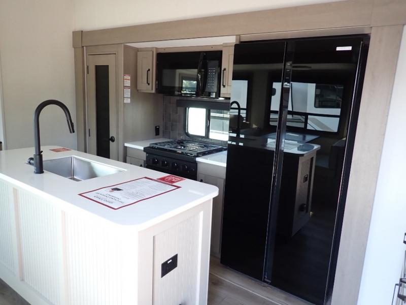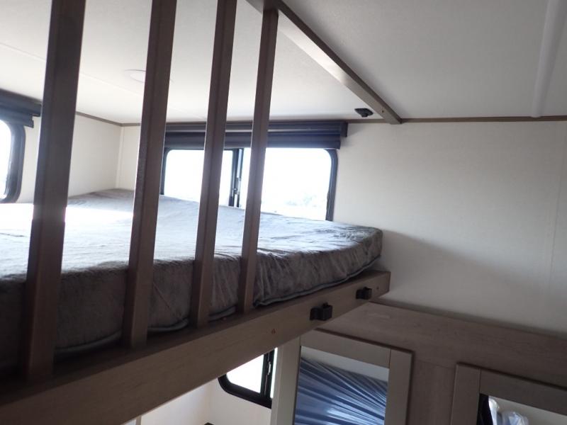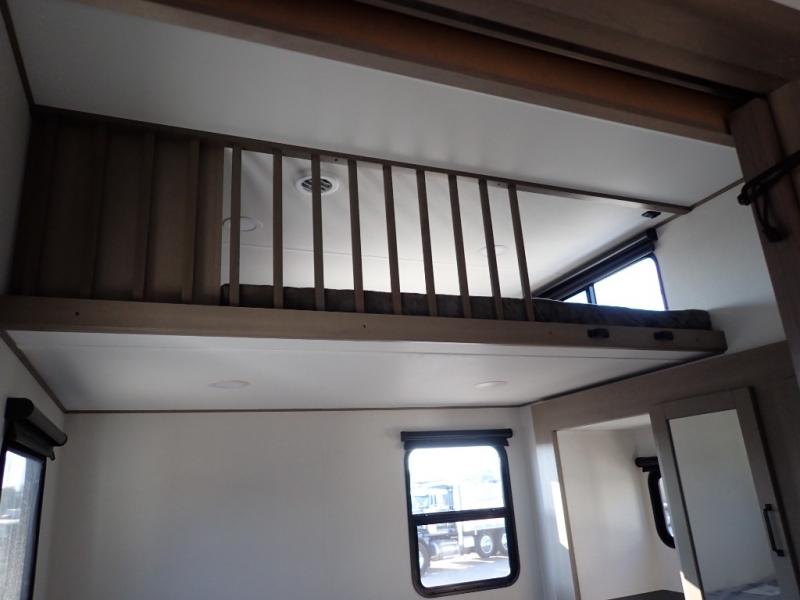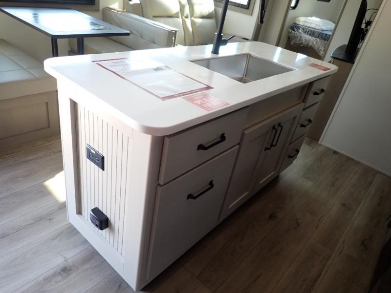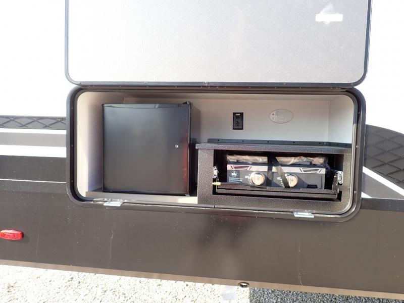 There is a whole lot to love about this fifth wheel! The front private bedroom has a queen bed to lay your head on at night, a slide with drawers and a linen closet, and even an entrance into the dual entry bathroom. The second private bedroom has a 54" x 74" top bed above a queen bed, a slide with a closet and drawers, and its very own half bathroom. The chef will have an easy time preparing delicious home cooked meals with the kitchen island, plus there is an outside kitchen complete with a 4.1 cu. ft. refrigerator to enjoy a cold beverage while you grill on the griddle. Enjoy a relaxing evening indoors either playing games at the booth dinette or on the theater seating across from the entertainment center with a fireplace and 40" TV. You could even switch out the seating for an optional tri-fold sofa or the dinette for an optional swivel dinette!