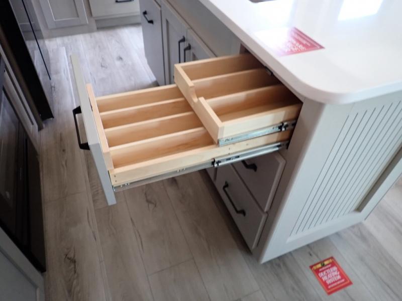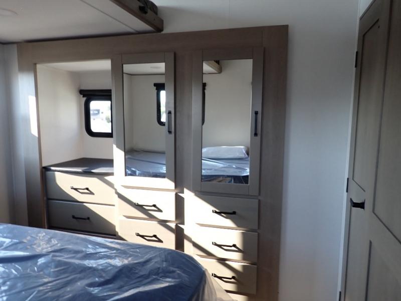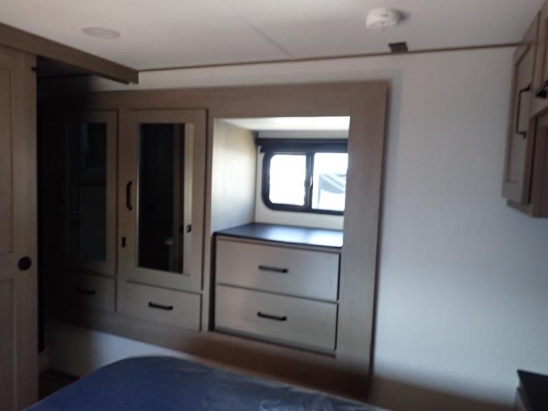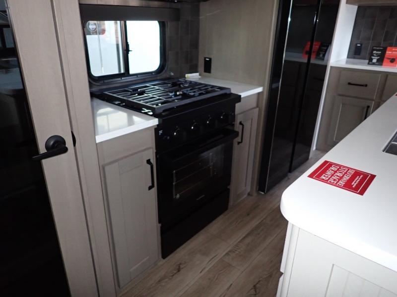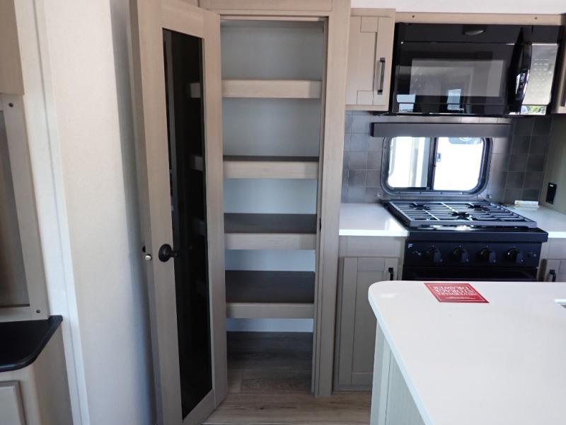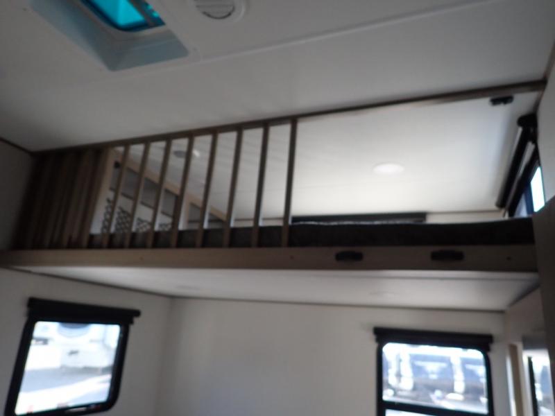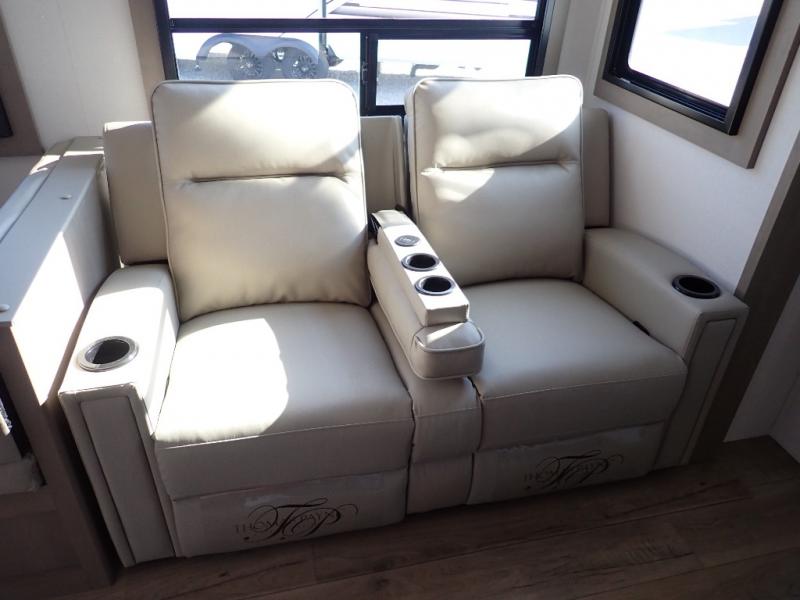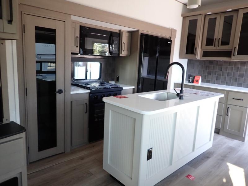 There is a whole lot to love about this fifth wheel! The front private bedroom has a queen bed to lay your head on at night, a slide with drawers and a linen closet, and even an entrance into the dual entry bathroom. The second private bedroom has a 54" x 74" top bed above a queen bed, a slide with a closet and drawers, and its very own half bathroom. The chef will have an easy time preparing delicious home cooked meals with the kitchen island, plus there is an outside kitchen complete with a 4.1 cu. ft. refrigerator to enjoy a cold beverage while you grill on the griddle. Enjoy a relaxing evening indoors either playing games at the booth dinette or on the theater seating across from the entertainment center with a fireplace and 40" TV. You could even switch out the seating for an optional tri-fold sofa or the dinette for an optional swivel dinette!