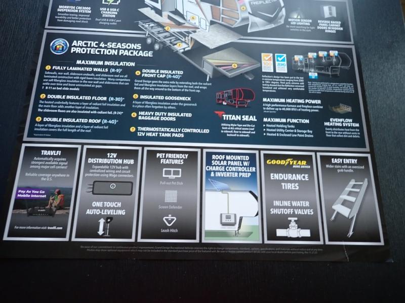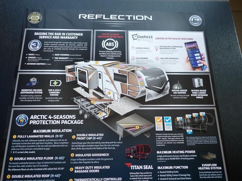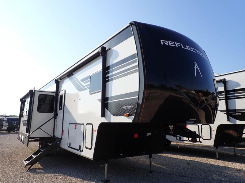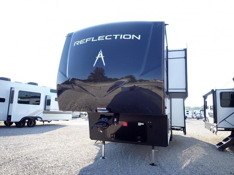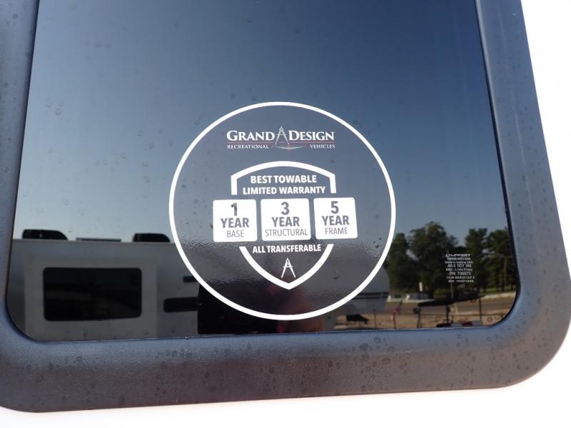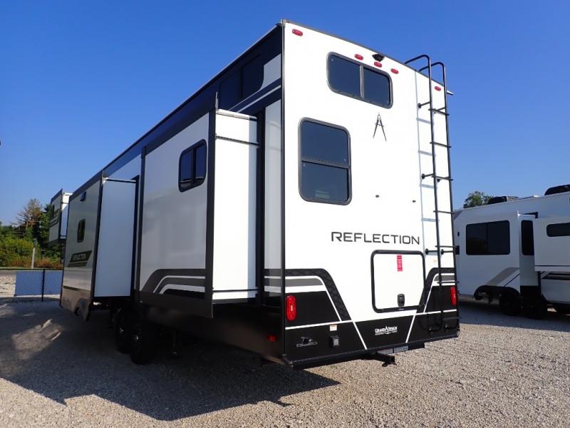 With any Reflection fifth wheel by Grand Design, you will have a solar panel for off-grid camping and a 60 amp charge controller and inverter prep, a Universal All-In-One docking station, unobstructed pass-through storage, and Goodyear Endurance tires. Each is constructed of gel coat exterior sidewalls, residential 5" truss rafters, walk-on roof decking, a fiberglass and radiant foil roof and front cap insulation plus laminated aluminum framed side walls, roof and end walls in slide rooms. Head inside to enjoy residential hardwood cabinet doors, premium Congoleum flooring, a spacious shower with a glass door, and many more comforts!