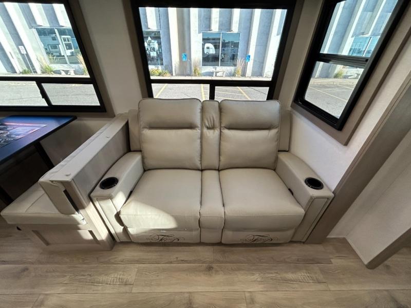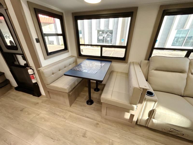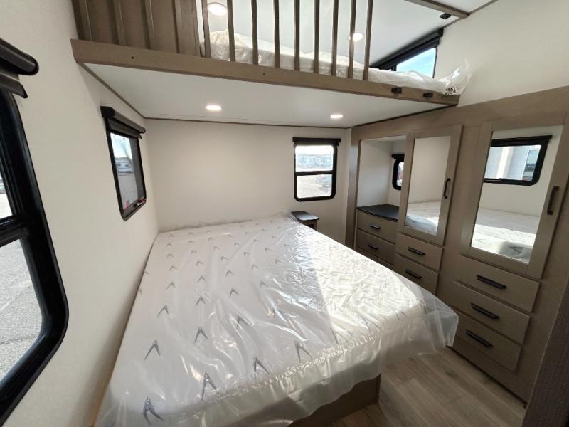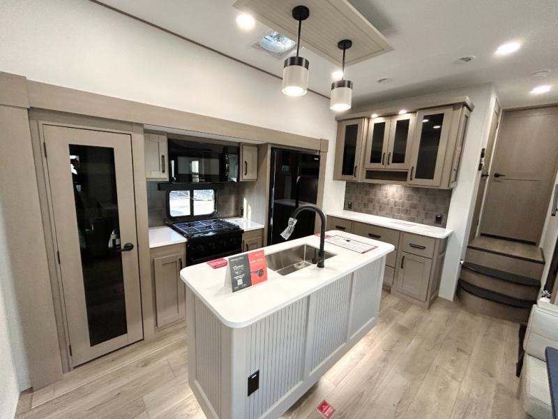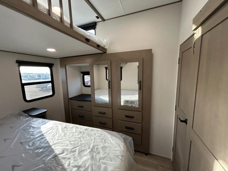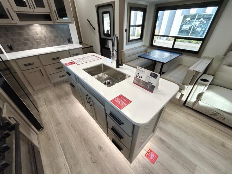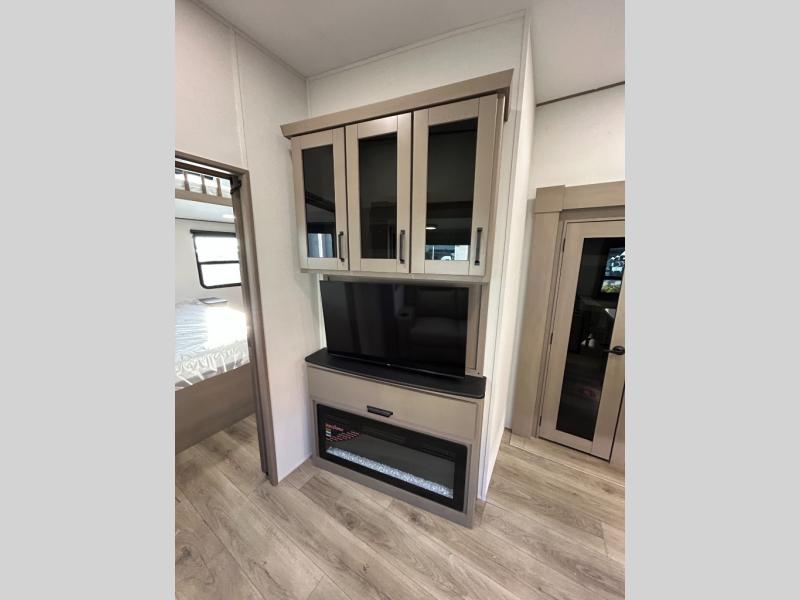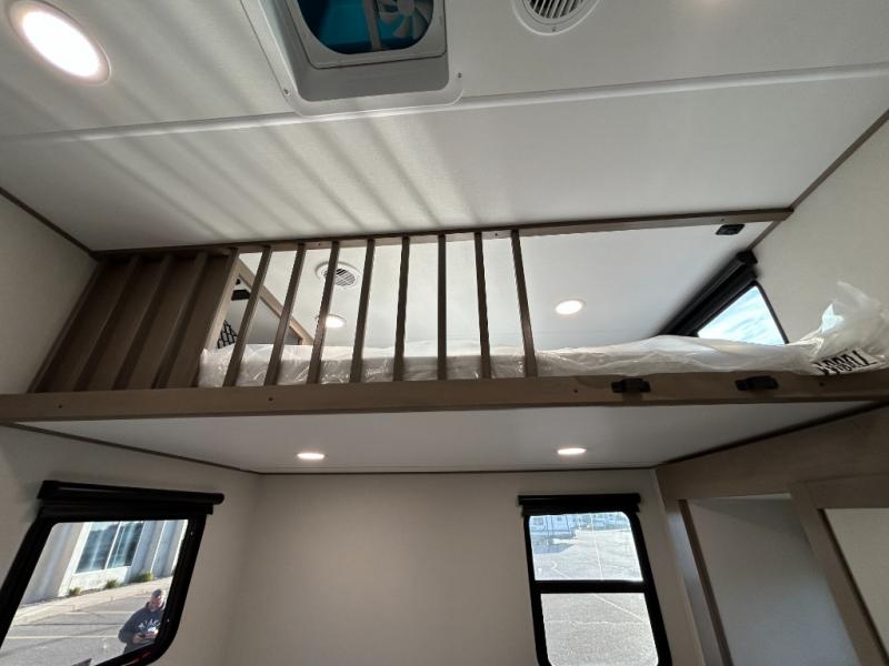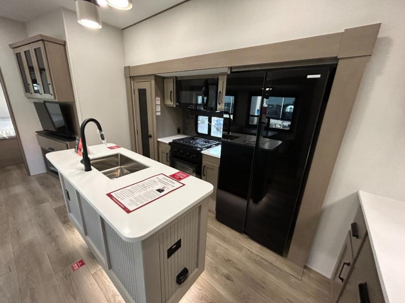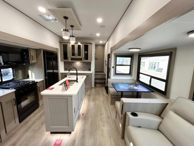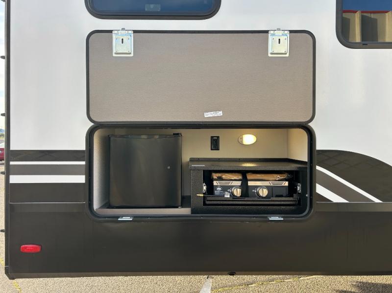 There is a whole lot to love about this fifth wheel! The front private bedroom has a queen bed to lay your head on at night, a slide with drawers and a linen closet, and even an entrance into the dual entry bathroom. The second private bedroom has a 54" x 74" top bed above a queen bed, a slide with a closet and drawers, and its very own half bathroom. The chef will have an easy time preparing delicious home cooked meals with the kitchen island, plus there is an outside kitchen complete with a 4.1 cu. ft. refrigerator to enjoy a cold beverage while you grill on the griddle. Enjoy a relaxing evening indoors either playing games at the booth dinette or on the theater seating across from the entertainment center with a fireplace and 40" TV. You could even switch out the seating for an optional tri-fold sofa or the dinette for an optional swivel dinette!