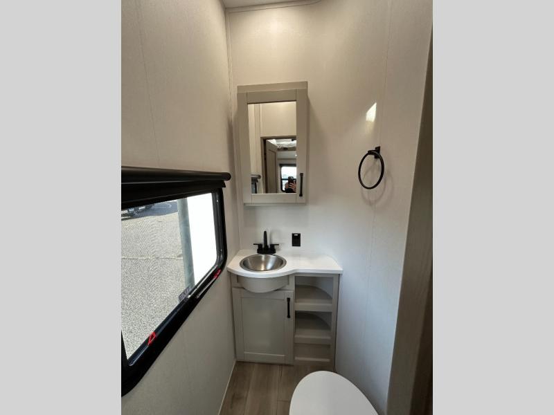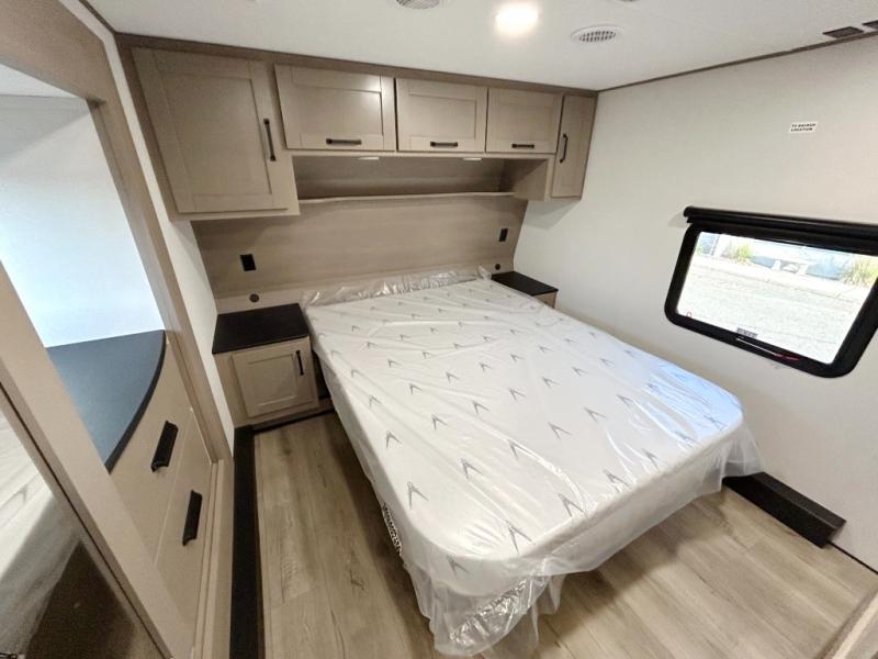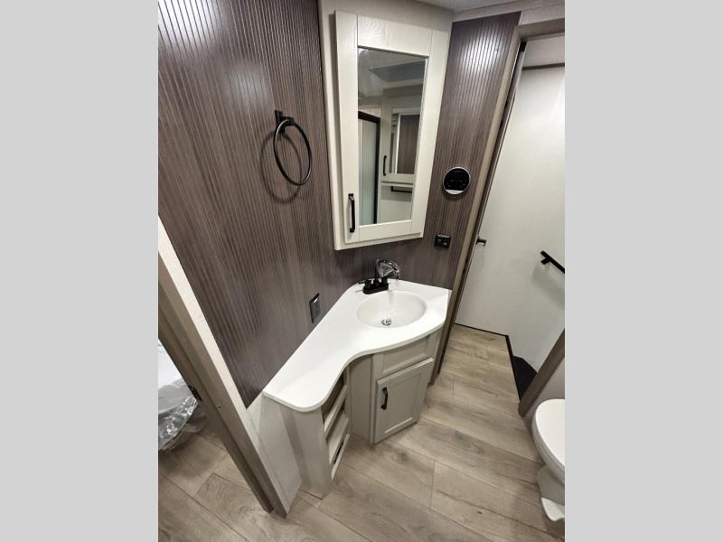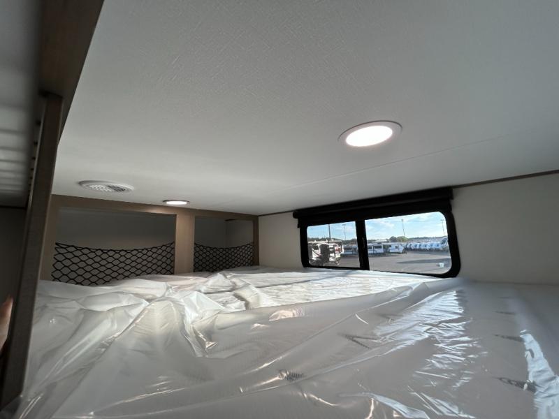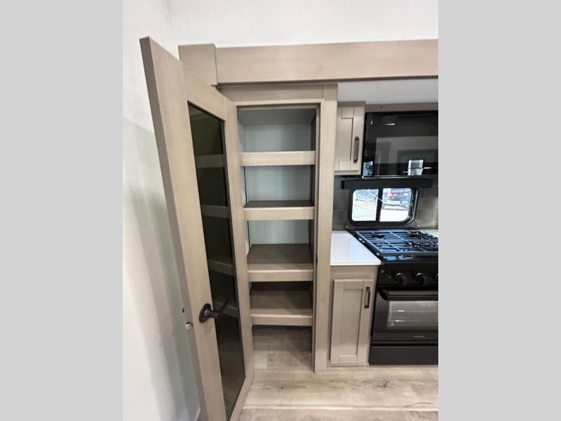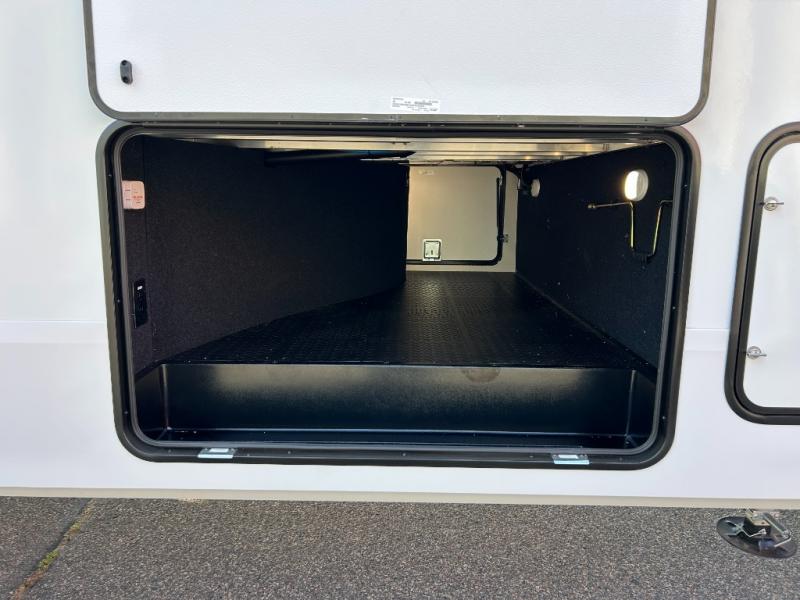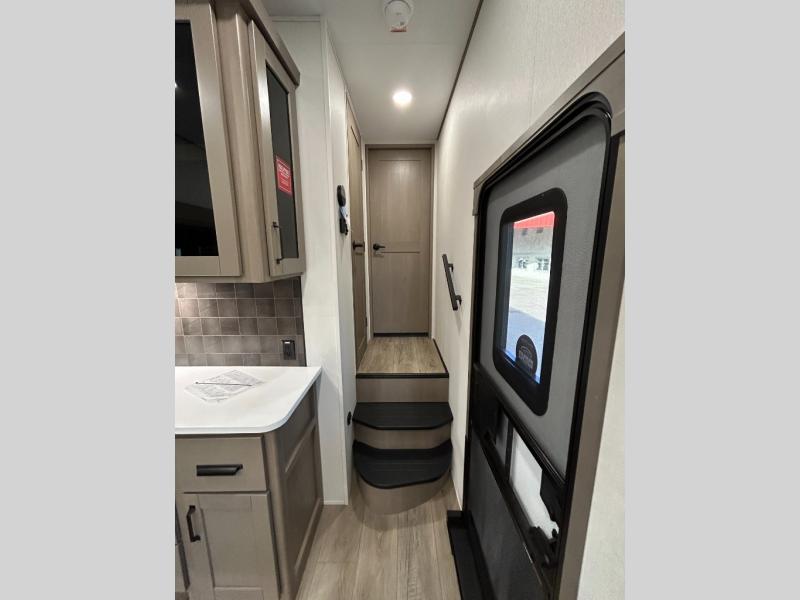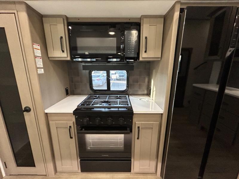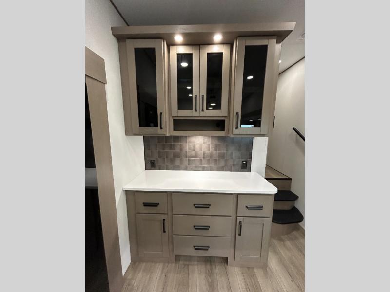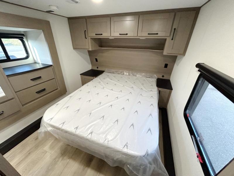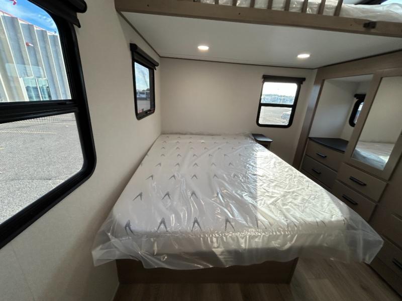 There is a whole lot to love about this fifth wheel! The front private bedroom has a queen bed to lay your head on at night, a slide with drawers and a linen closet, and even an entrance into the dual entry bathroom. The second private bedroom has a 54" x 74" top bed above a queen bed, a slide with a closet and drawers, and its very own half bathroom. The chef will have an easy time preparing delicious home cooked meals with the kitchen island, plus there is an outside kitchen complete with a 4.1 cu. ft. refrigerator to enjoy a cold beverage while you grill on the griddle. Enjoy a relaxing evening indoors either playing games at the booth dinette or on the theater seating across from the entertainment center with a fireplace and 40" TV. You could even switch out the seating for an optional tri-fold sofa or the dinette for an optional swivel dinette!