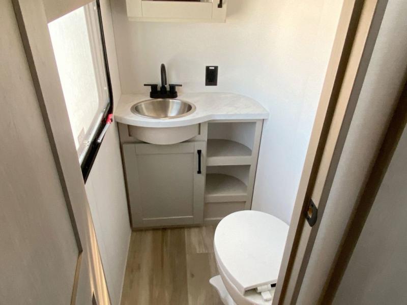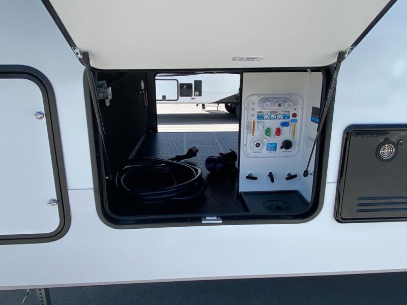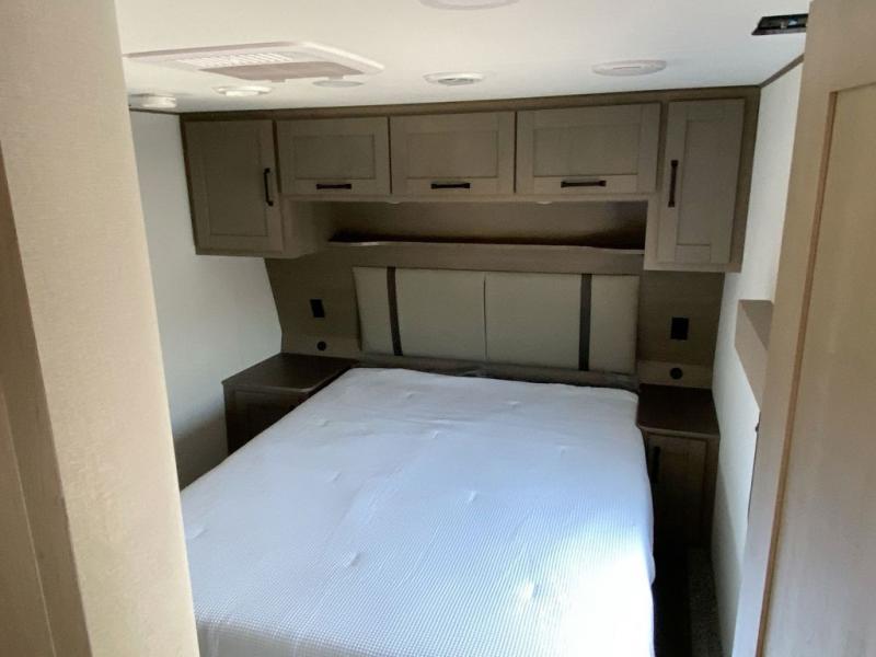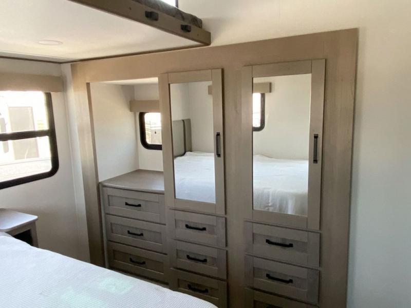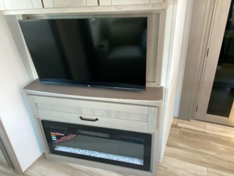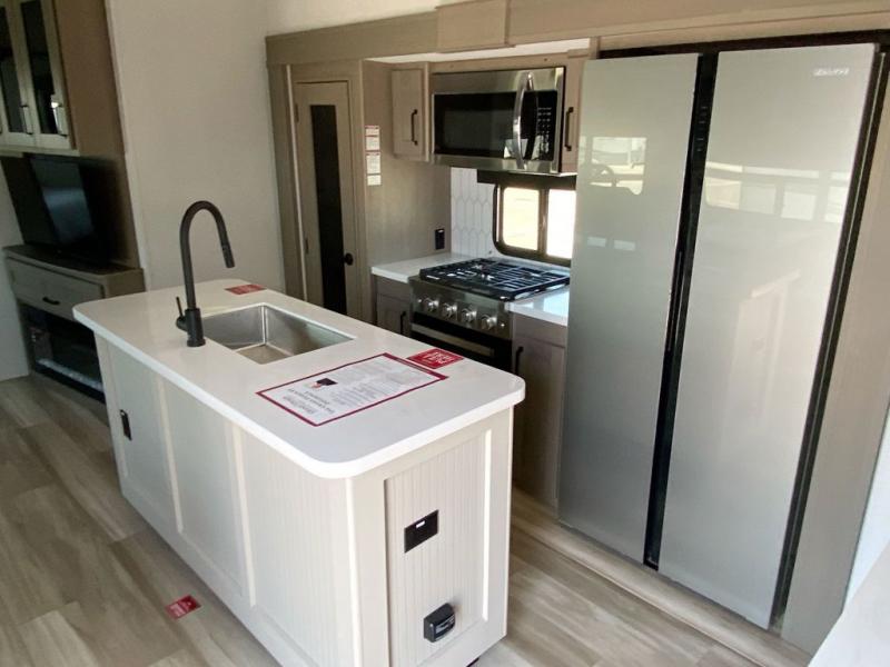 There is a whole lot to love about this fifth wheel! The front private bedroom has a queen bed to lay your head on at night, a slide with drawers and a linen closet, and even an entrance into the dual entry bathroom. The second private bedroom has a 54" x 74" top bed above a queen bed, a slide with a closet and drawers, and its very own half bathroom. The chef will have an easy time preparing delicious home cooked meals with the kitchen island, plus there is an outside kitchen complete with a 4.1 cu. ft. refrigerator to enjoy a cold beverage while you grill on the griddle. Enjoy a relaxing evening indoors either playing games at the booth dinette or on the theater seating across from the entertainment center with a fireplace and 40" TV. You could even switch out the seating for an optional tri-fold sofa or the dinette for an optional swivel dinette!