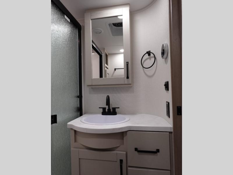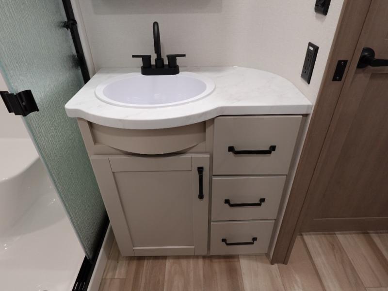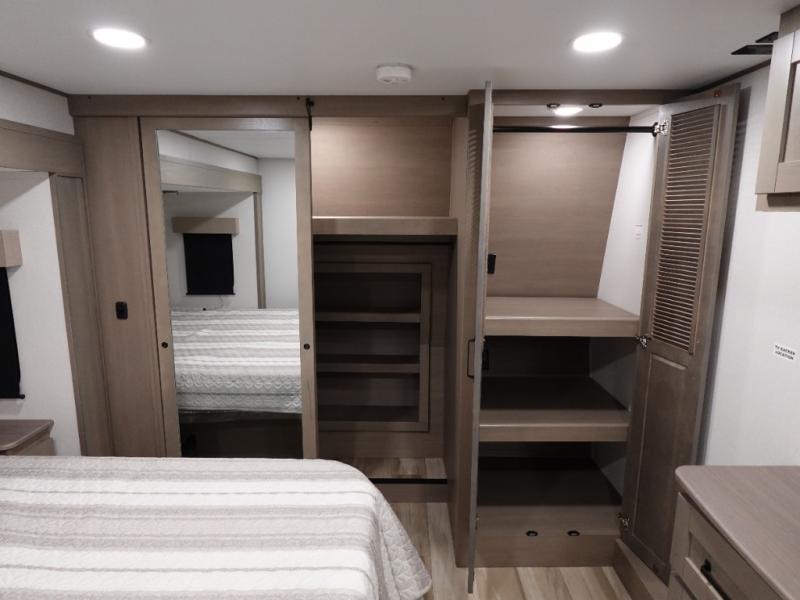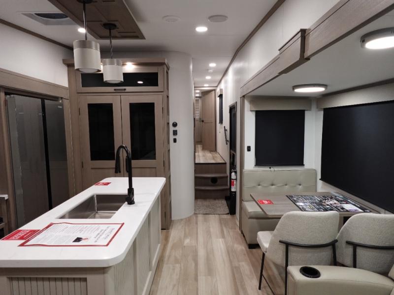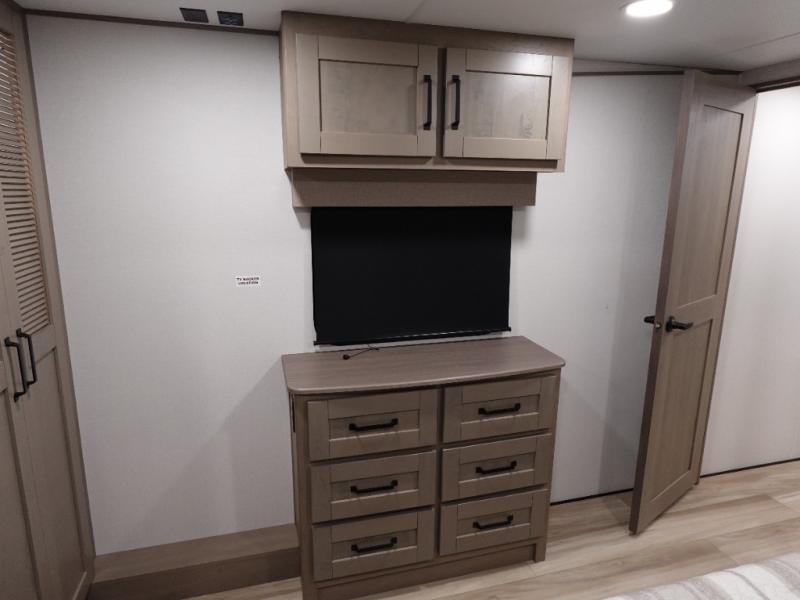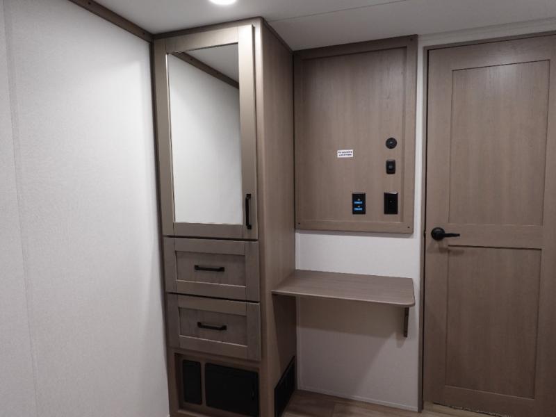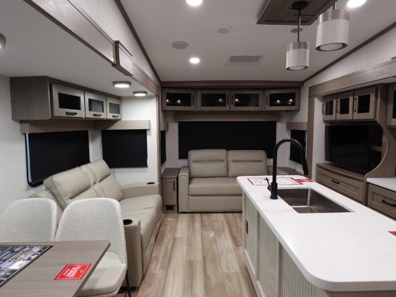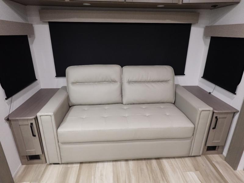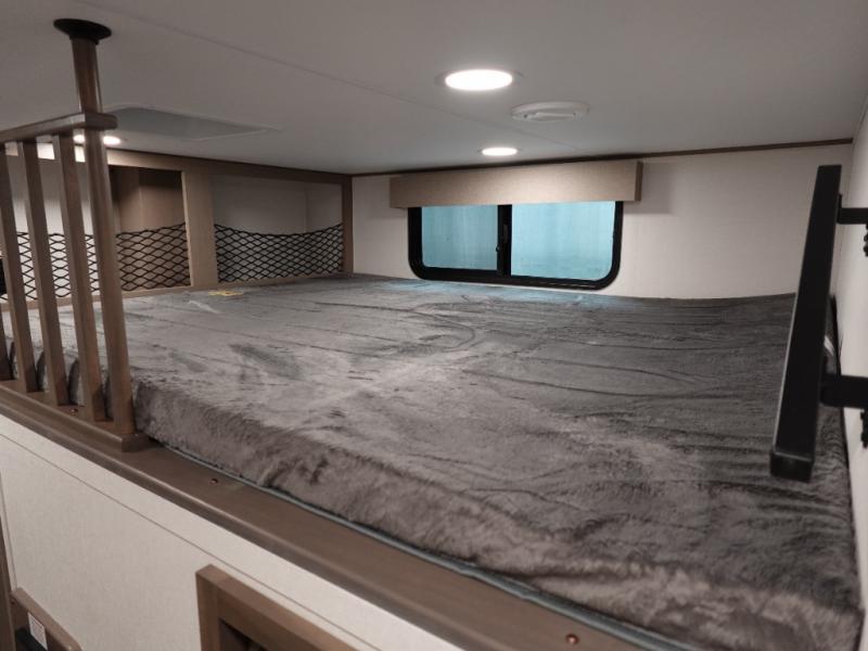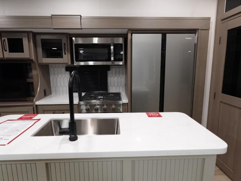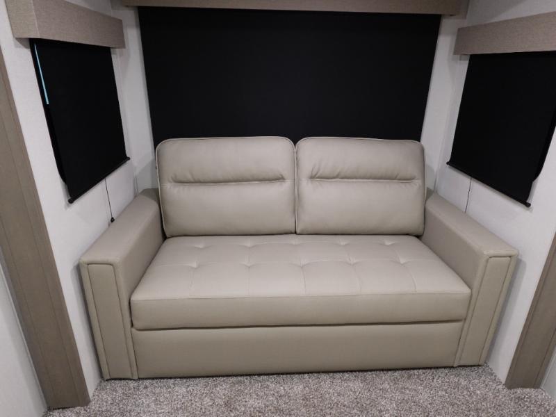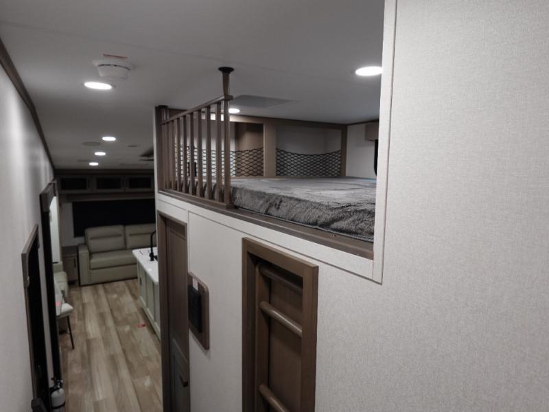 Travel to see new state parks, RV resorts or your family in other states as you tow this fifth wheel to each destination! You will enjoy comfort and convenience, plus a place to work, and be able to offer extra sleeping space for friends and family when they visit. The middle extra room provides a tri-fold sofa slide, a desk, a wardrobe, plus a 64" x 88" upper bed loft area with access from the hallway. The full bathroom will keep everyone refreshed, and the front bedroom allows you to sleep on a bed slide. And the kitchen island, appliances, and large pantry allow you to take everything you need with you.