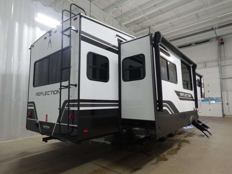 With any Reflection fifth wheel by Grand Design, you will have a solar panel for off-grid camping and a 60 amp charge controller and inverter prep, a Universal All-In-One docking station, unobstructed pass-through storage, and Goodyear Endurance tires. Each is constructed of gel coat exterior sidewalls, residential 5" truss rafters, walk-on roof decking, a fiberglass and radiant foil roof and front cap insulation plus laminated aluminum framed side walls, roof and end walls in slide rooms. Head inside to enjoy residential hardwood cabinet doors, premium Congoleum flooring, a spacious shower with a glass door, and many more comforts!
