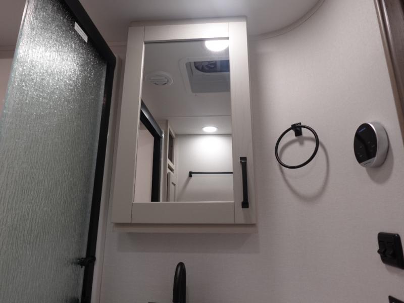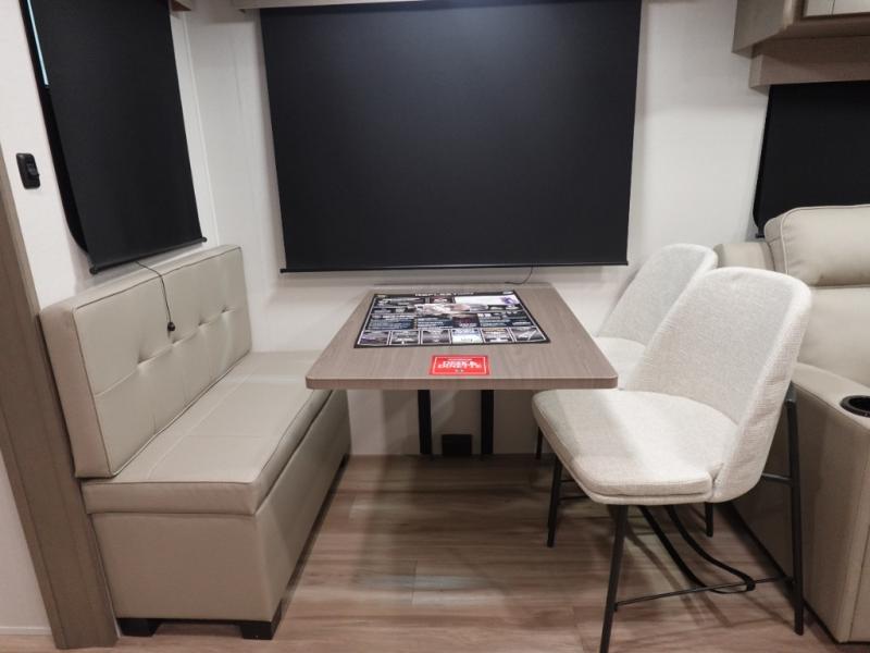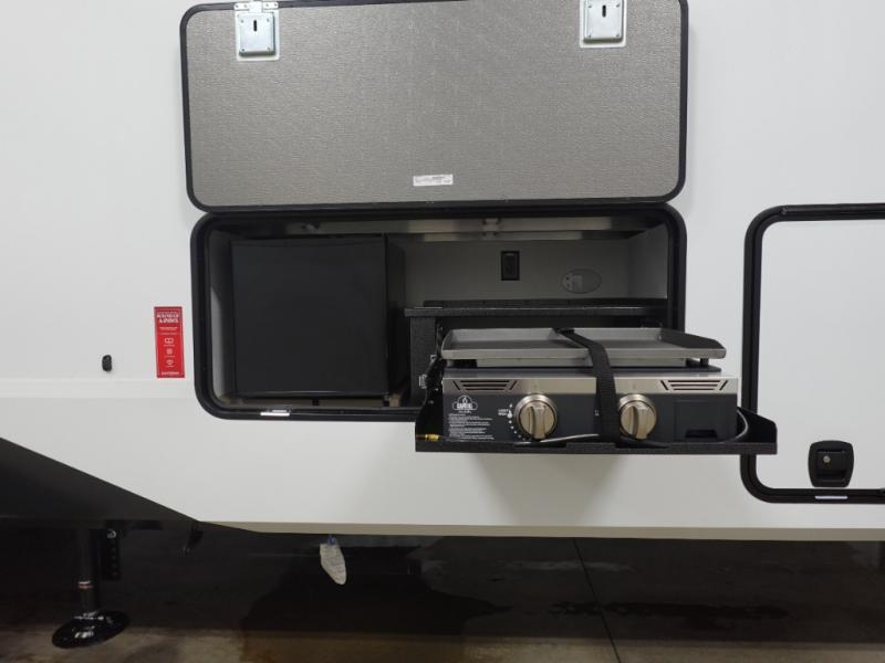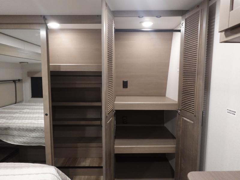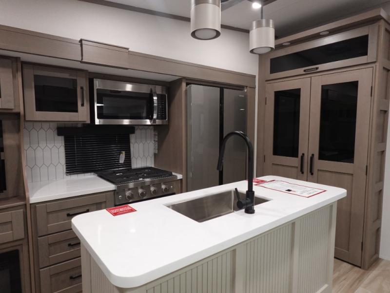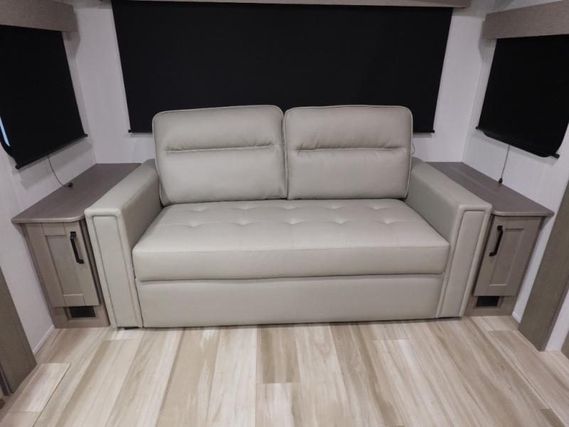 Travel to see new state parks, RV resorts or your family in other states as you tow this fifth wheel to each destination! You will enjoy comfort and convenience, plus a place to work, and be able to offer extra sleeping space for friends and family when they visit. The middle extra room provides a tri-fold sofa slide, a desk, a wardrobe, plus a 64" x 88" upper bed loft area with access from the hallway. The full bathroom will keep everyone refreshed. And you will love the front wardrobe, the dresser, and the option to add a washer/dryer. The main living and kitchen area provides plenty of seating from the rear tri-fold sofa, dinette, and the theater seats with cupholders. And the kitchen island, appliances, and large pantry allow you to take everything you need with you.